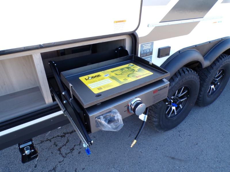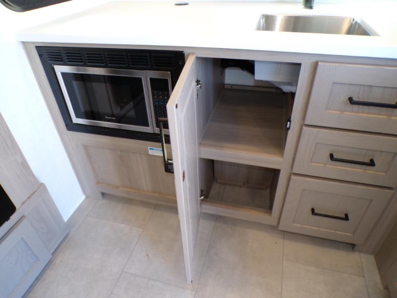 The chef will love cooking in the front kitchen of this travel trailer! It offers plenty of countertop space to meal prep and all of the essentials to cook delicious meals, plus there is even an outside kitchen with a refrigerator, a pull-out stove, and a griddle to fry what you caught that day. Enjoy all of your meals at the 72" sofa slide with a table or pull up a table and chairs under the 15' power awning. The queen bed offers a comfortable place for you to rest up each night and it even has a 26" x 80" flip-up bunk above it for a guest or two to tag along. Store all of your camping essentials in the exterior storage.