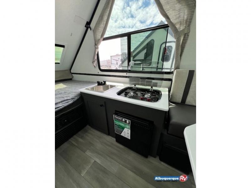 What a treat it will be to spend a weekend in this Flagstaff Hard Side A-frame! You will be able to create some more interior living space by repositioning the flip-up bed after you wake up, and the booth dinette can also maneuver out of a bed and back into a dining space easily. There is also a two burner range that can be used to fry up a hearty batch of pancakes without even starting a fire.
