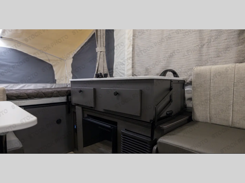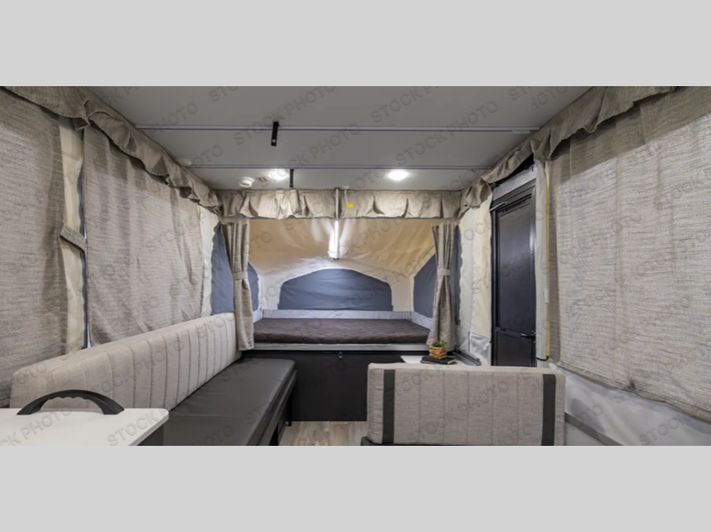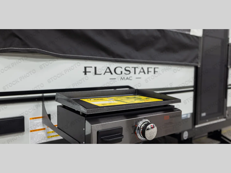 This Flagstaff MAC Series folding pop-up camper is going to entice you to take many more vacations! There are interior cabinets for storing your essentials, and you can even bring more equipment by using the storage with a lid for convenience. The other convenient feature on this camper is the exterior griddle to make breakfast outdoors. Back on the inside, you can use the booth dinette as a comfortable place to play a game or eat a meal, and there are even USB charging ports within this camper so that you can charge your phones.