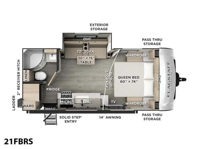 For the couple who is ready to get out and enjoy nature, this Flagstaff Micro Lite travel trailer is ideal for you! This unit has all of the basic amenities, like a rear corner bath with a radius shower, and a front RV queen bed that makes for a comfy night's rest. There is also flip-up storage under the bed to keep luggage, board games, and more! The slide out with the 72" sofa provides extra interior space so that you won't feel cramped. You'll also be able to enjoy your meals here with a table in front of the sofa. After swimming all day working up your appetite, come back to this unit and cook a meal on the three-burner cooktop! This travel trailer features a pass-through storage for your larger camping items, plus an exterior storage to hold the kids' outdoor games.