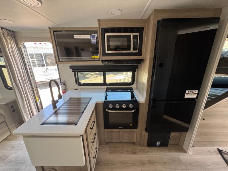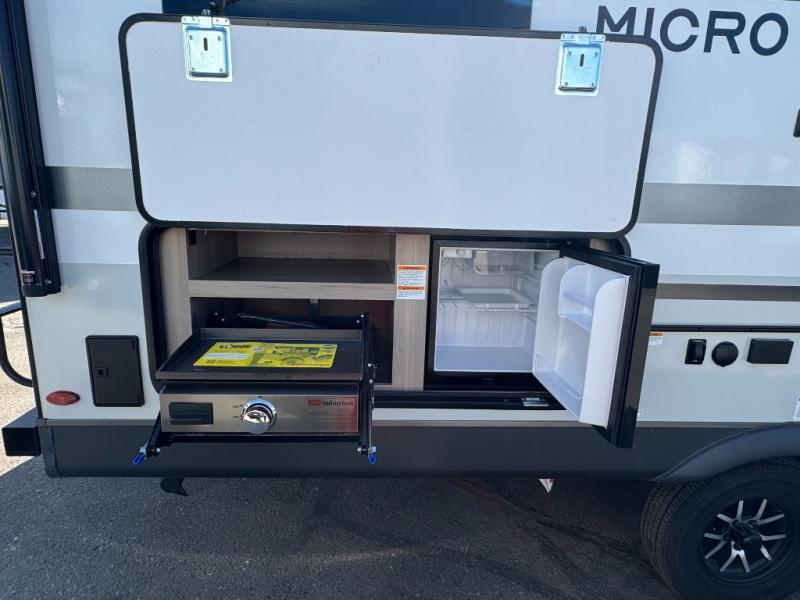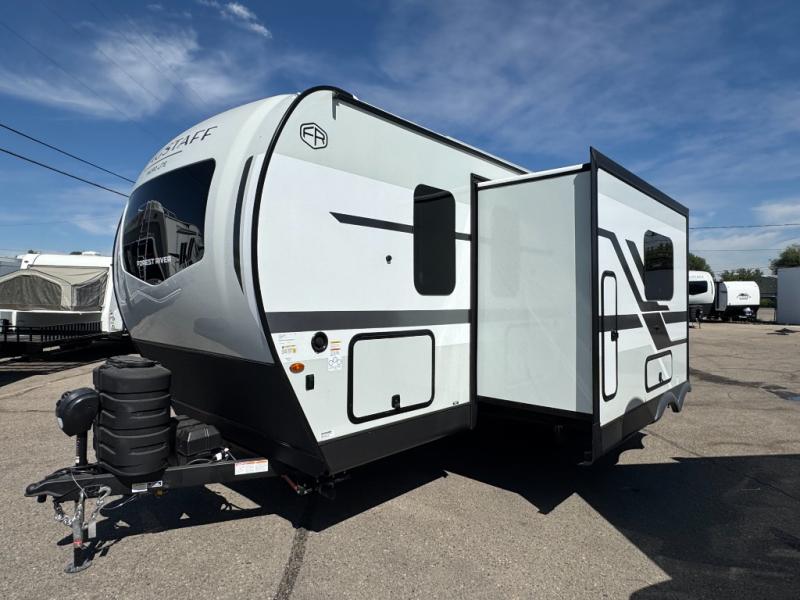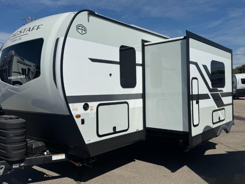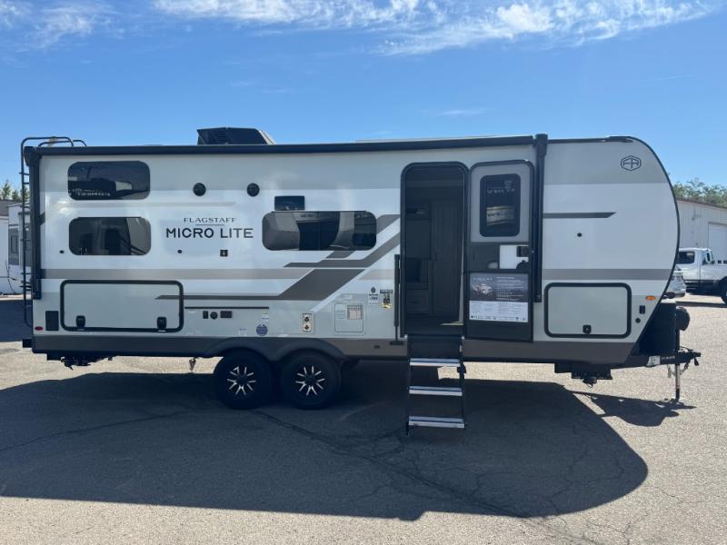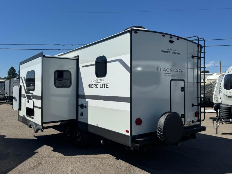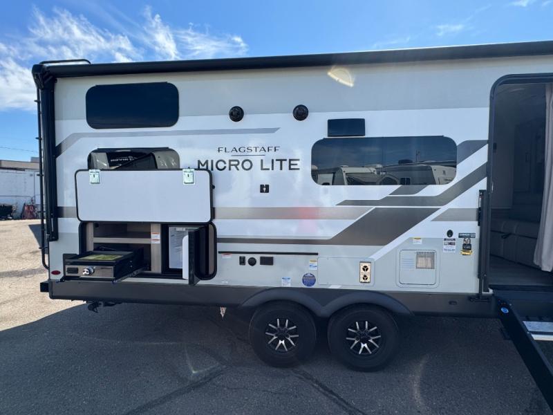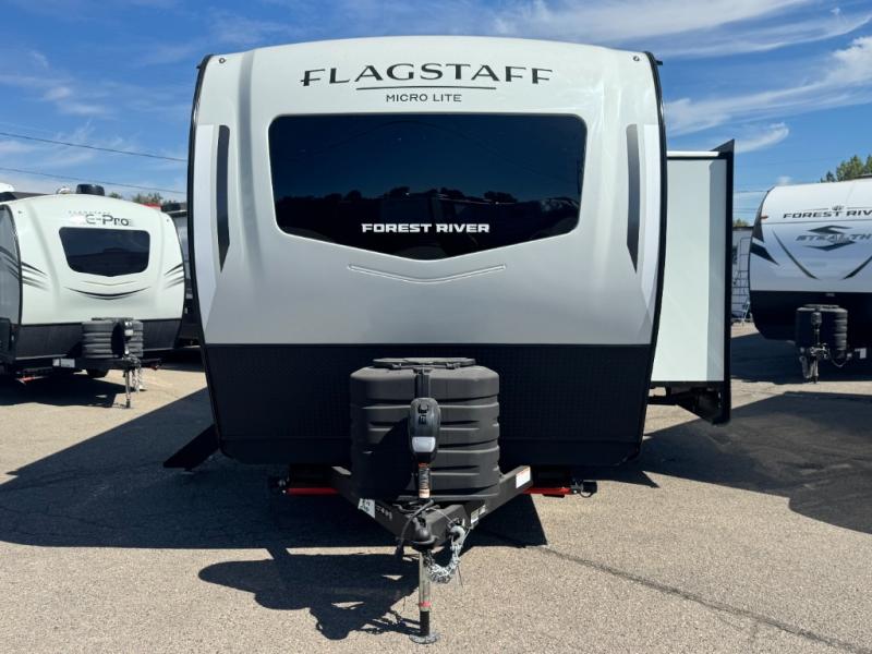 With any Flagstaff Micro Lite travel trailer by Forest River you will enjoy lightweight towing, durable construction, and added interior comforts to make each trip memorable! Each model features RoadTech tire pressure monitoring, Dexter Torflex axles, and nitrogen-filled Goodyear endurance tires for smooth towing from home to campground. The 6-sided aluminum framed construction provides a strong foundation so you can enjoy your RV for years to come, plus the radiant foil in the front cap, underbelly and slides help insulate your trailer. Additional exterior features include a 200W solar panel, back-up camera prep, frameless windows, and slam baggage doors. Each model includes the Great Expectations Package with roller shades, solid surface kitchen countertops, and hidden hinge cabinet doors. There is also an exterior hot/cold water port, outside speakers, a power tongue jack and stabilizer jacks, plus many more conveniences.