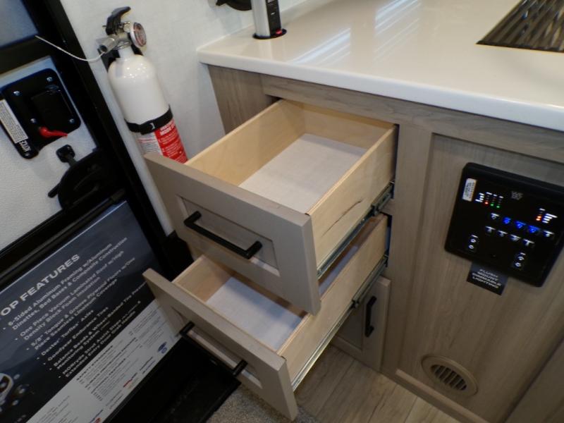 With any Flagstaff Micro Lite travel trailer by Forest River you will enjoy lightweight towing, durable construction, and added interior comforts to make each trip memorable! Each model features RoadTech tire pressure monitoring, Dexter Torflex axles, and nitrogen-filled Goodyear endurance tires for smooth towing from home to campground. The 6-sided aluminum framed construction provides a strong foundation so you can enjoy your RV for years to come, plus the radiant foil in the front cap, underbelly and slides help insulate your trailer. Additional exterior features include a 200W solar panel, back-up camera prep, frameless windows, and slam baggage doors. Each model includes the Great Expectations Package with roller shades, solid surface kitchen countertops, and hidden hinge cabinet doors. There is also an exterior hot/cold water port, outside speakers, a power tongue jack and stabilizer jacks, plus many more conveniences.