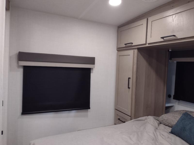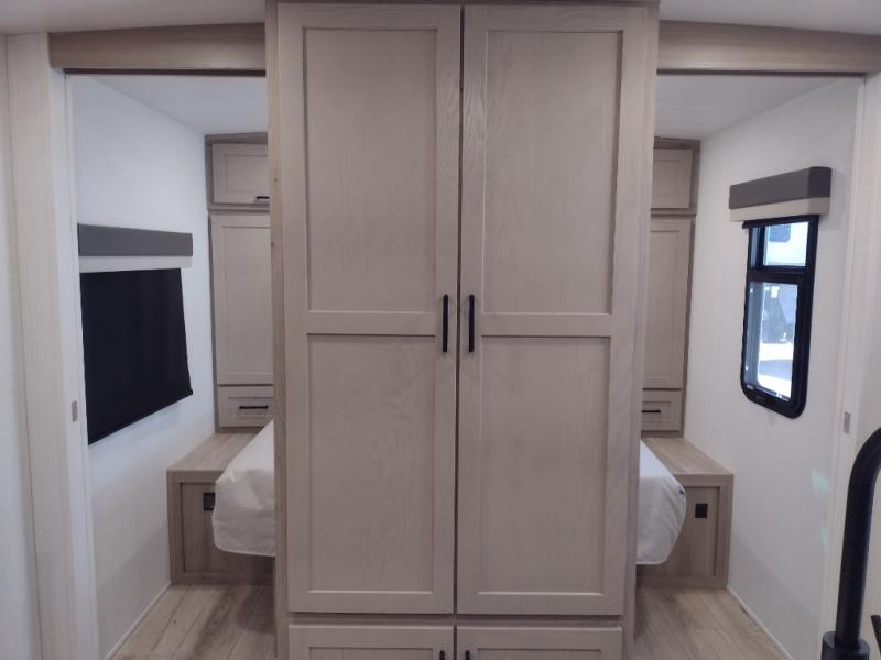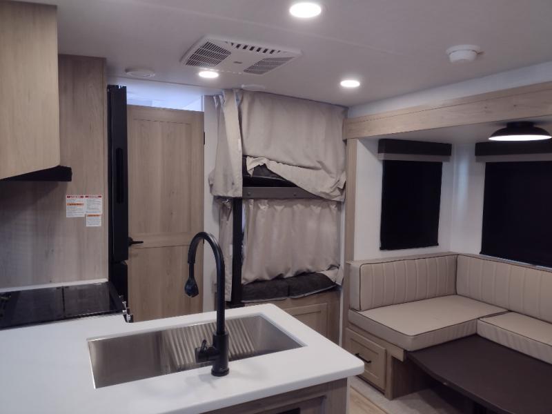 Camping in this single slide out travel trailer will make weekends at the campground comfy and hassle-free! Once you arrive, you can unload the pass-through storage, put out the 18' power awning, then relax in your camp chairs. And there is a full interior kitchen to make meals when you get hungry. Everyone can gather around the U-shaped dinette slide for meal times or game night, and there is a spacious pantry where you can store snacks! The bunk beds include a flip-up bottom bunk and an exterior bike door so you can easily pack camp gear away, and the full bath is right next to the bunks for easy nighttime use. Head up front to enjoy your own private bedroom with an RV queen bed, dual wardrobes, and flip-up storage!