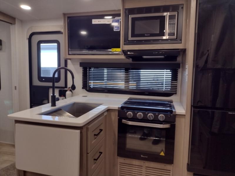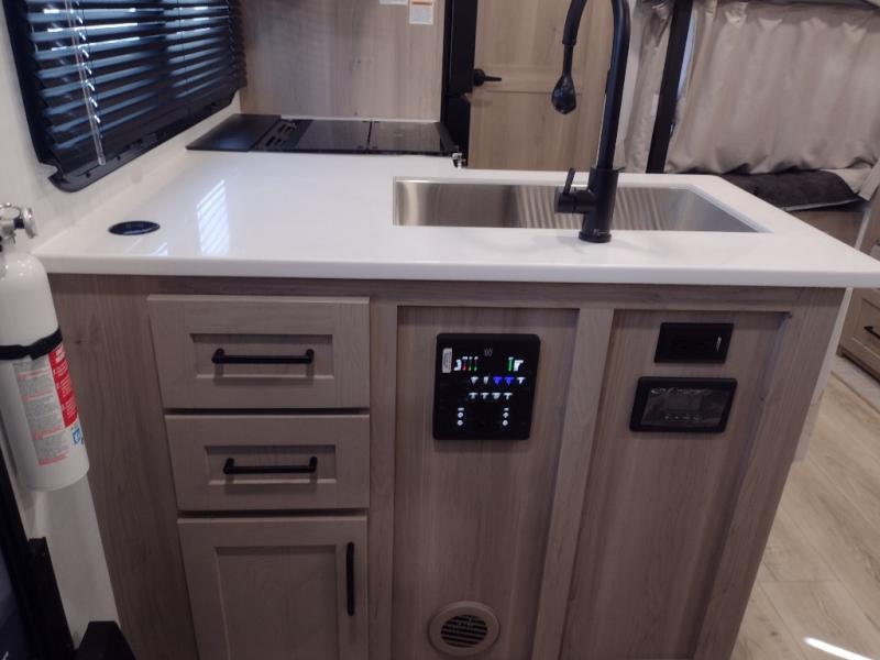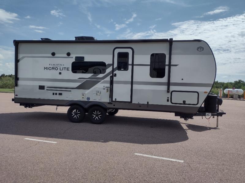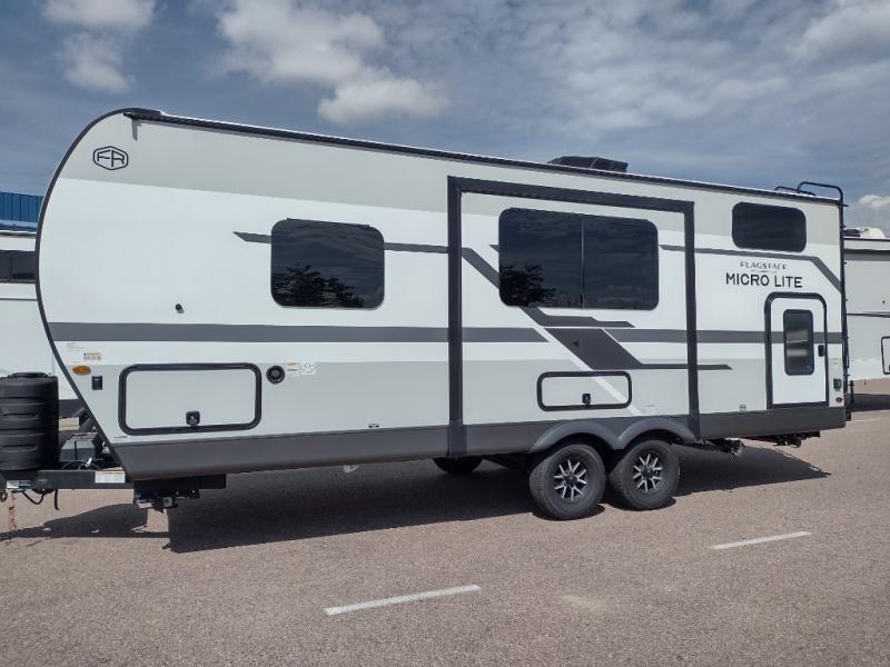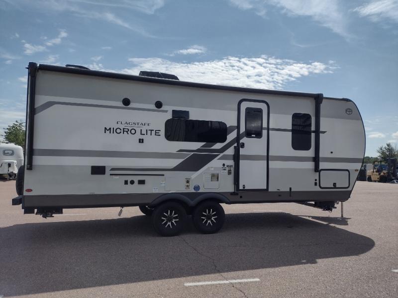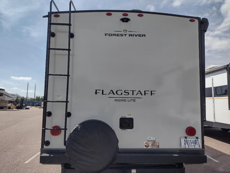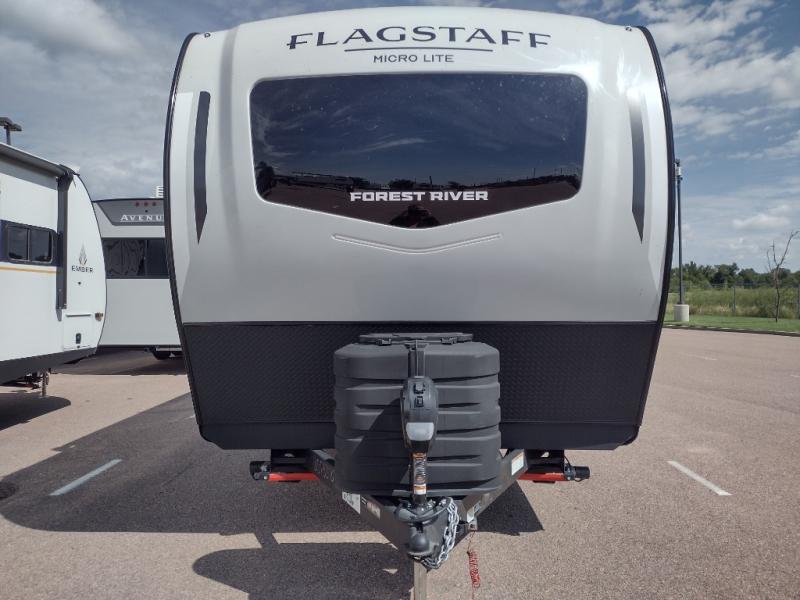 With any Flagstaff Micro Lite travel trailer by Forest River you will enjoy lightweight towing, durable construction, and added interior comforts to make each trip memorable! Each model features RoadTech tire pressure monitoring, Dexter Torflex axles, and nitrogen-filled Goodyear endurance tires for smooth towing from home to campground. The 6-sided aluminum framed construction provides a strong foundation so you can enjoy your RV for years to come, plus the radiant foil in the front cap, underbelly and slides help insulate your trailer. Additional exterior features include a 200W solar panel, back-up camera prep, frameless windows, and slam baggage doors. Each model includes the Great Expectations Package with roller shades, solid surface kitchen countertops, and hidden hinge cabinet doors. There is also an exterior hot/cold water port, outside speakers, a power tongue jack and stabilizer jacks, plus many more conveniences.
