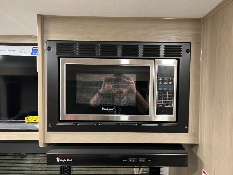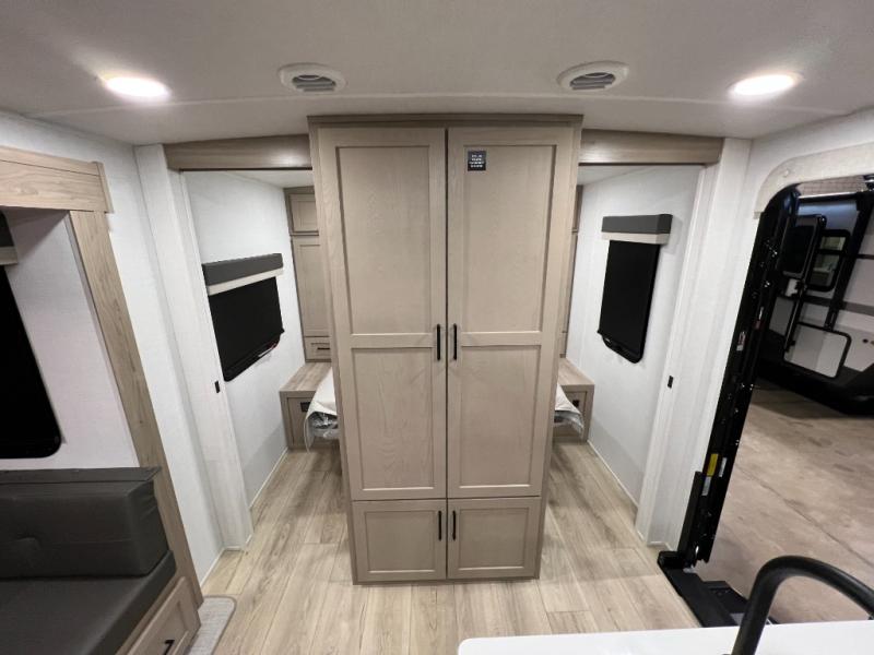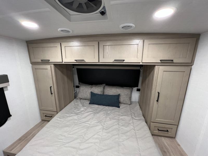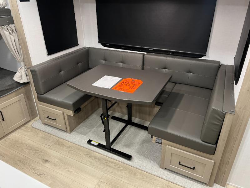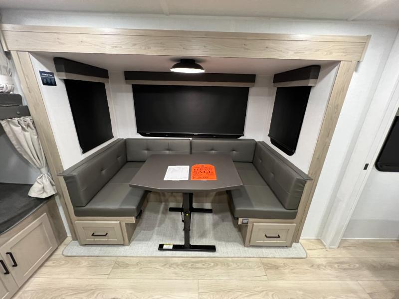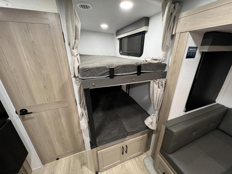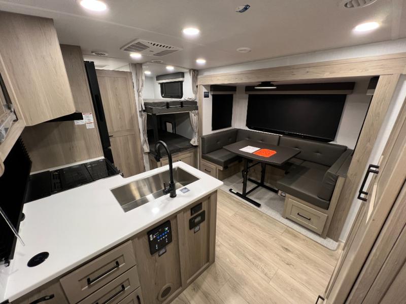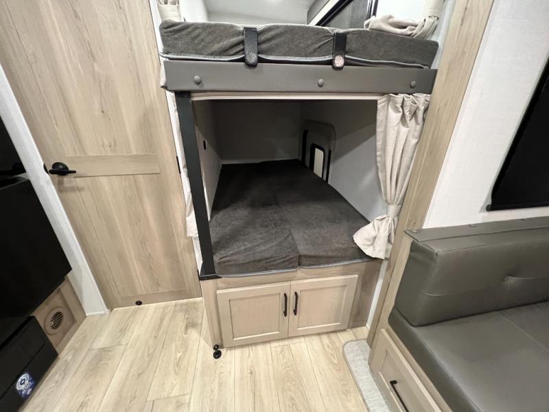 Camping in this single slide out travel trailer will make weekends at the campground comfy and hassle-free! Once you arrive, you can unload the pass-through storage, put out the 18' power awning, then relax in your camp chairs. And there is a full interior kitchen to make meals when you get hungry. Everyone can gather around the U-shaped dinette slide for meal times or game night, and there is a spacious pantry where you can store snacks! The bunk beds include a flip-up bottom bunk and an exterior bike door so you can easily pack camp gear away, and the full bath is right next to the bunks for easy nighttime use. Head up front to enjoy your own private bedroom with an RV queen bed, dual wardrobes, and flip-up storage!