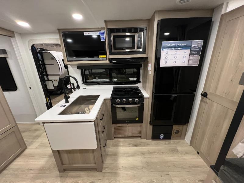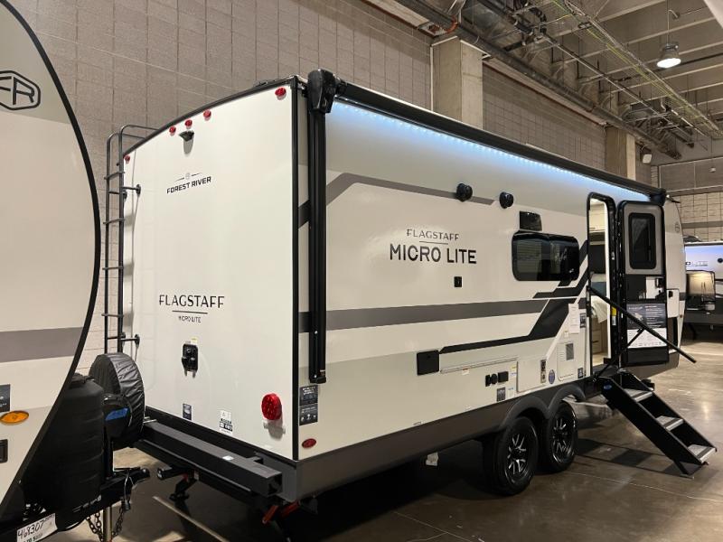 With any Flagstaff Micro Lite travel trailer by Forest River you will enjoy lightweight towing, durable construction, and added interior comforts to make each trip memorable! Each model features RoadTech tire pressure monitoring, Dexter Torflex axles, and nitrogen-filled Goodyear endurance tires for smooth towing from home to campground. The 6-sided aluminum framed construction provides a strong foundation so you can enjoy your RV for years to come, plus the radiant foil in the front cap, underbelly and slides help insulate your trailer. Additional exterior features include a 200W solar panel, back-up camera prep, frameless windows, and slam baggage doors. Each model includes the Great Expectations Package with roller shades, solid surface kitchen countertops, and hidden hinge cabinet doors. There is also an exterior hot/cold water port, outside speakers, a power tongue jack and stabilizer jacks, plus many more conveniences.