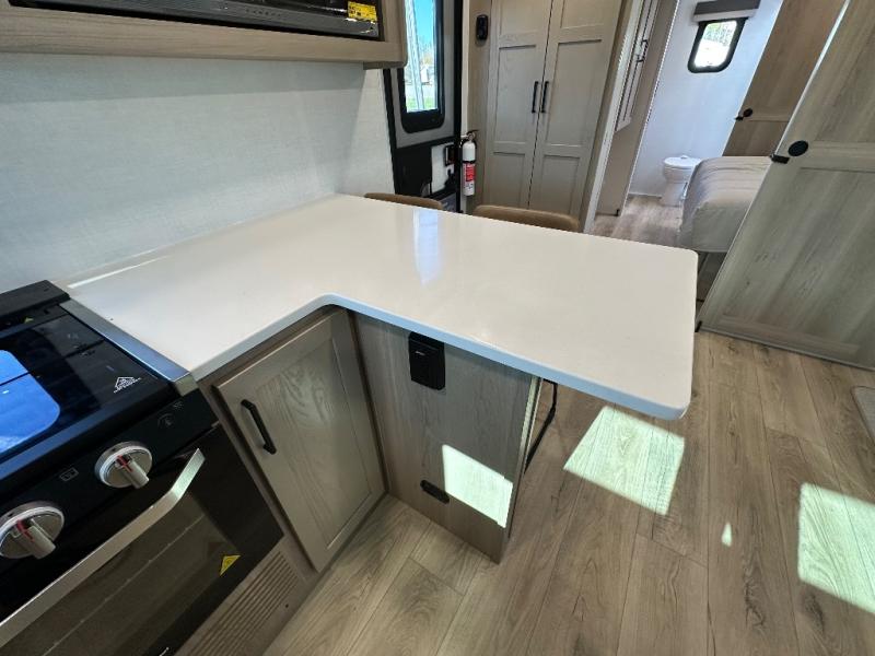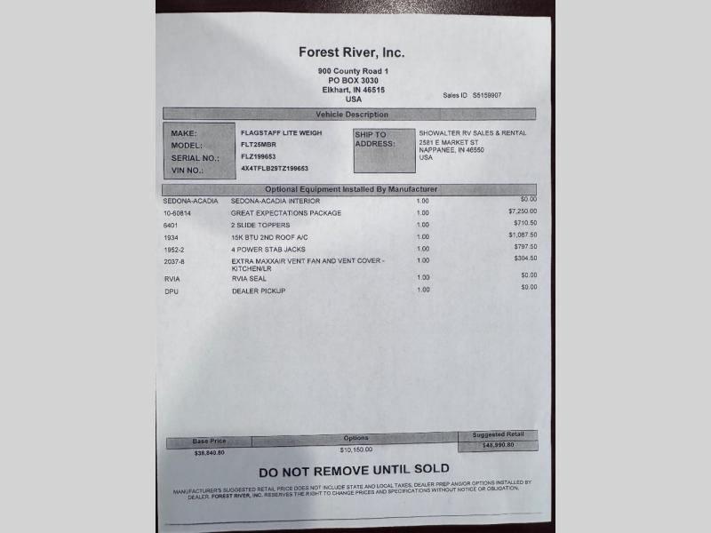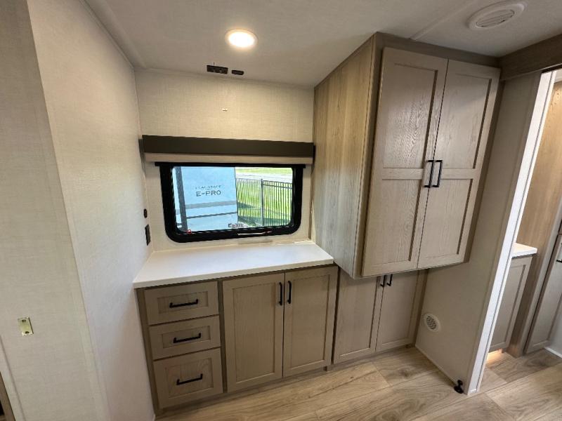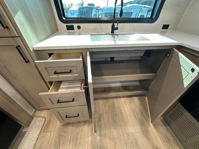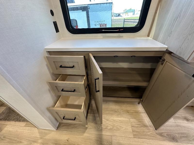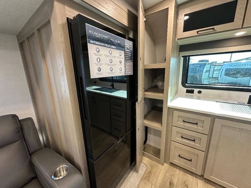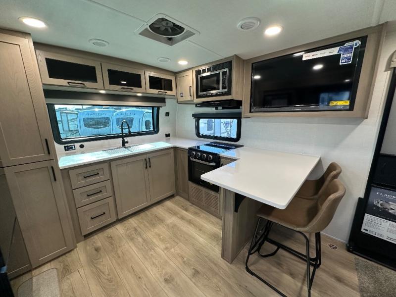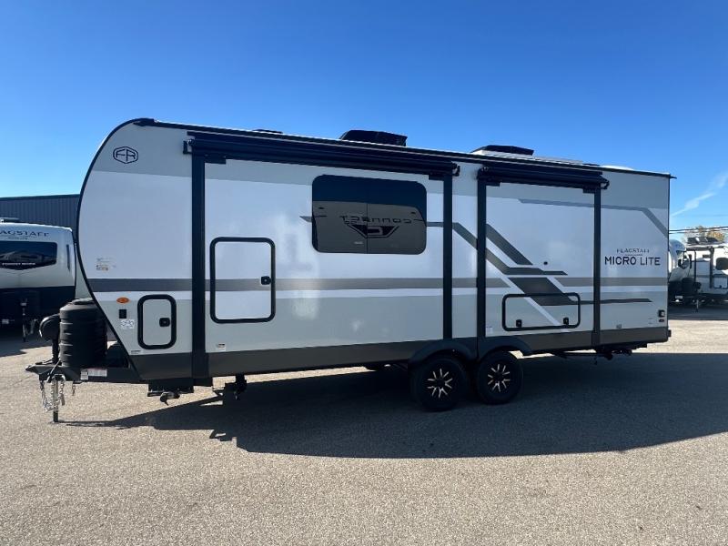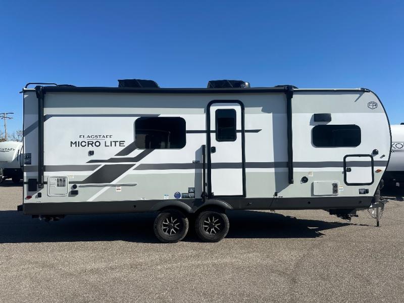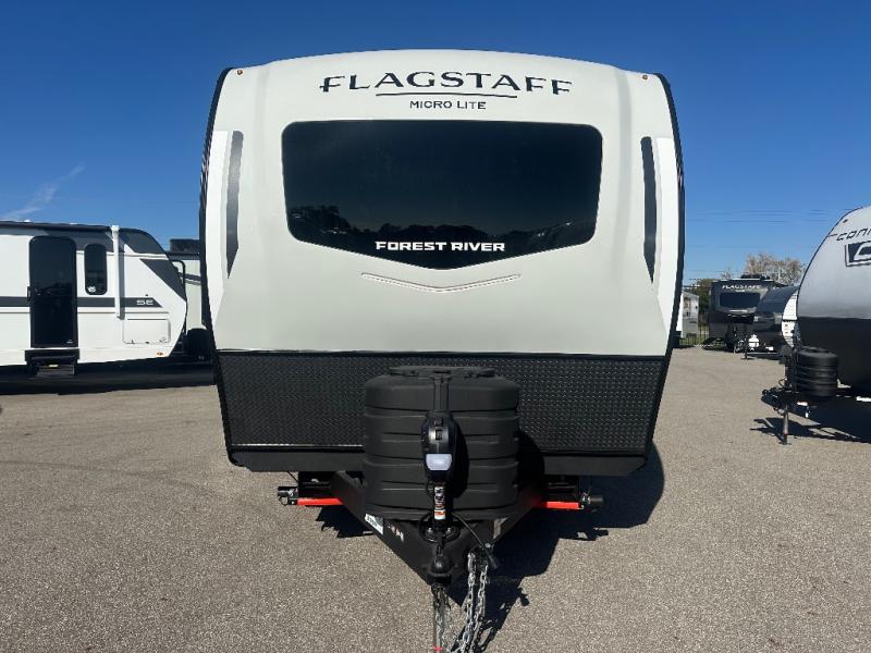 With any Flagstaff Micro Lite travel trailer by Forest River you will enjoy lightweight towing, durable construction, and added interior comforts to make each trip memorable! Each model features RoadTech tire pressure monitoring, Dexter Torflex axles, and nitrogen-filled Goodyear endurance tires for smooth towing from home to campground. The 6-sided aluminum framed construction provides a strong foundation so you can enjoy your RV for years to come, plus the radiant foil in the front cap, underbelly and slides help insulate your trailer. Additional exterior features include a 200W solar panel, back-up camera prep, frameless windows, and slam baggage doors. Each model includes the Great Expectations Package with roller shades, solid surface kitchen countertops, and hidden hinge cabinet doors. There is also an exterior hot/cold water port, outside speakers, a power tongue jack and stabilizer jacks, plus many more conveniences.