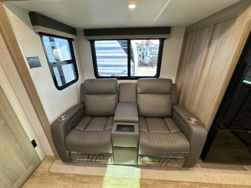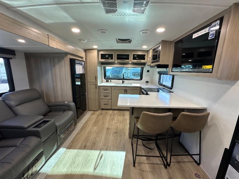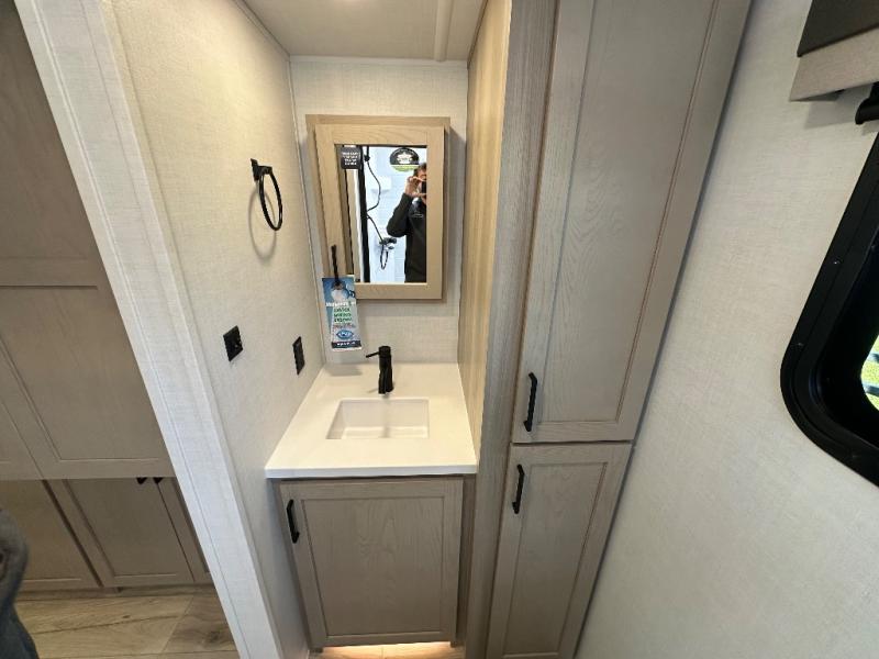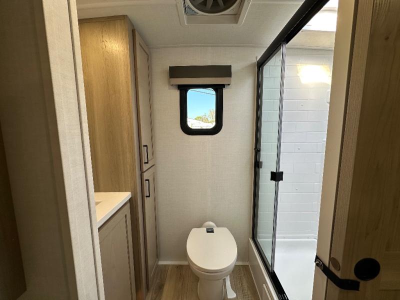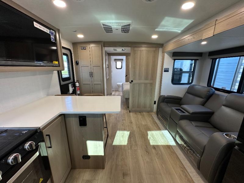 This front kitchen travel trailer is sure to make all your camping wishes come true. It's perfect for a couple since there is a master bedroom with a 60" x 80" queen bed, plus a theater seat in the main living area. If you're needing additional sleeping spaces, just choose the optional hide-a-bed sofa in place of the theater seat. The generous counter space in the kitchen will give you plenty of space to prep meals, and there is a bartop with stools where you can dine together. Along with the queen bed slide, the bedroom also includes a dresser, a TV option, plus a wardrobe with washer and dryer prep if you choose to add these appliances. And don't overlook the full rear bath to freshen up each day!