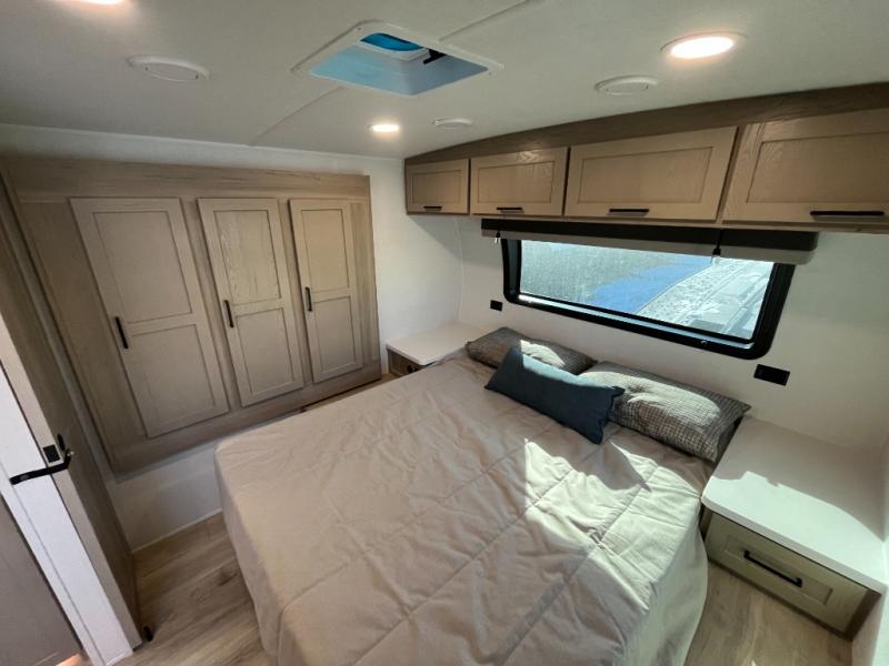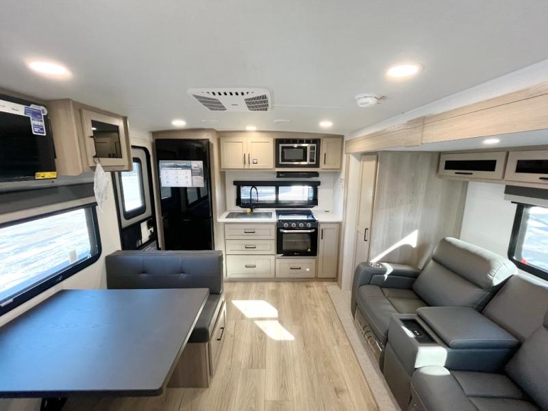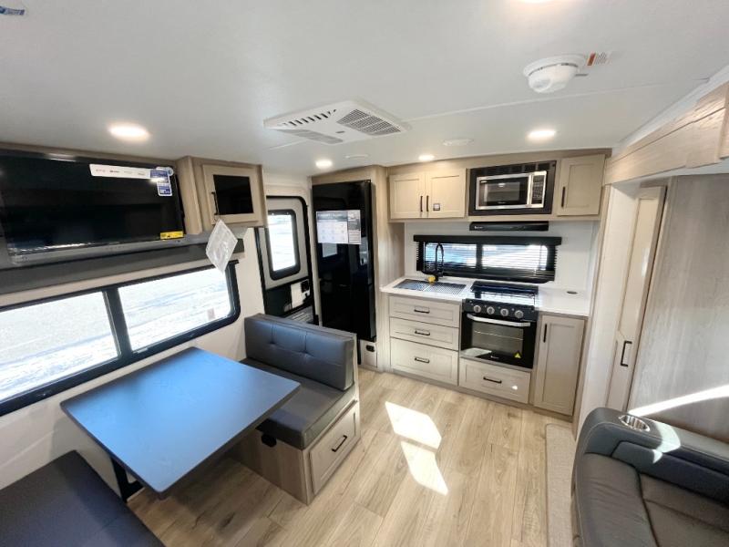 Trips to your favorite campground are made complete with this dual slide out, dual entry trailer! One entry goes straight into the front master bedroom where you'll find an RV queen bed with flip-up storage, a wardrobe slide out, and easy access into the walk-through bath. Once you're through the bath, you'll find the main living area, rear kitchen, and the second entry door at the back. Your crew can play a game at the 39" booth dinette or relax on the theater seat across from the TV. The kitchen includes everything you need to prepare meals in the morning, including a three burner cooktop and microwave oven, plus a 12V refrigerator and a pantry for food storage.