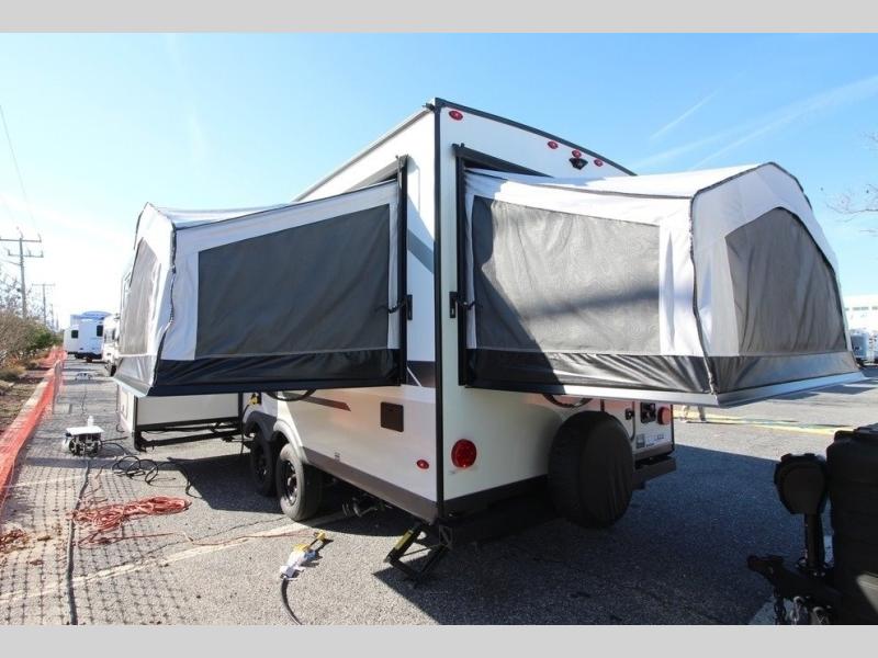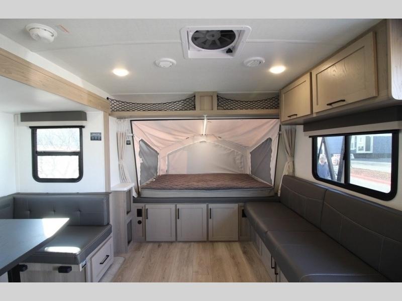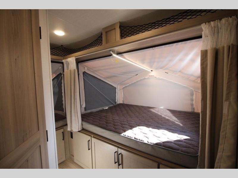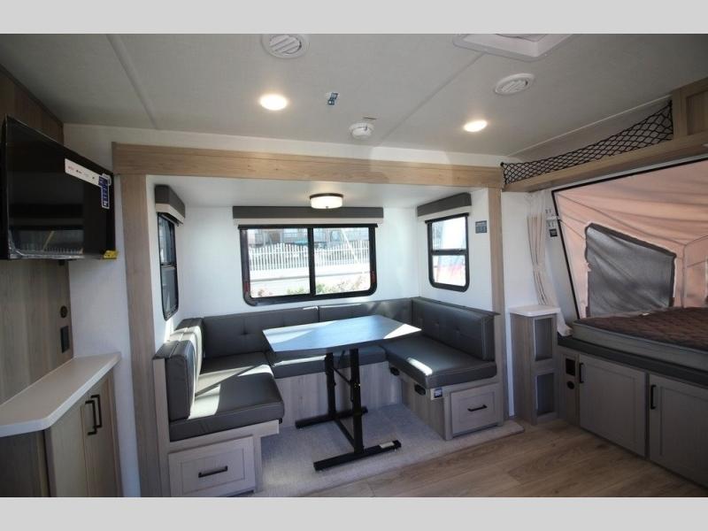 If you're looking for more sleeping space and added interior space, your search is over! This expandable includes three queen tent end beds, plus a U-shaped dinette and a flip sofa to sleep nine! A three burner cooktop and microwave oven in the kitchen will allow you to prepare meals each day, and there is an added exterior griddle for dinner outside. This model also includes an impressive amount of storage, including a kitchen pantry and exterior storage for hiking gear and tackle boxes!