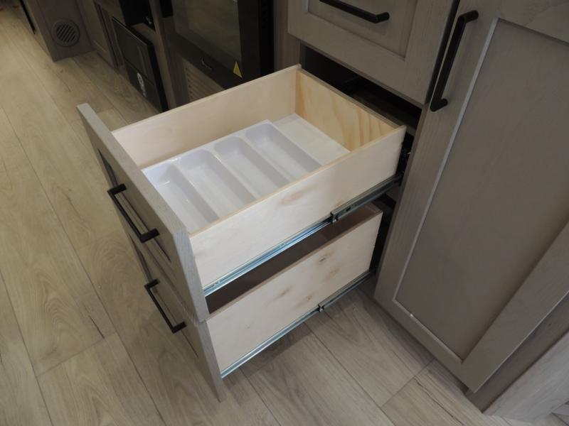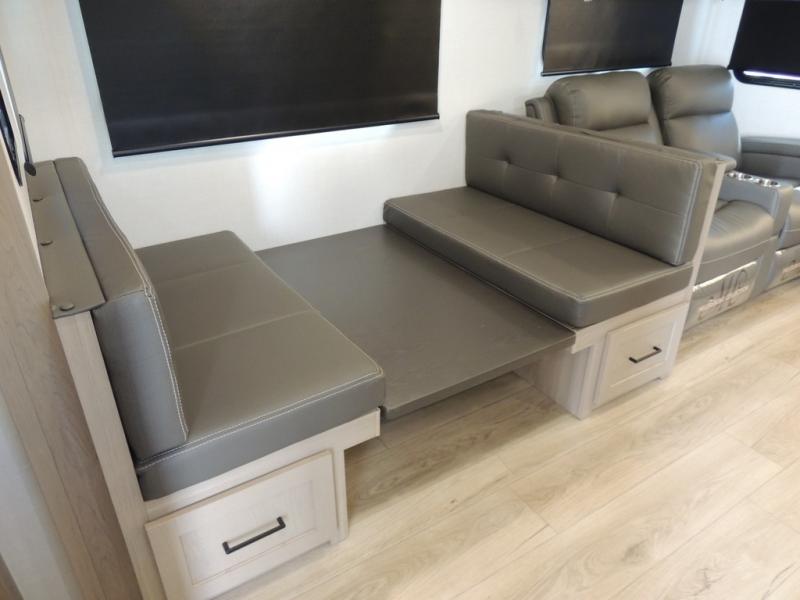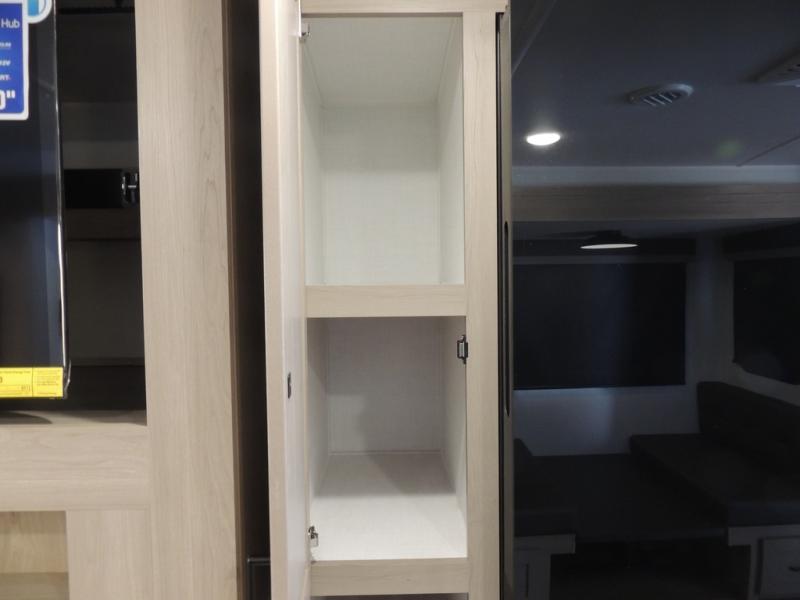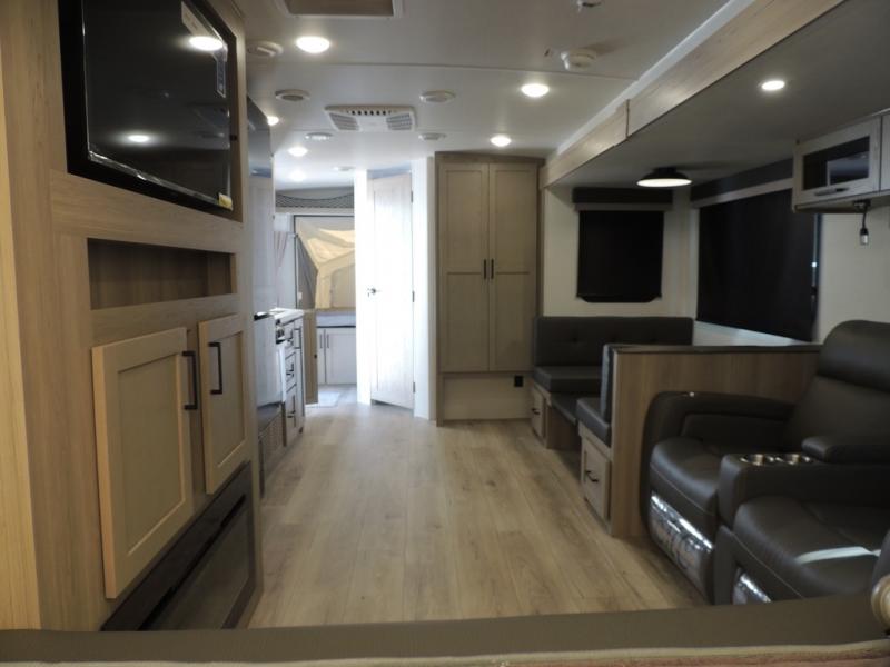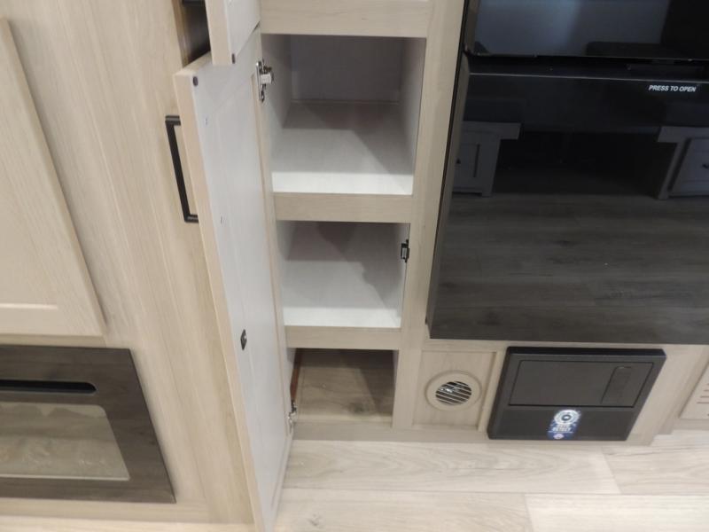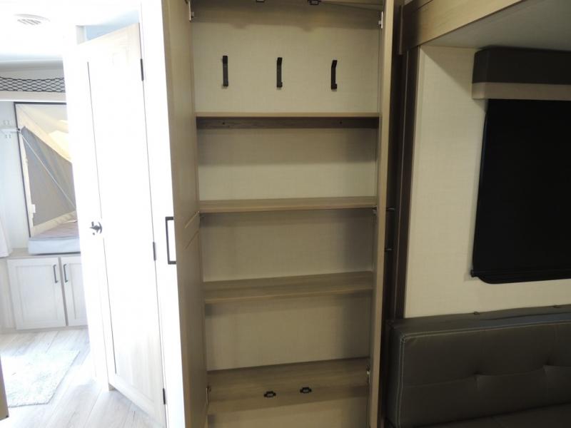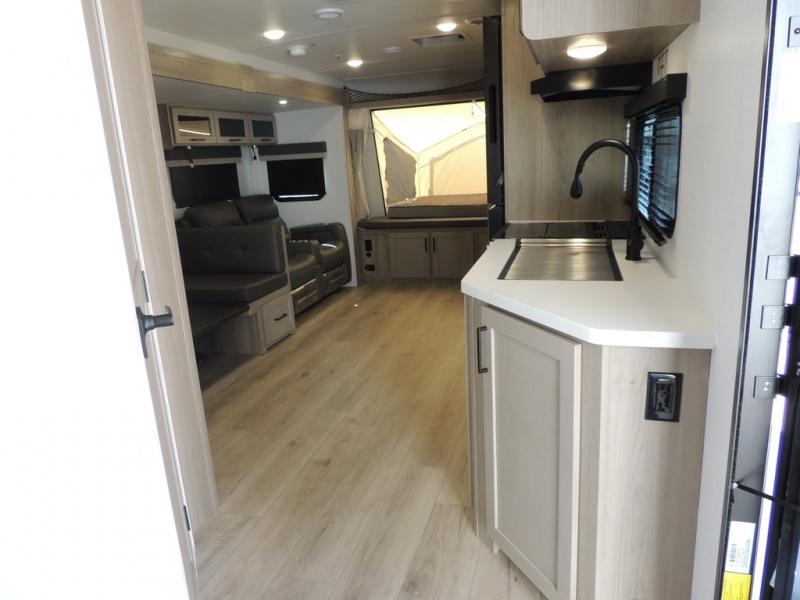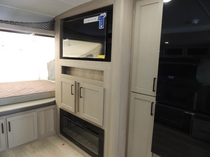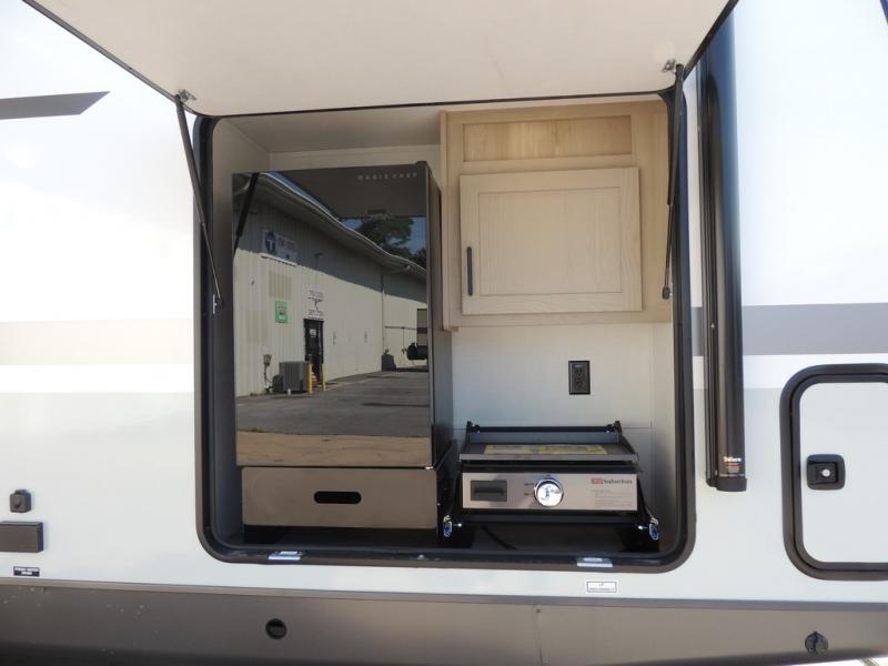 You will feel right at home in this spacious expandable thanks to the large slide out and the fireplace with a TV. Within the slide you'll find a booth dinette and hide-a-bed sofa, or you can choose the optional theater seat in place of the sofa. There is a full kitchen with a three burner cooktop, a 12V refrigerator, plus a microwave oven, and if you enjoy cooking outdoors, you're going to love the outside kitchen! You'll also find an 18' power awning outdoors, along with three exterior storage compartments and Solid Step entry steps.