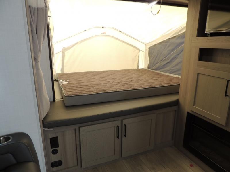 Each Flagstaff Shamrock expandable by Forest River includes an enclosed underbelly, interior and exterior composite sidewall construction, and a vinyl/rubber composite roofing membrane for added durability. The power tongue jack will make hitching up easier than ever, and the torsion axle, Rubber-Ryde suspension and Goodyear Endurance tires will provide smooth towing. You will also appreciate having a 200W roof solar panel with a 1800W inverter, an outside spray port, Keyed-Alike locks, plus many more exterior conveniences. The interior is made to feel more like home with solid wood cabinet doors and drawers, marine grade carpet in the slides, Sedona Wood cabinetry, plus seamless kitchen countertops.