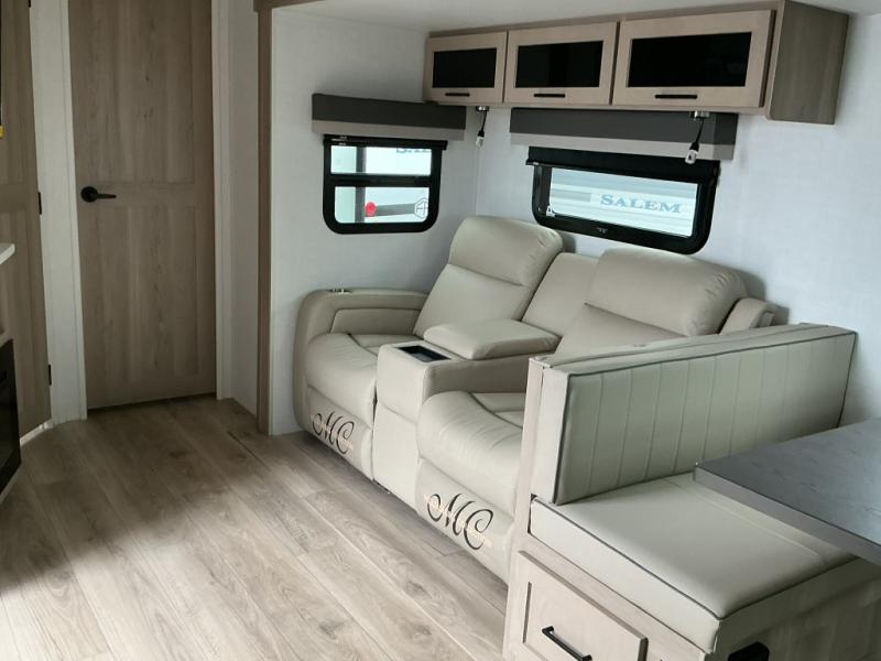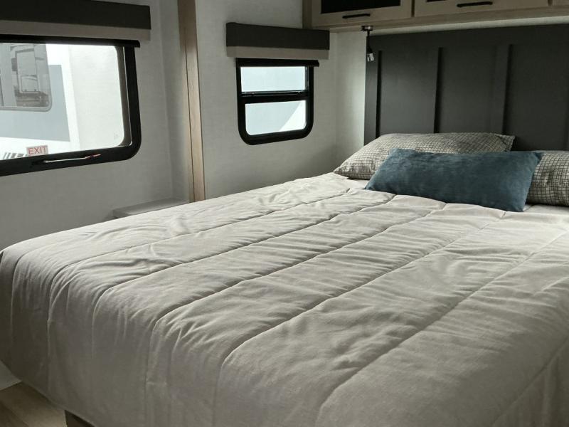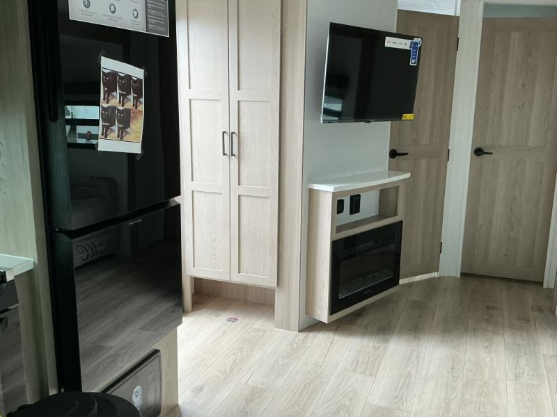 This is the perfect couples trailer with a spacious living and kitchen area and a rear bedroom which includes the second exterior entry/exit door! The bedroom also provides a slide out queen bed, a wardrobe and an optional TV, plus windows for great views and access to the double entry bathroom. The front kitchen gives the cook counter space and cabinetry for dishes and such, plus all the appliances needed to make warm meals and store leftovers. You can dine at the booth dinette, relax on the 67" theater seating and watch the Smart TV while enjoying the fireplace.
