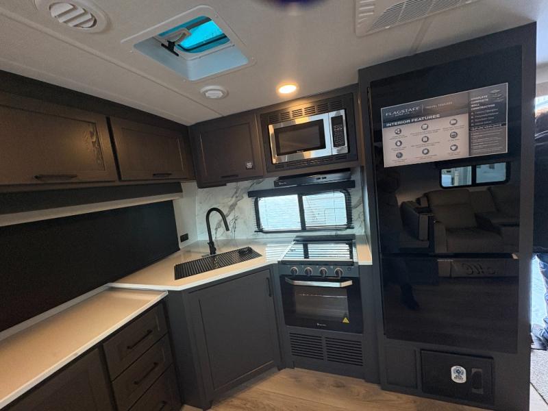With any Flagstaff Super Lite travel trailer by Forest River, you can enjoy quality features with lightweight towing! The Climate Protection Package includes radiant foil in the front cap, underbelly, and slides, plus there are 12V thermostat-controlled heated tanks for added protection. The complete composite wall construction and 6-sided full-aluminum frame is ultra durable, and the RoadTech tire pressure monitoring adds safety. Each model also includes the Coast to Coast Package that comes with slam latch baggage doors, a high gloss fiberglass cap, Goodyear Endurance tires, plus a 200W solar panel with an optional additional 200W panel for more off grid capabilities. Inside, you'll love the roller shades, solid surface kitchen countertops, a shower miser system, and many more comforts!