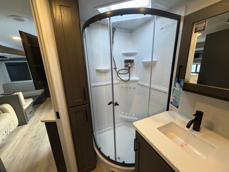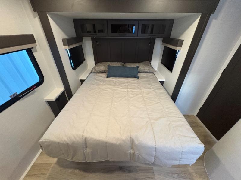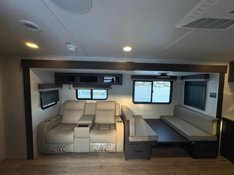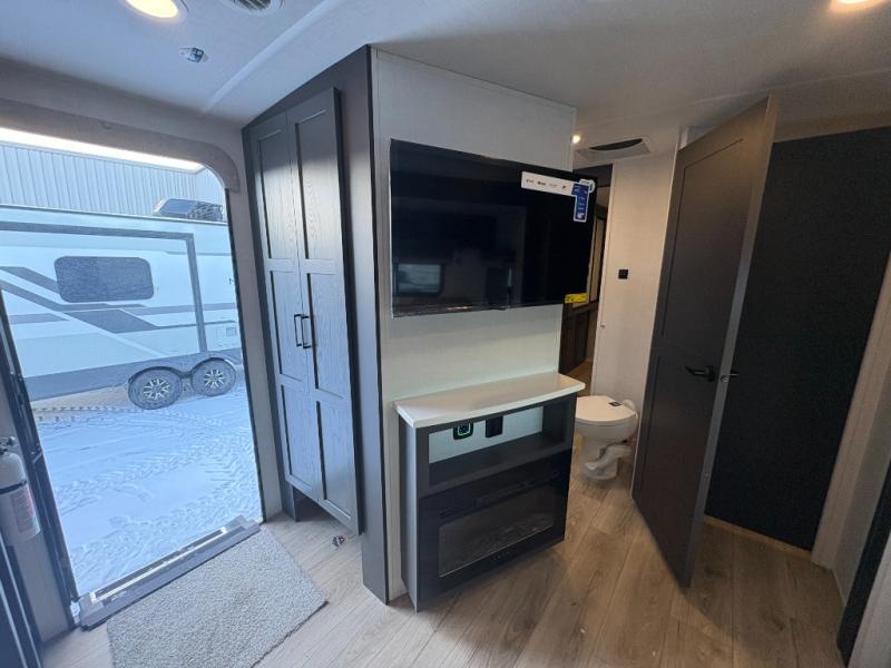 This is the perfect couples trailer with a spacious living and kitchen area and a rear bedroom which includes the second exterior entry/exit door! The bedroom also provides a slide out queen bed, a wardrobe and an optional TV, plus windows for great views and access to the double entry bathroom. The front kitchen gives the cook counter space and cabinetry for dishes and such, plus all the appliances needed to make warm meals and store leftovers. You can dine at the booth dinette, relax on the 67" theater seating and watch the Smart TV while enjoying the fireplace.