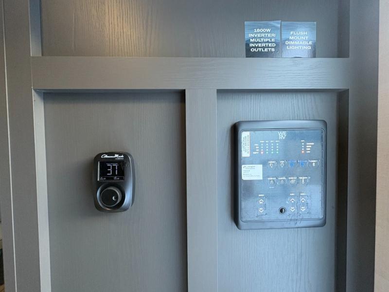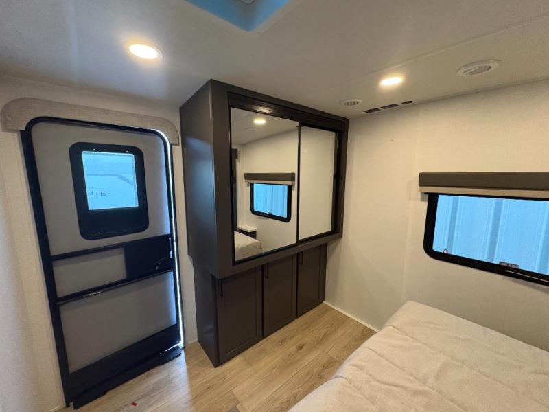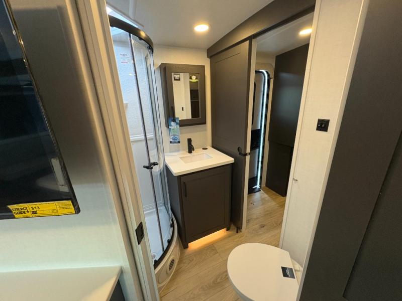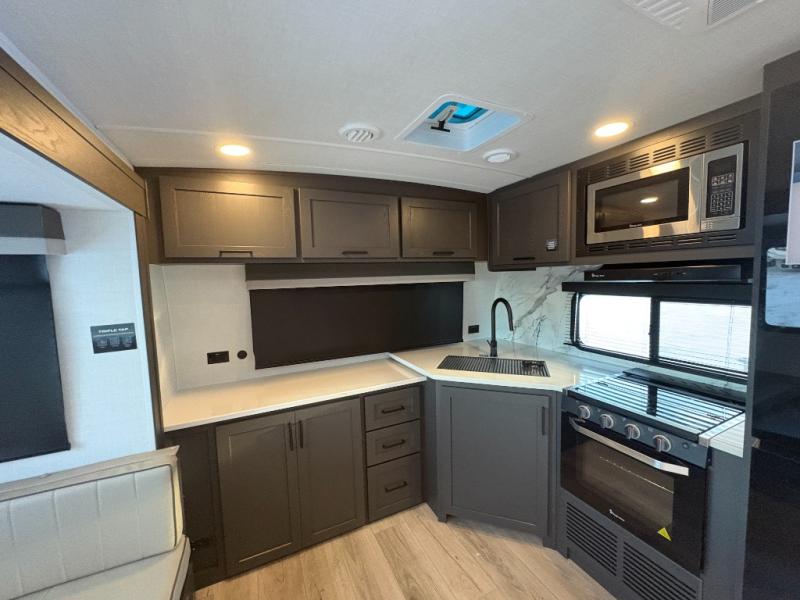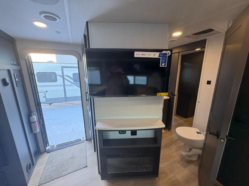 This is the perfect couples trailer with a spacious living and kitchen area and a rear bedroom which includes the second exterior entry/exit door! The bedroom also provides a slide out queen bed, a wardrobe and an optional TV, plus windows for great views and access to the double entry bathroom. The front kitchen gives the cook counter space and cabinetry for dishes and such, plus all the appliances needed to make warm meals and store leftovers. You can dine at the booth dinette, relax on the 67" theater seating and watch the Smart TV while enjoying the fireplace.