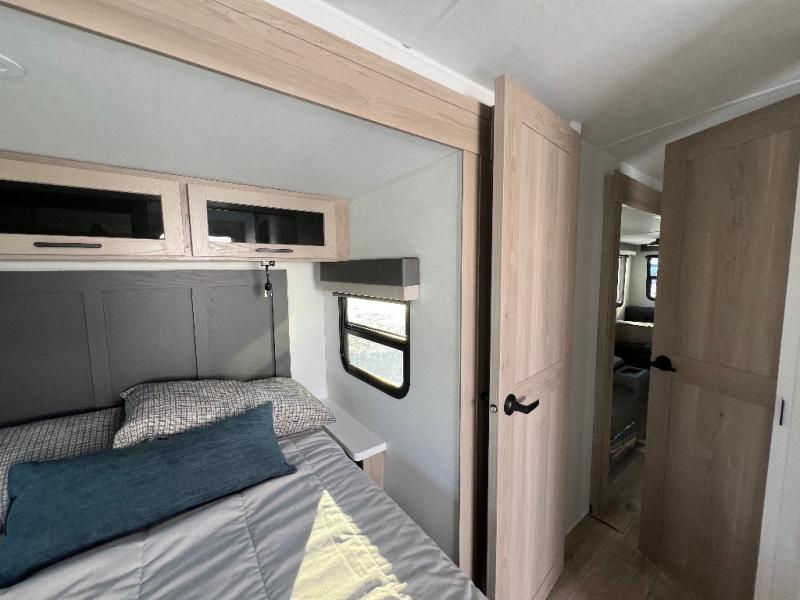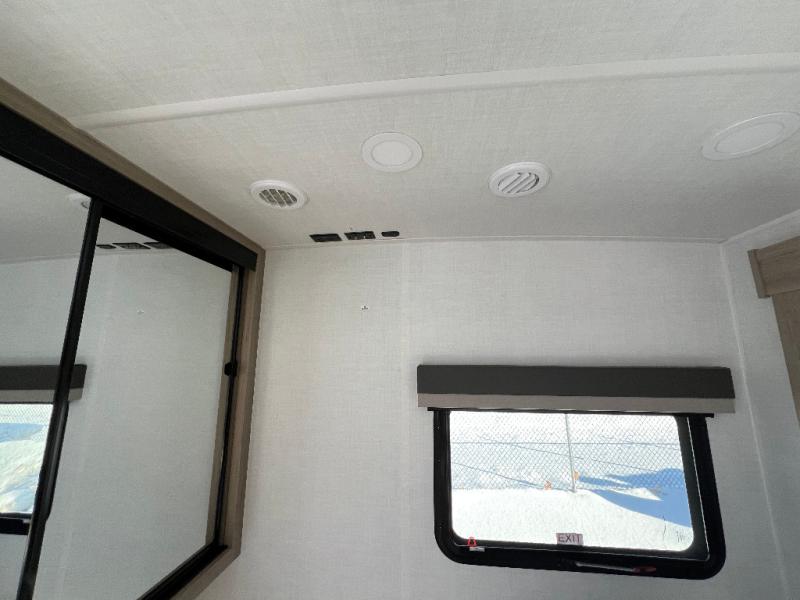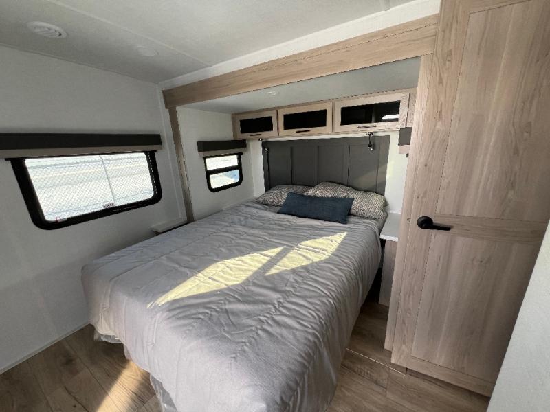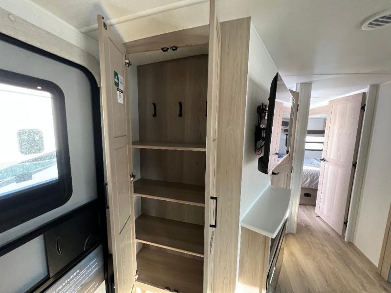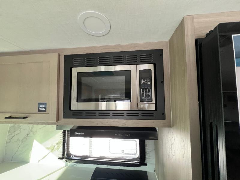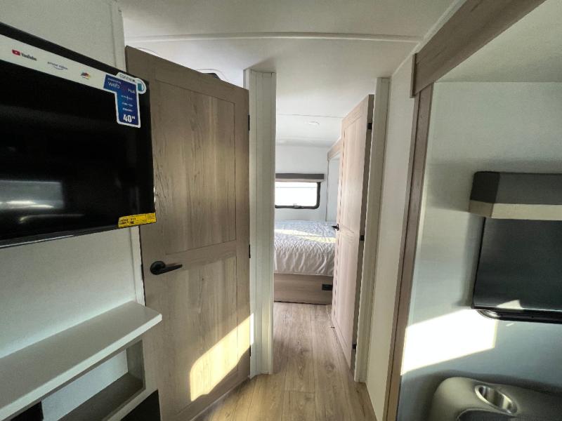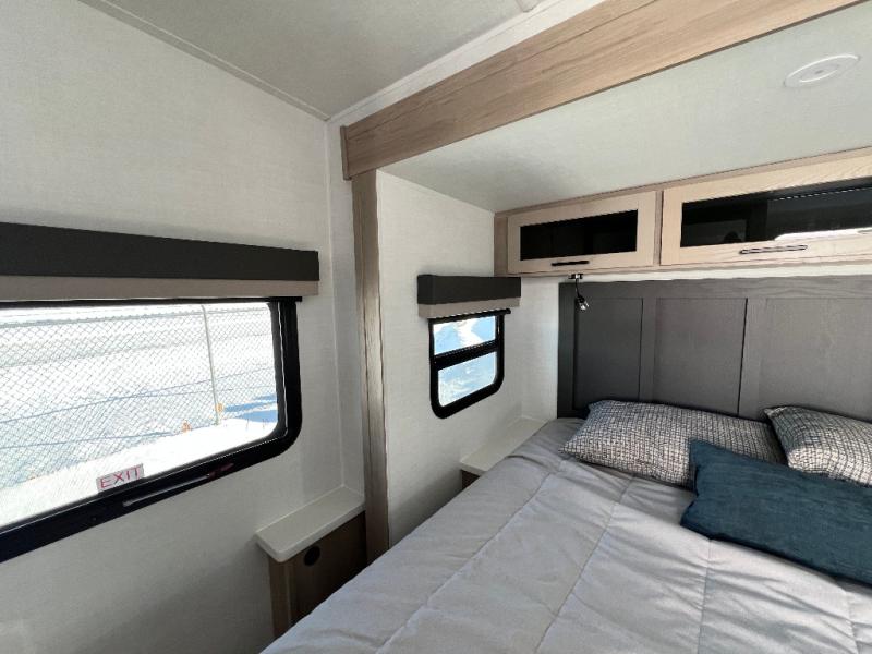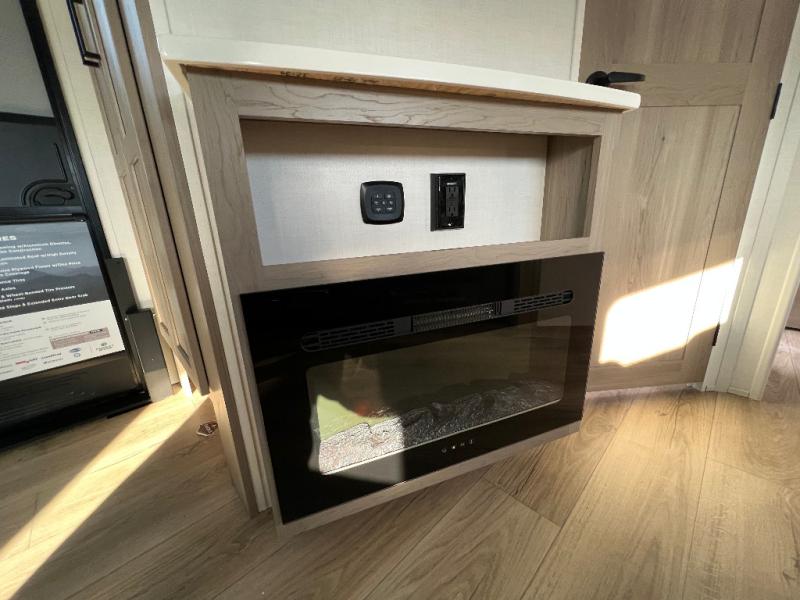 This is the perfect couples trailer with a spacious living and kitchen area and a rear bedroom which includes the second exterior entry/exit door! The bedroom also provides a slide out queen bed, a wardrobe and an optional TV, plus windows for great views and access to the double entry bathroom. The front kitchen gives the cook counter space and cabinetry for dishes and such, plus all the appliances needed to make warm meals and store leftovers. You can dine at the booth dinette, relax on the 67" theater seating and watch the Smart TV while enjoying the fireplace.
