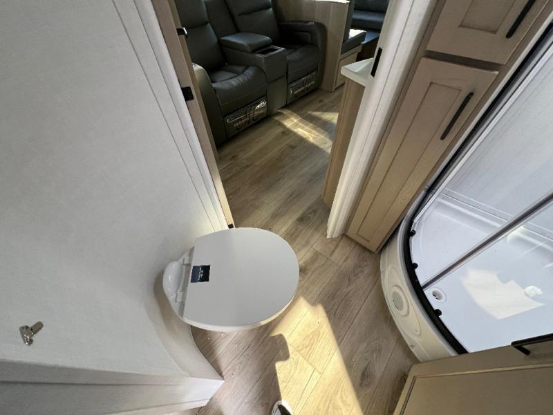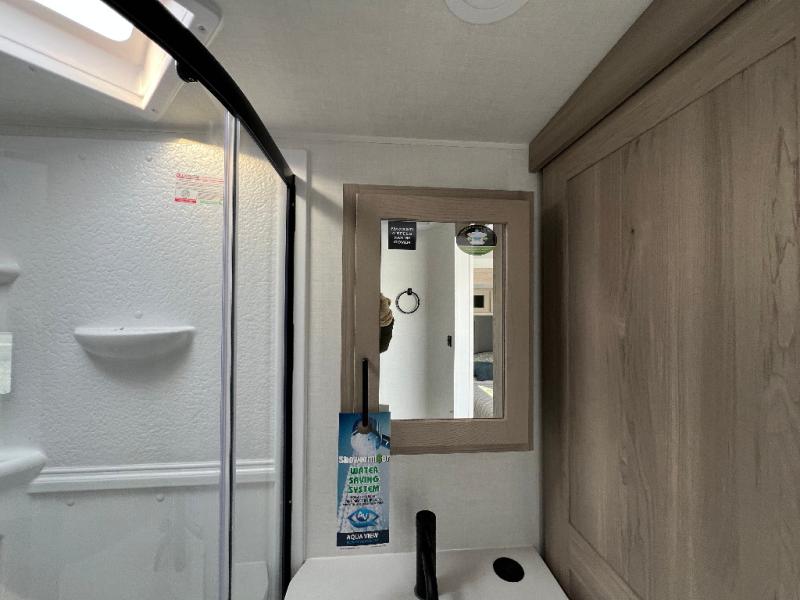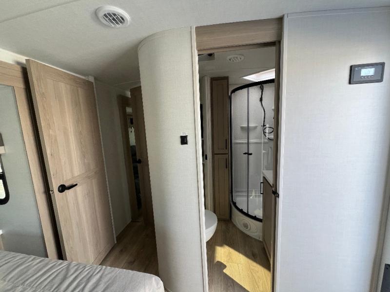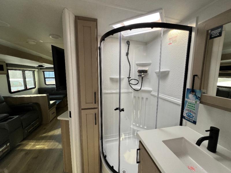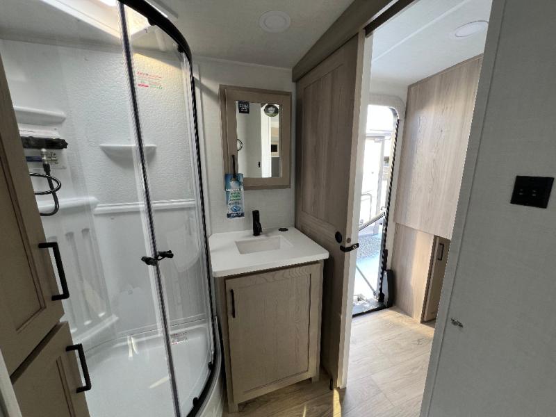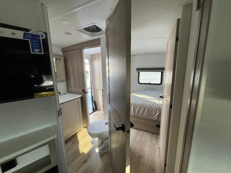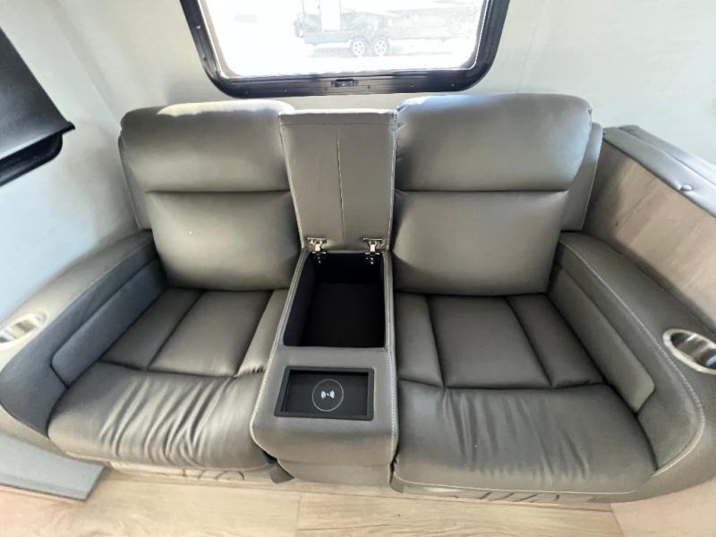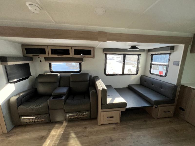 This is the perfect couples trailer with a spacious living and kitchen area and a rear bedroom which includes the second exterior entry/exit door! The bedroom also provides a slide out queen bed, a wardrobe and an optional TV, plus windows for great views and access to the double entry bathroom. The front kitchen gives the cook counter space and cabinetry for dishes and such, plus all the appliances needed to make warm meals and store leftovers. You can dine at the booth dinette, relax on the 67" theater seating and watch the Smart TV while enjoying the fireplace.