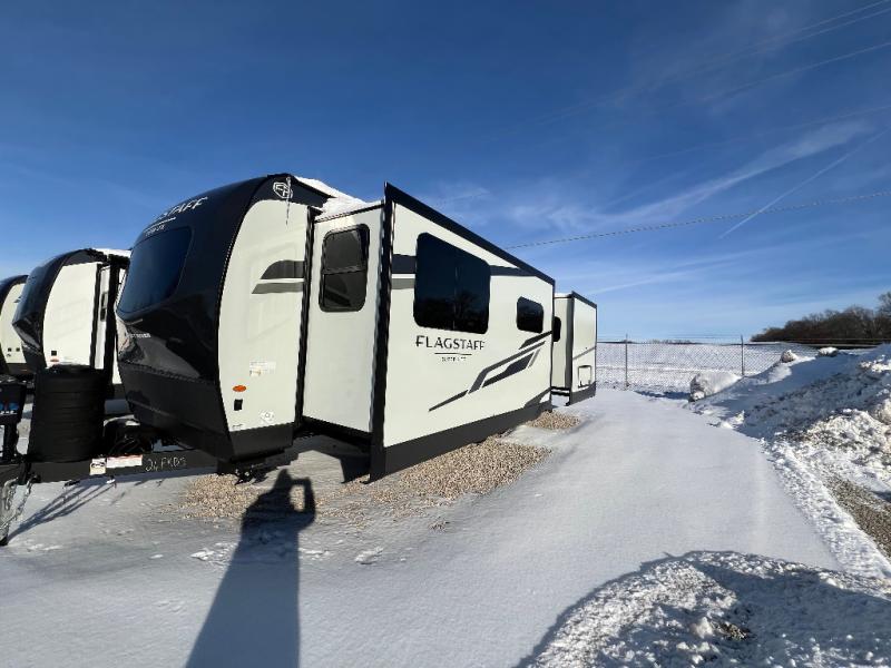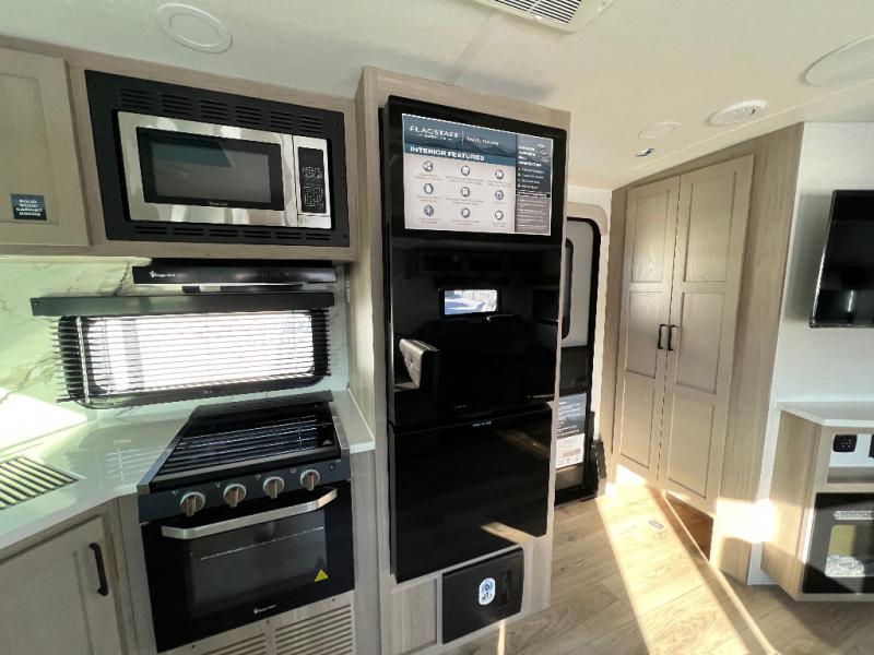 With any Flagstaff Super Lite travel trailer by Forest River, you can enjoy quality features with lightweight towing! The Climate Protection Package includes radiant foil in the front cap, underbelly, and slides, plus there are 12V thermostat-controlled heated tanks for added protection. The complete composite wall construction and 6-sided full-aluminum frame is ultra durable, and the RoadTech tire pressure monitoring adds safety. Each model also includes the Coast to Coast Package that comes with slam latch baggage doors, a high gloss fiberglass cap, Goodyear Endurance tires, plus a 200W solar panel with an optional additional 200W panel for more off grid capabilities. Inside, you'll love the roller shades, solid surface kitchen countertops, a shower miser system, and many more comforts!
