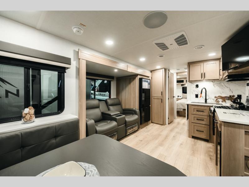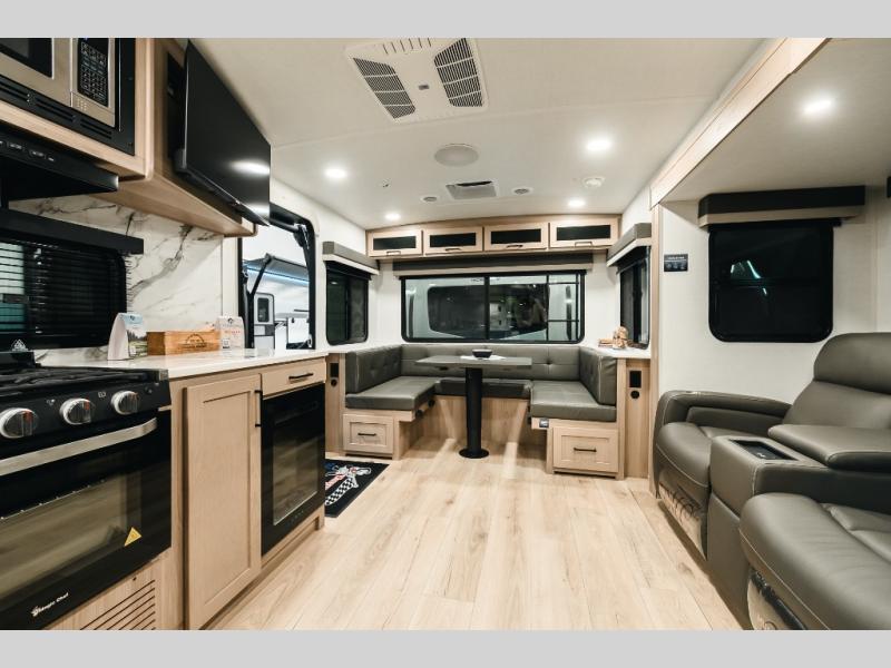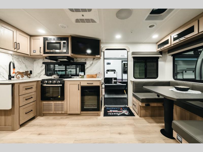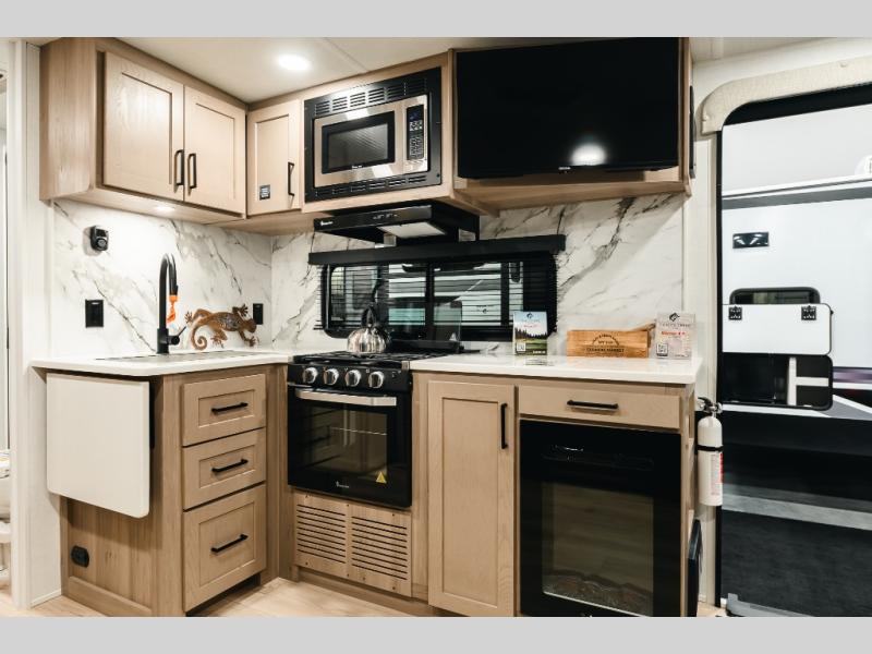 It will be so easy to enjoy time at the campground in this cozy travel trailer. The full kitchen includes a three burner gas oven, a microwave oven, and a 12V refrigerator to cook and store food, and the pantry will let you stock up on snacks. Your crew can get comfortable on the theater seat or around the rear U-shaped dinette, and there is a smart TV here to make it a movie night. The walk-thru bath will let you freshen up each day, and the queen bed in the front bedroom is sure to bring comfort. You will also find one of the dual entry doors here for convenience plus a wardrobe slide out for more storage and floor space. The exterior is just as accommodating with its pass-thru storage, 2" receiver hitch, and 21' power awning!