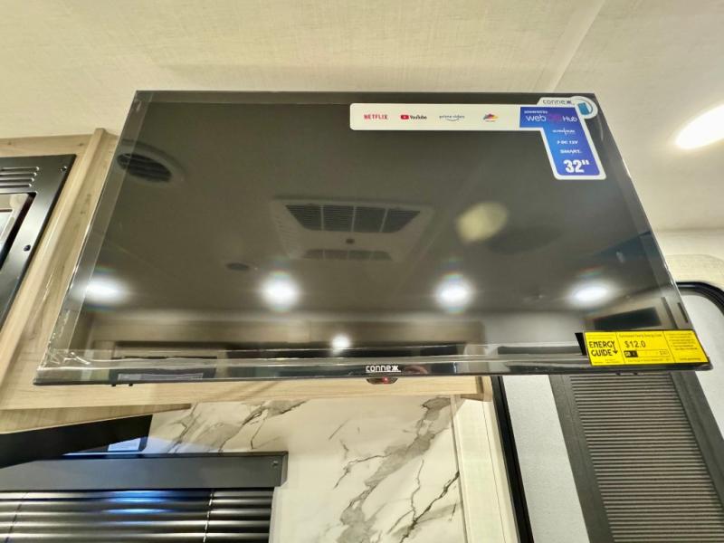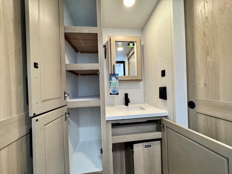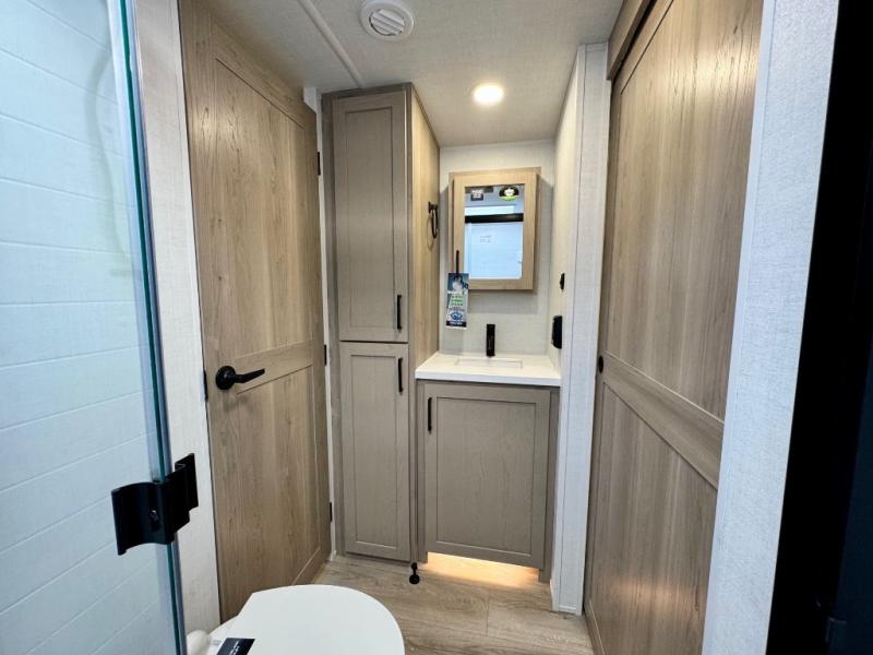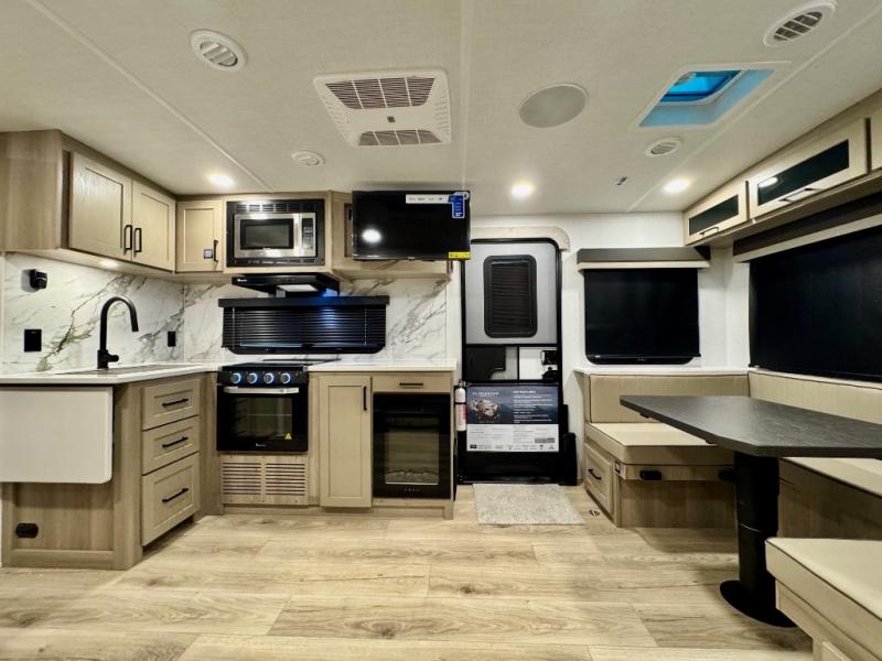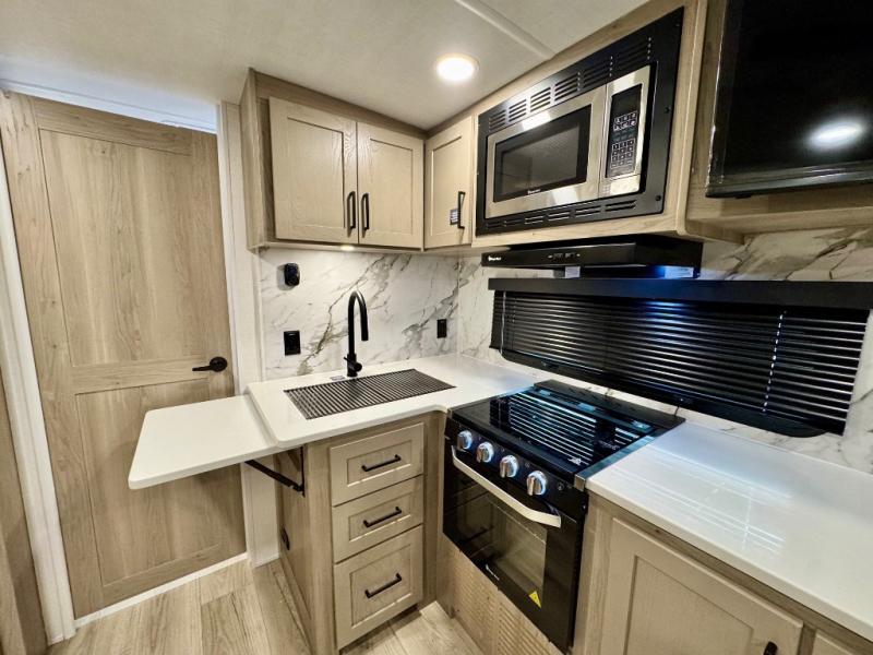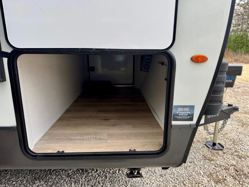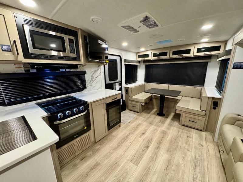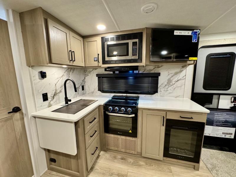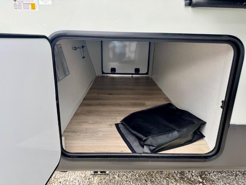 It will be so easy to enjoy time at the campground in this cozy travel trailer. The full kitchen includes a three burner gas oven, a microwave oven, and a 12V refrigerator to cook and store food, and the pantry will let you stock up on snacks. Your crew can get comfortable on the theater seat or around the rear U-shaped dinette, and there is a smart TV here to make it a movie night. The walk-thru bath will let you freshen up each day, and the queen bed in the front bedroom is sure to bring comfort. You will also find one of the dual entry doors here for convenience plus a wardrobe slide out for more storage and floor space. The exterior is just as accommodating with its pass-thru storage, 2" receiver hitch, and 21' power awning!