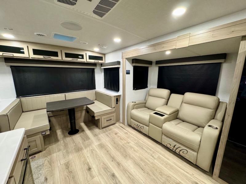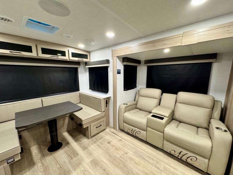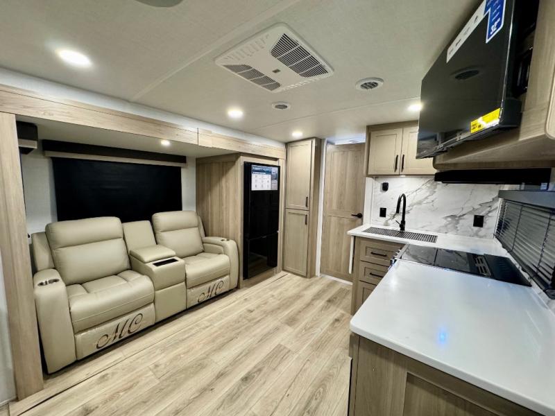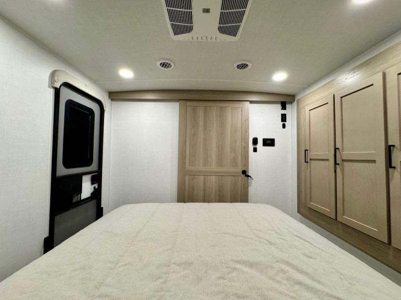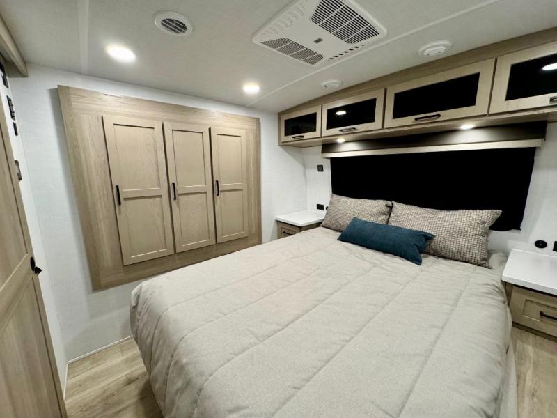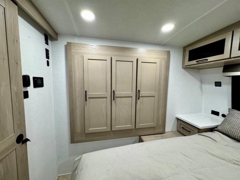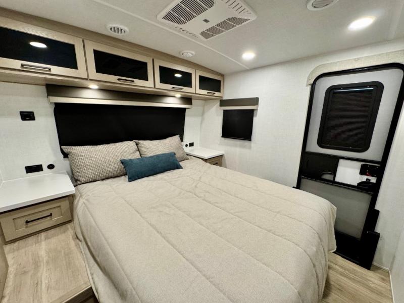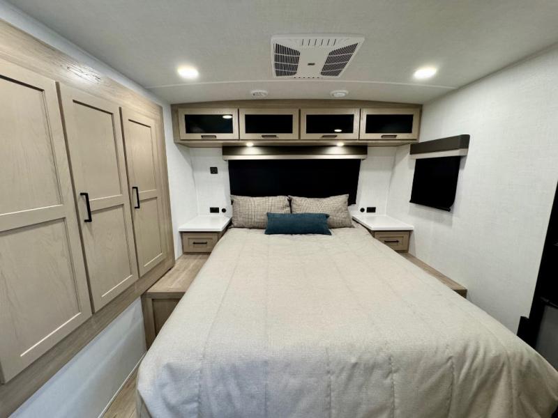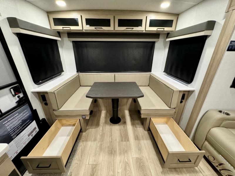 It will be so easy to enjoy time at the campground in this cozy travel trailer. The full kitchen includes a three burner gas oven, a microwave oven, and a 12V refrigerator to cook and store food, and the pantry will let you stock up on snacks. Your crew can get comfortable on the theater seat or around the rear U-shaped dinette, and there is a smart TV here to make it a movie night. The walk-thru bath will let you freshen up each day, and the queen bed in the front bedroom is sure to bring comfort. You will also find one of the dual entry doors here for convenience plus a wardrobe slide out for more storage and floor space. The exterior is just as accommodating with its pass-thru storage, 2" receiver hitch, and 21' power awning!