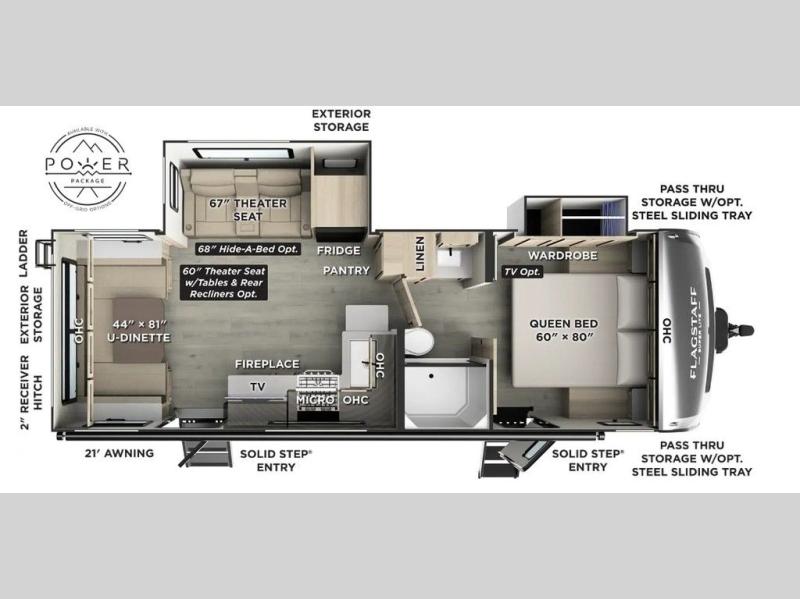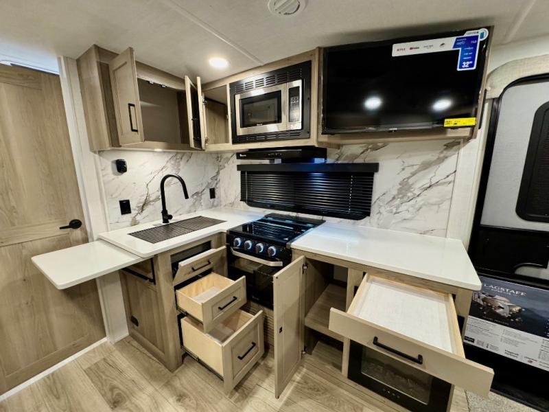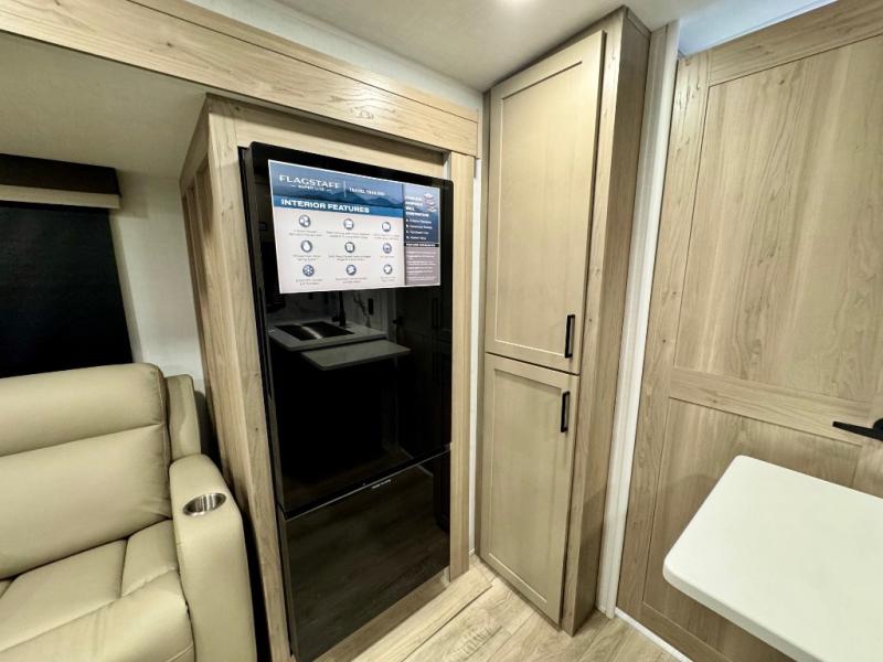 With any Flagstaff Super Lite travel trailer by Forest River, you can enjoy quality features with lightweight towing! The Climate Protection Package includes radiant foil in the front cap, underbelly, and slides, plus there are 12V thermostat-controlled heated tanks for added protection. The complete composite wall construction and 6-sided full-aluminum frame is ultra durable, and the RoadTech tire pressure monitoring adds safety. Each model also includes the Coast to Coast Package that comes with slam latch baggage doors, a high gloss fiberglass cap, Goodyear Endurance tires, plus a 200W solar panel with an optional additional 200W panel for more off grid capabilities. Inside, you'll love the roller shades, solid surface kitchen countertops, a shower miser system, and many more comforts!