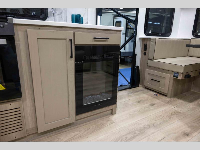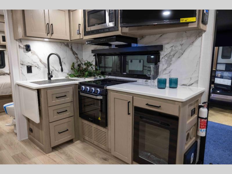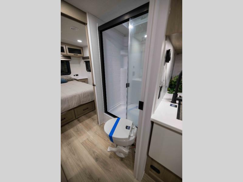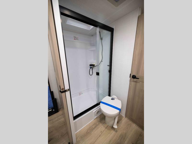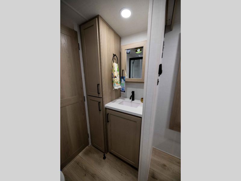It will be so easy to enjoy time at the campground in this cozy travel trailer. The full kitchen includes a three burner gas oven, a microwave oven, and a 12V refrigerator to cook and store food, and the pantry will let you stock up on snacks. Your crew can get comfortable on the theater seat or around the rear U-shaped dinette, and there is a smart TV here to make it a movie night. The walk-thru bath will let you freshen up each day, and the queen bed in the front bedroom is sure to bring comfort. You will also find one of the dual entry doors here for convenience plus a wardrobe slide out for more storage and floor space. The exterior is just as accommodating with its pass-thru storage, 2" receiver hitch, and 21' power awning!