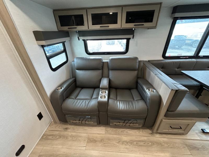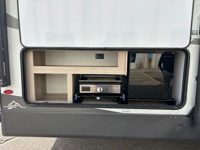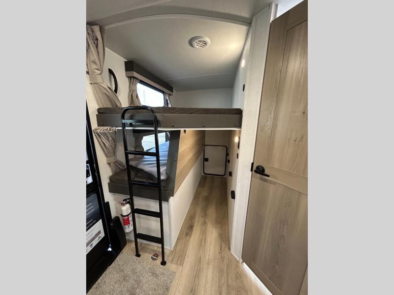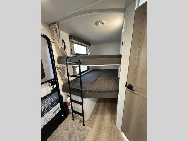 Get ready for a fun camping experience with your family and friends in this trailer that sleeps eight! From the rear double size bunks to the front bedroom's queen bed, and the furniture in the spacious main living area, everyone will find a place to lay their head at night. The cook will have full amenities inside and the choice to make meals on the outside kitchen when feeding everyone. There is abundant storage for your snacks and dry ingredients in the walk-in pantry, your cold items in the 12V refrigerator, and throughout the interior and along the exterior. You can load the larger gear in the front pass-thru storage with an optional steel sliding tray, and there is also an optional front door leading to the bedroom if you want even more convenience!