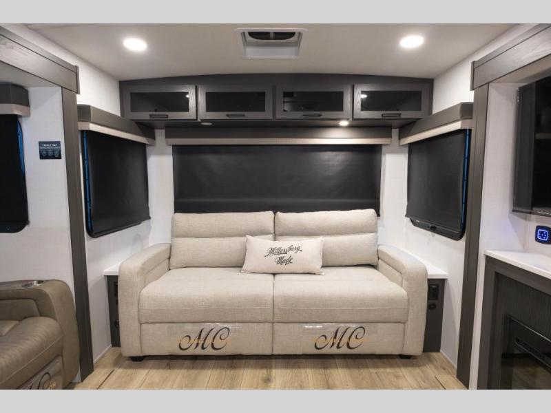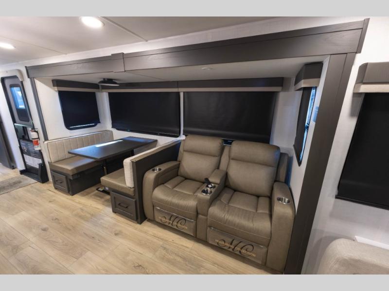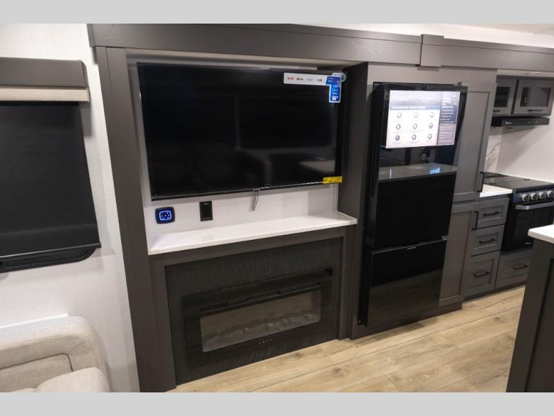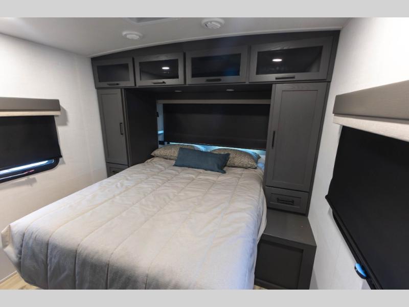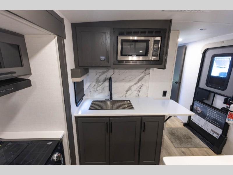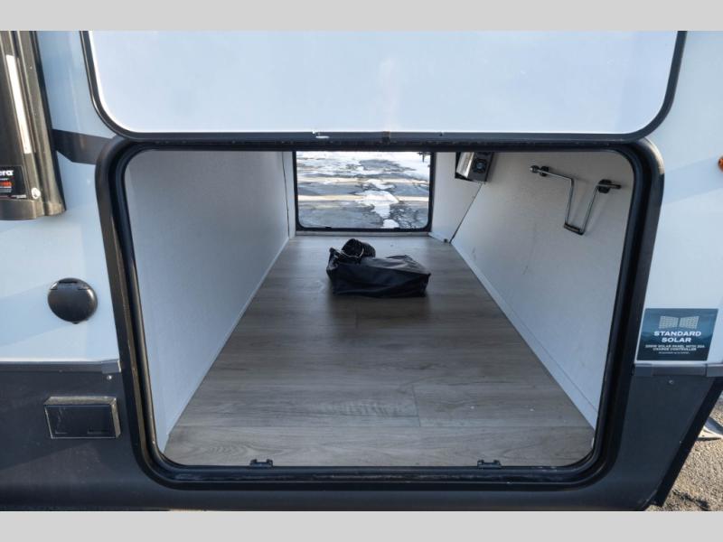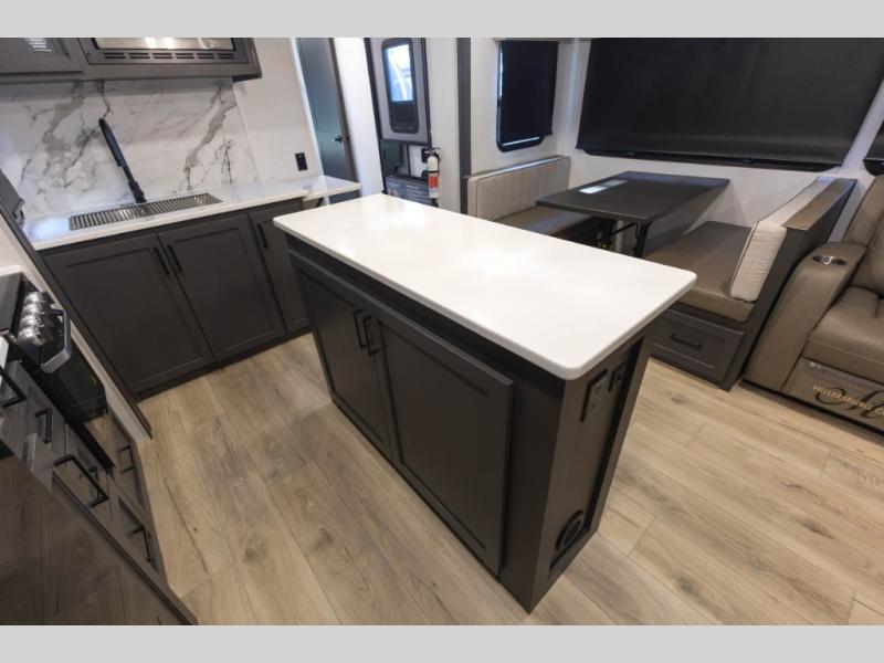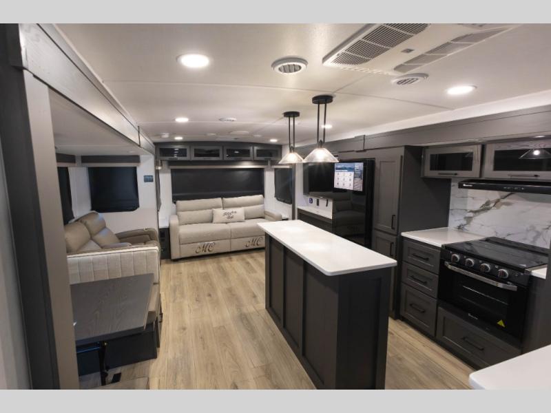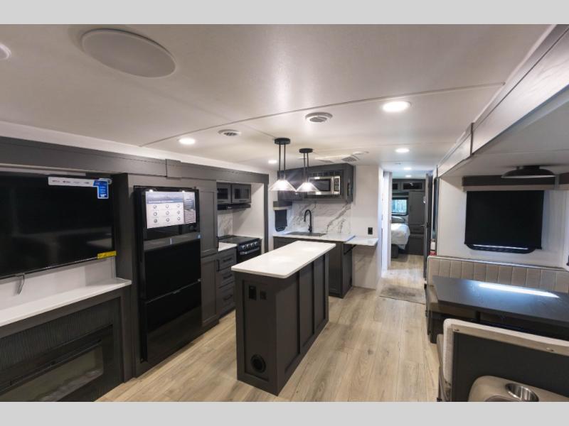 You'll feel right at home when staying in this spacious travel trailer. There are dual opposing slides in the combined kitchen and living area, and the large kitchen island will give the chef of your group more counter space to prep meals. Your crew can dine at the booth dinette, relax on the theater seat, and sleep on the hide-a-bed sofa. You'll find your own space in the front private bedroom that includes a queen bed, triple wardrobes, and a TV option. Head outdoors to find two power awnings, a rear 2" receiver hitch, and a pass-thru storage with an optional steel sliding tray.