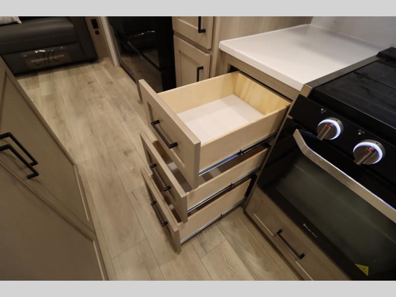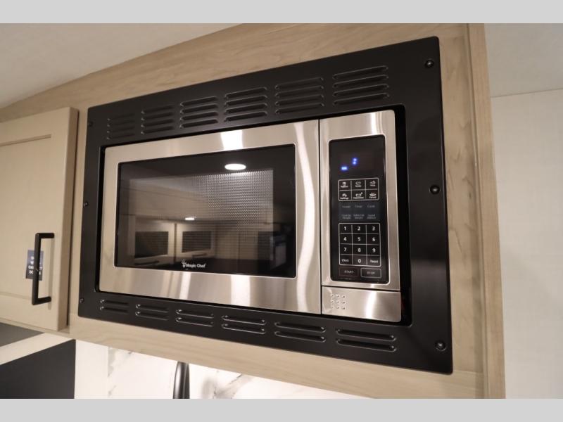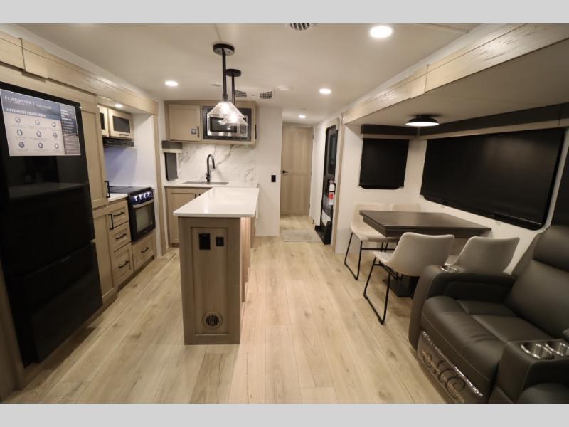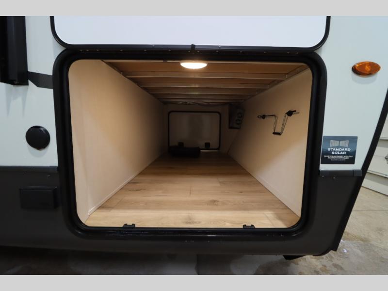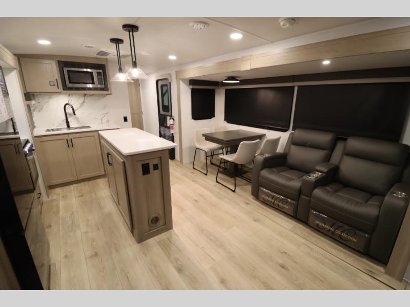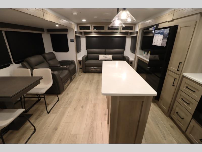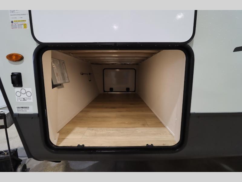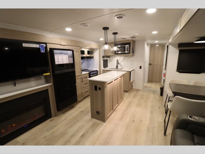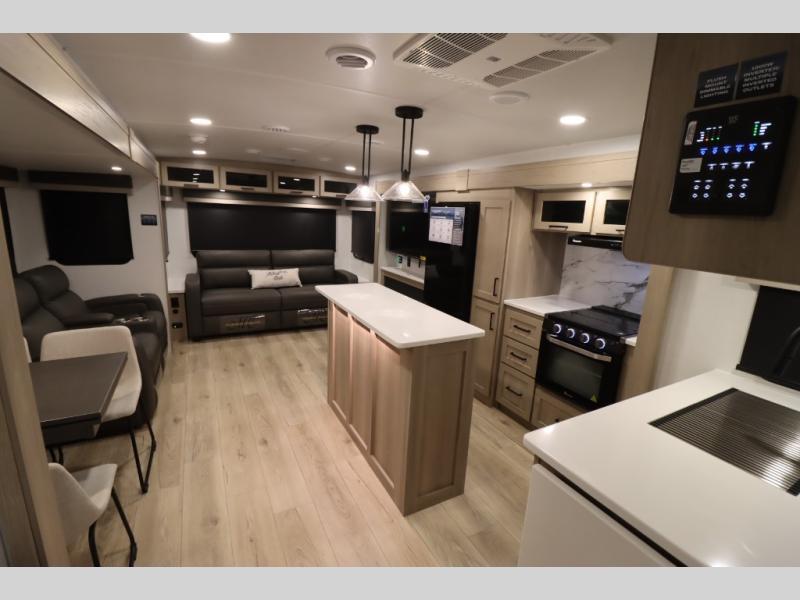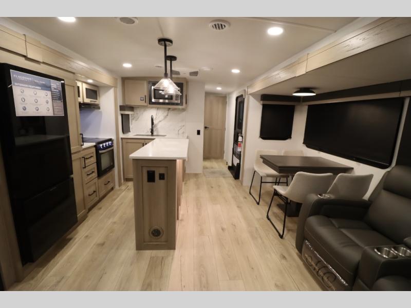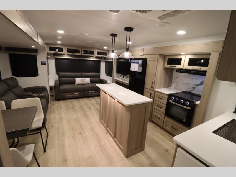 You'll feel right at home when staying in this spacious travel trailer. There are dual opposing slides in the combined kitchen and living area, and the large kitchen island will give the chef of your group more counter space to prep meals. Your crew can dine at the booth dinette, relax on the theater seat, and sleep on the hide-a-bed sofa. You'll find your own space in the front private bedroom that includes a queen bed, triple wardrobes, and a TV option. Head outdoors to find two power awnings, a rear 2" receiver hitch, and a pass-thru storage with an optional steel sliding tray.