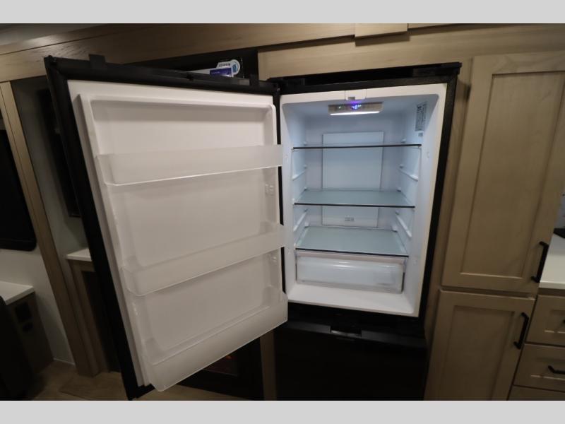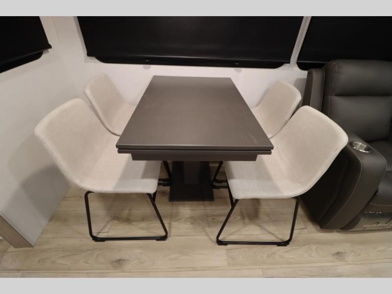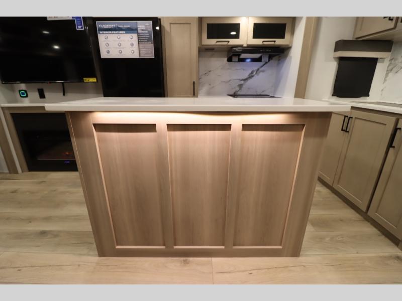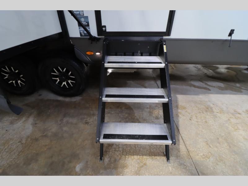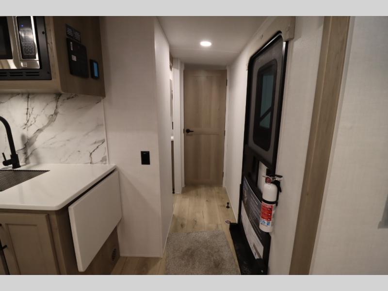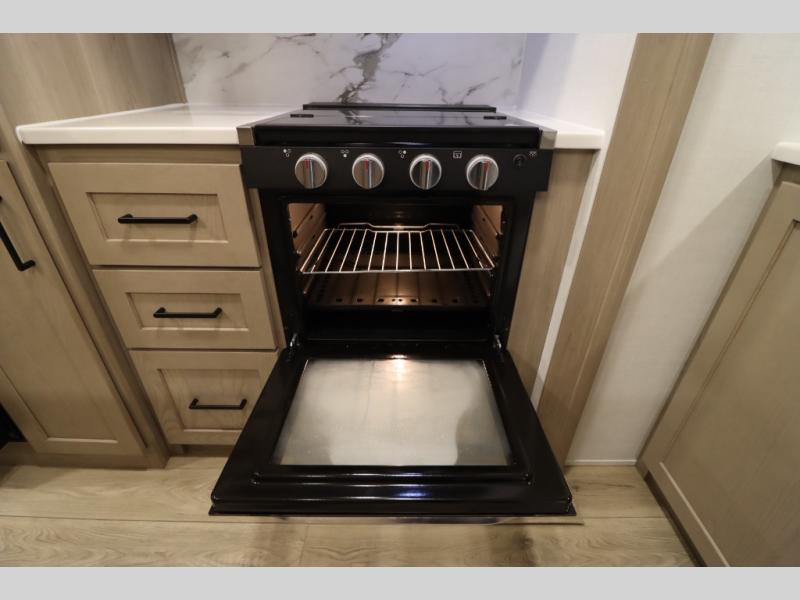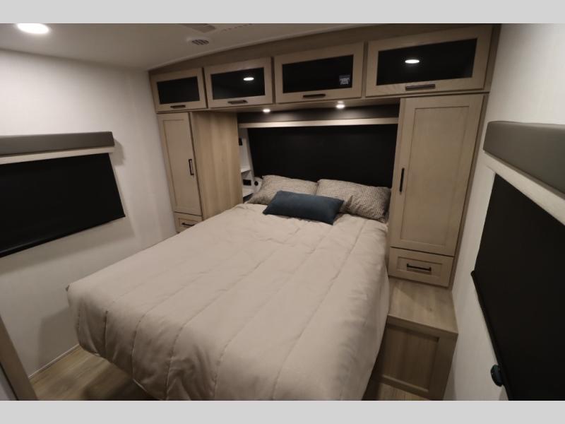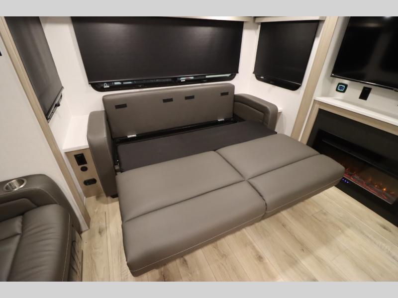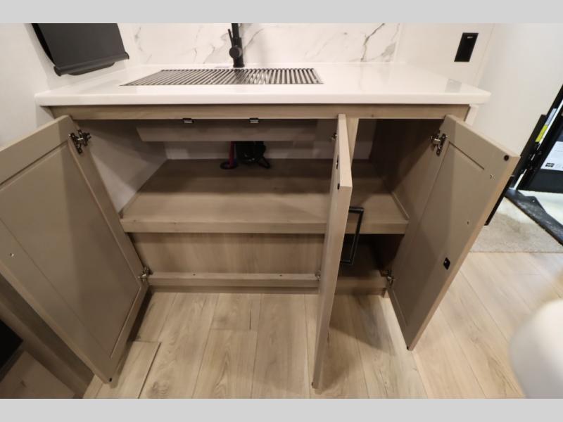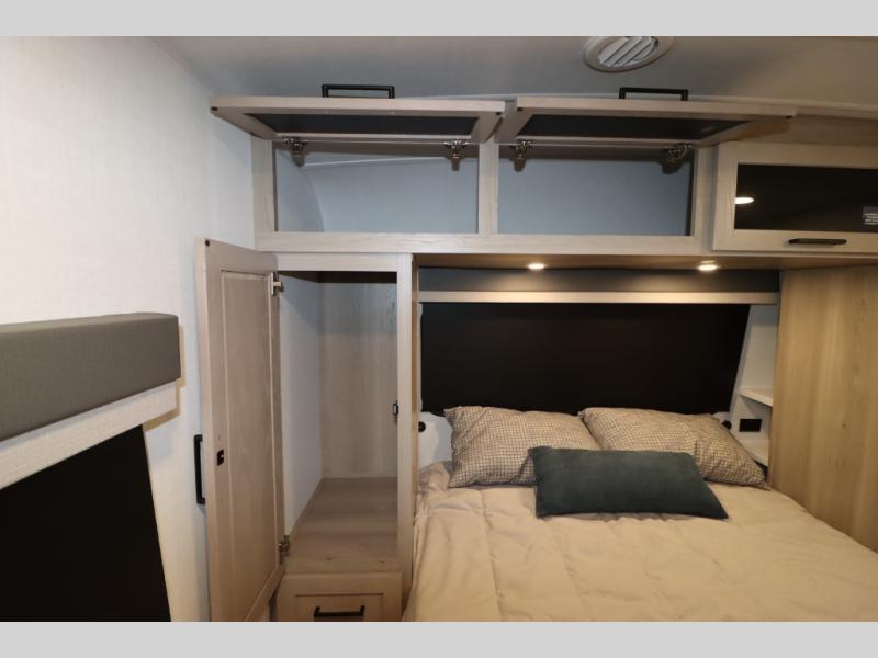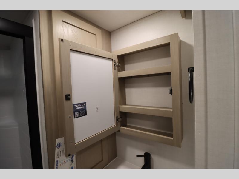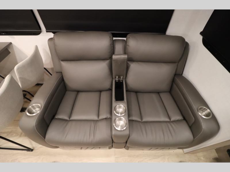 You'll feel right at home when staying in this spacious travel trailer. There are dual opposing slides in the combined kitchen and living area, and the large kitchen island will give the chef of your group more counter space to prep meals. Your crew can dine at the booth dinette, relax on the theater seat, and sleep on the hide-a-bed sofa. You'll find your own space in the front private bedroom that includes a queen bed, triple wardrobes, and a TV option. Head outdoors to find two power awnings, a rear 2" receiver hitch, and a pass-thru storage with an optional steel sliding tray.