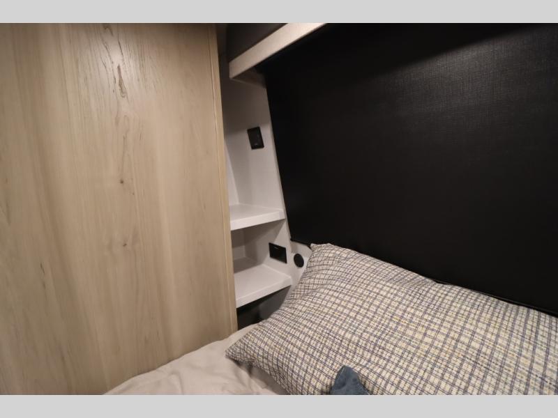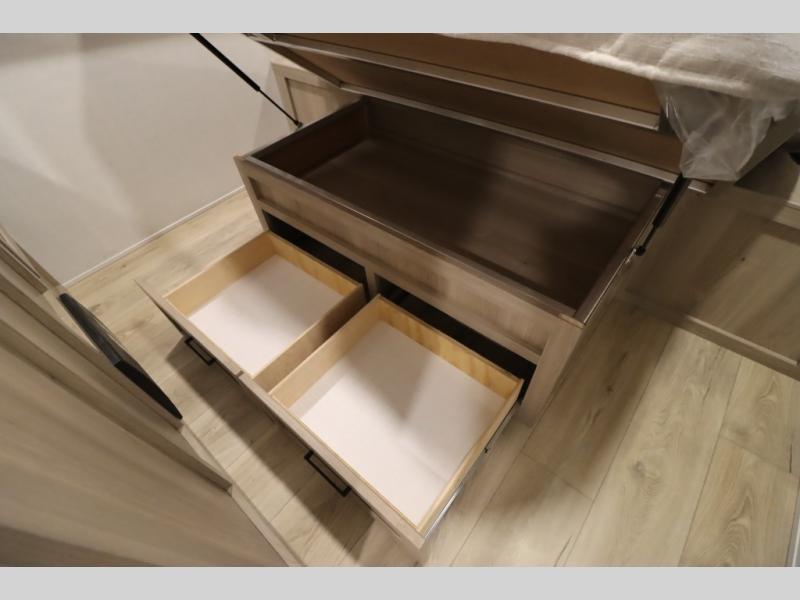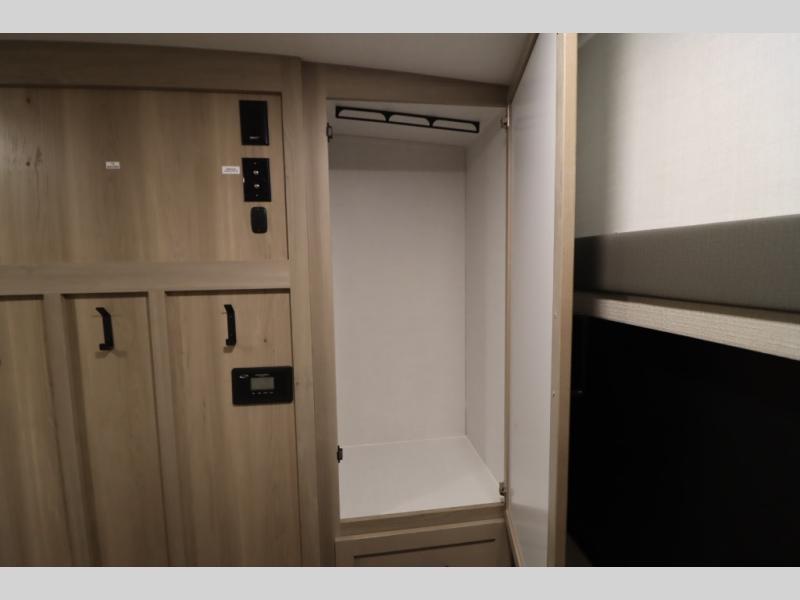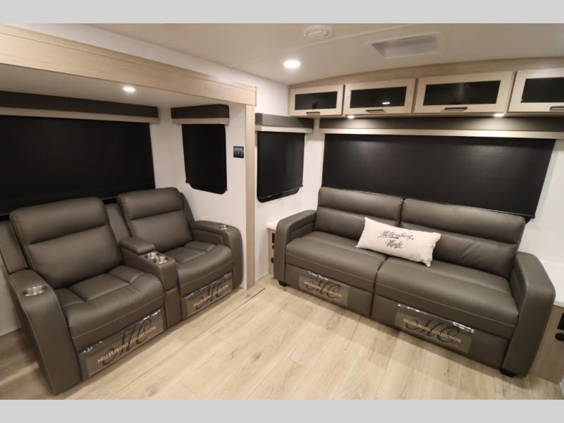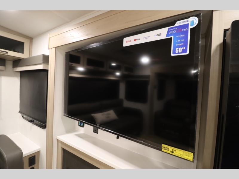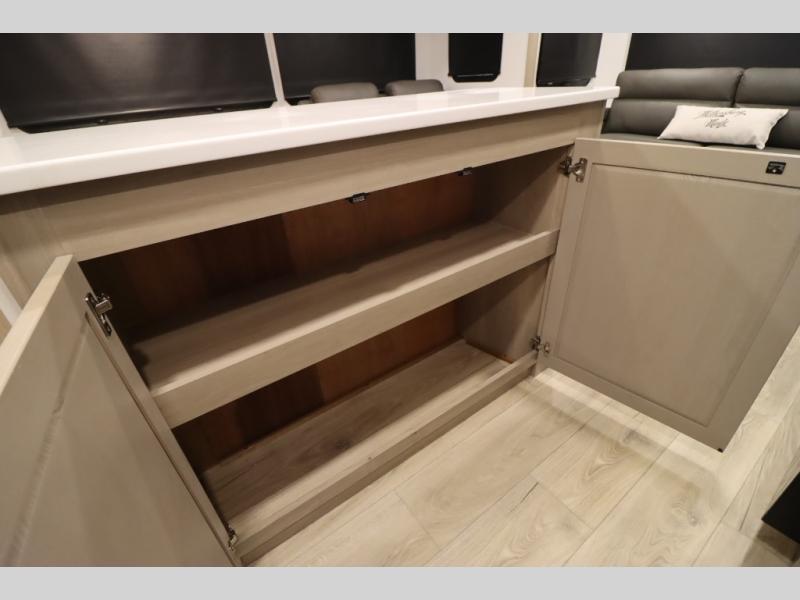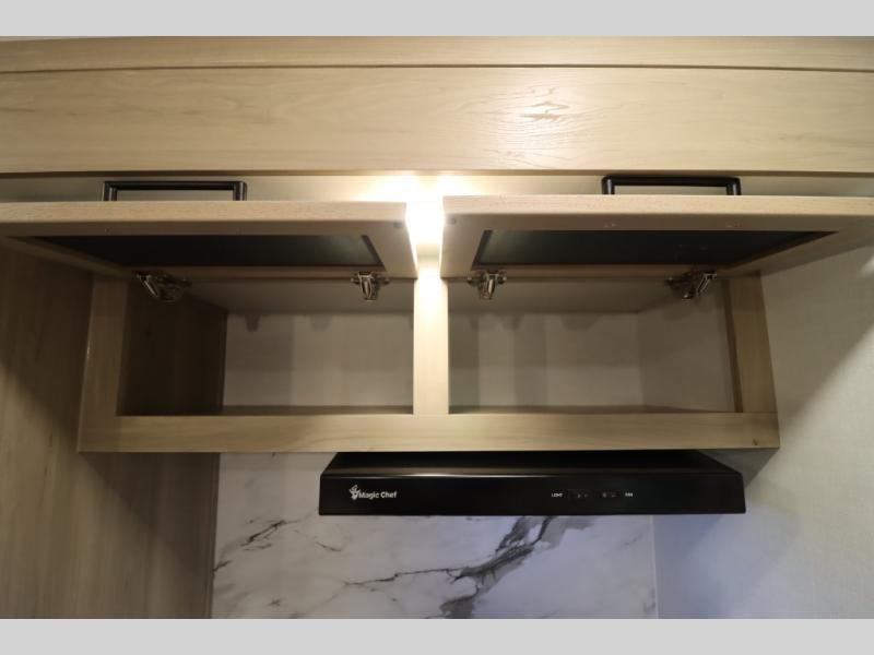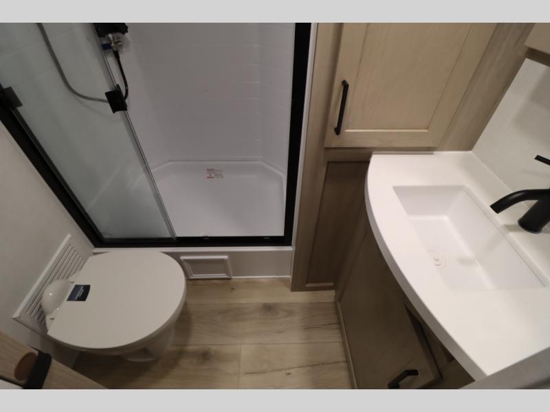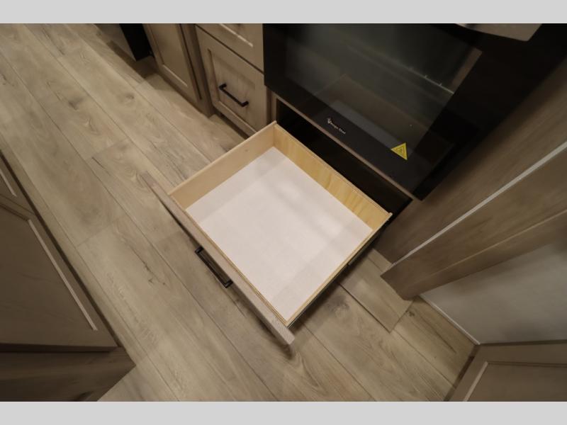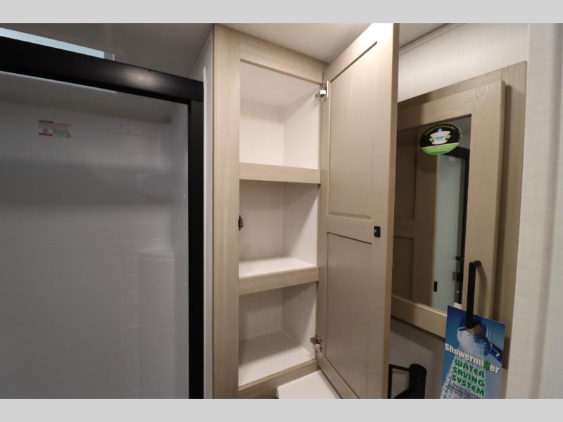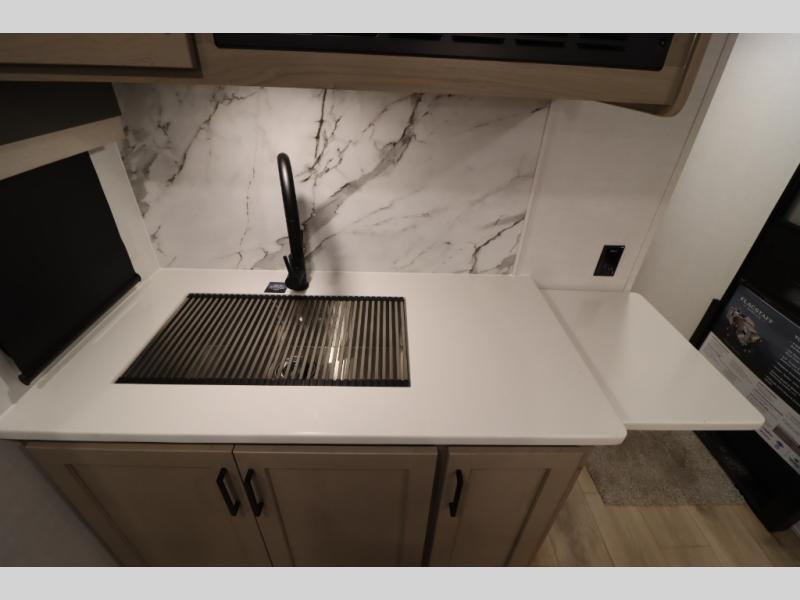 You'll feel right at home when staying in this spacious travel trailer. There are dual opposing slides in the combined kitchen and living area, and the large kitchen island will give the chef of your group more counter space to prep meals. Your crew can dine at the booth dinette, relax on the theater seat, and sleep on the hide-a-bed sofa. You'll find your own space in the front private bedroom that includes a queen bed, triple wardrobes, and a TV option. Head outdoors to find two power awnings, a rear 2" receiver hitch, and a pass-thru storage with an optional steel sliding tray.