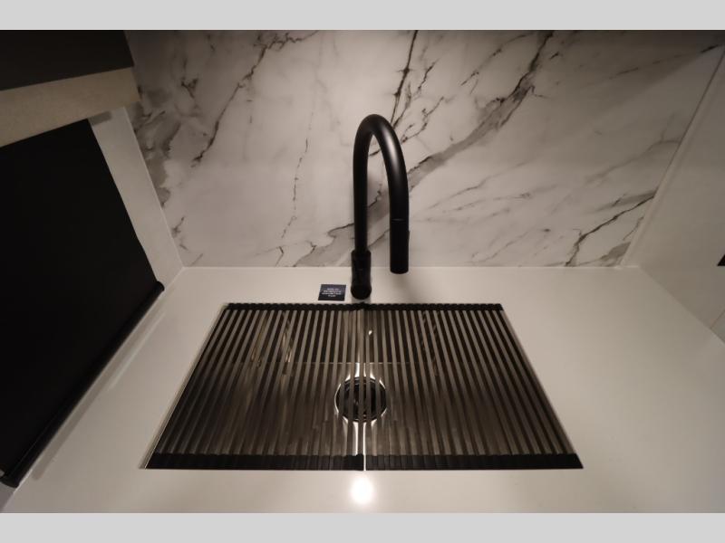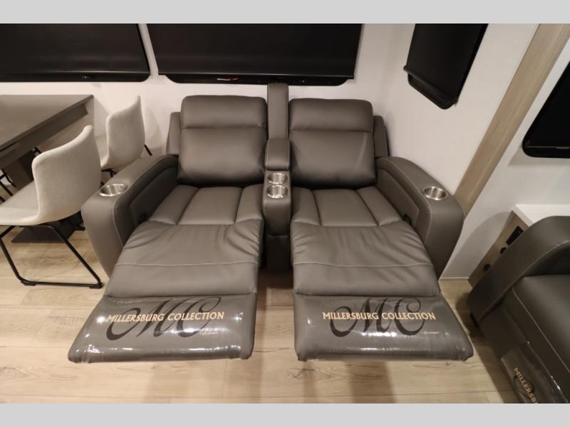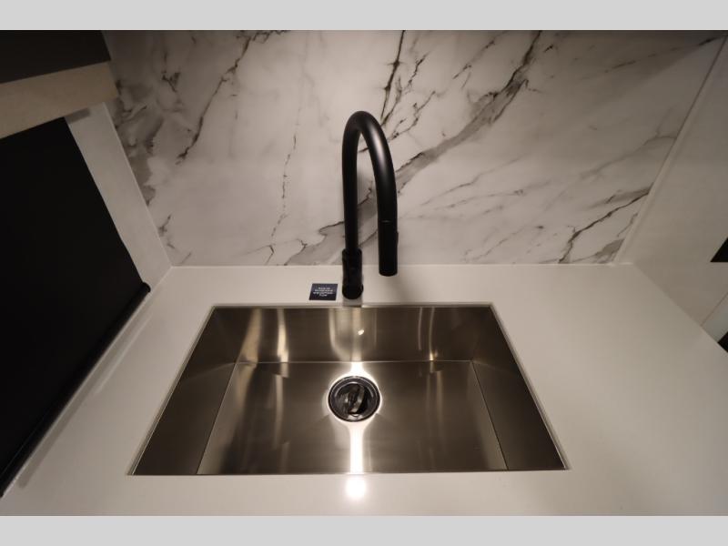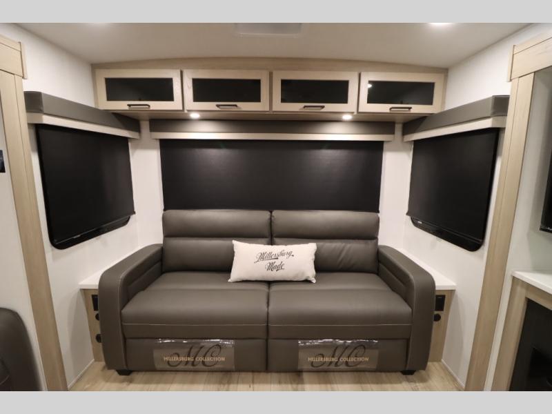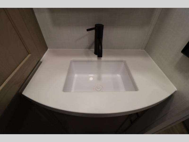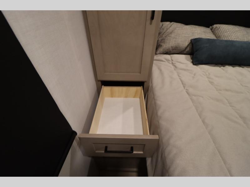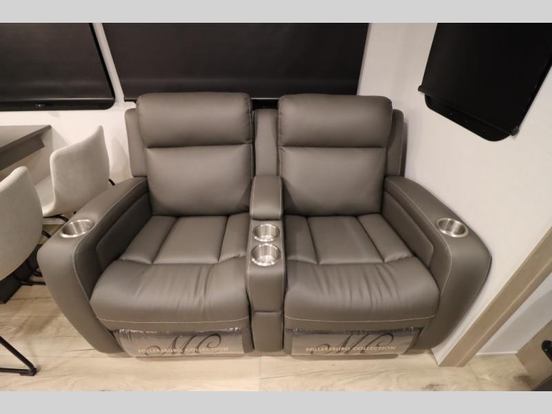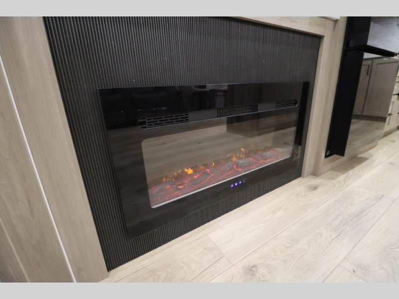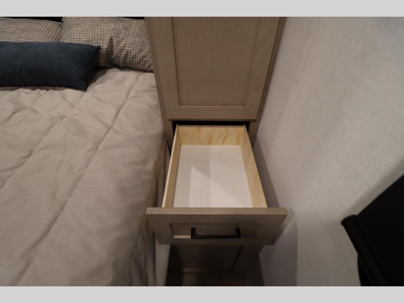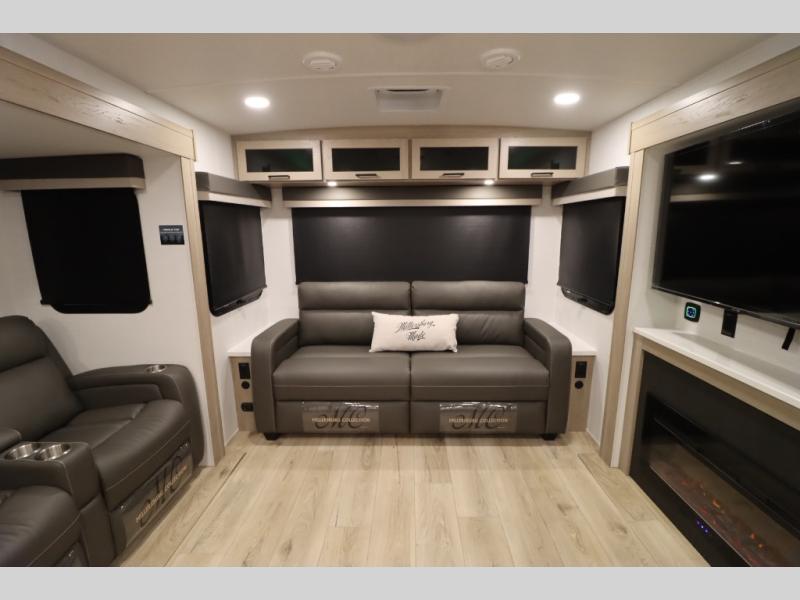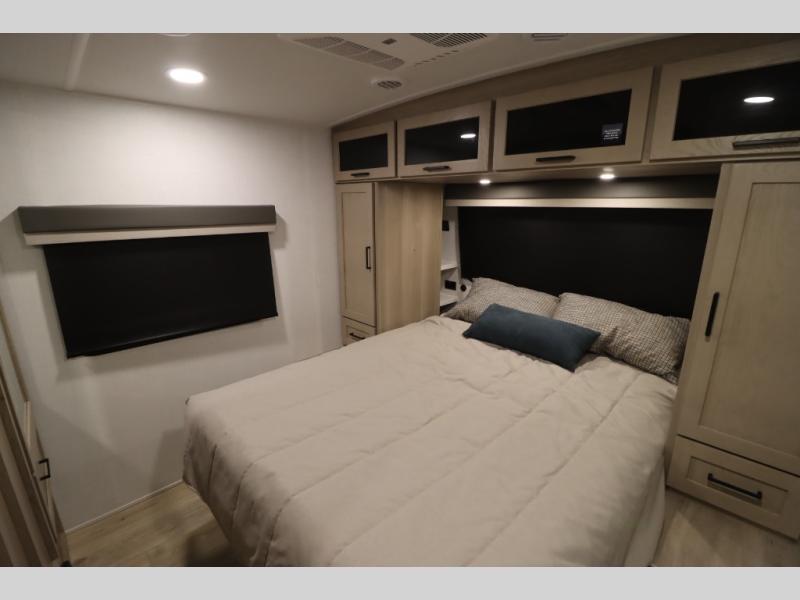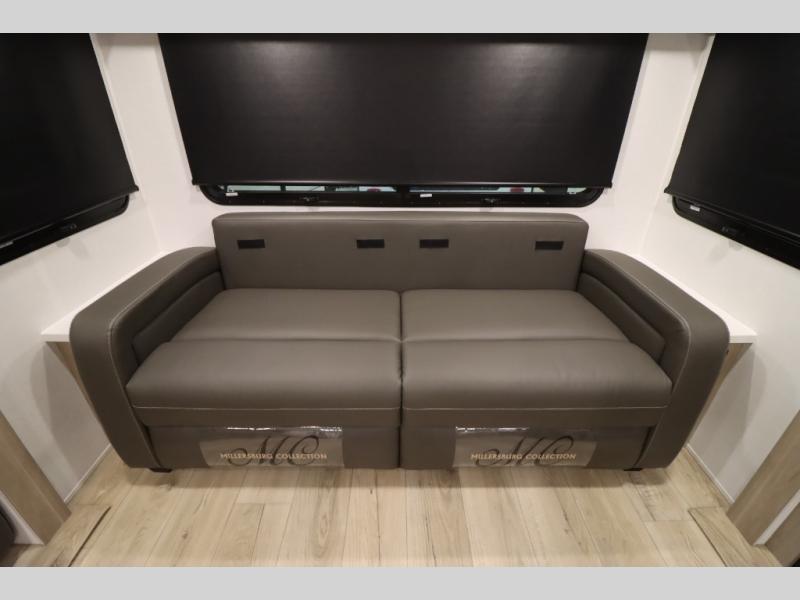 You'll feel right at home when staying in this spacious travel trailer. There are dual opposing slides in the combined kitchen and living area, and the large kitchen island will give the chef of your group more counter space to prep meals. Your crew can dine at the booth dinette, relax on the theater seat, and sleep on the hide-a-bed sofa. You'll find your own space in the front private bedroom that includes a queen bed, triple wardrobes, and a TV option. Head outdoors to find two power awnings, a rear 2" receiver hitch, and a pass-thru storage with an optional steel sliding tray.