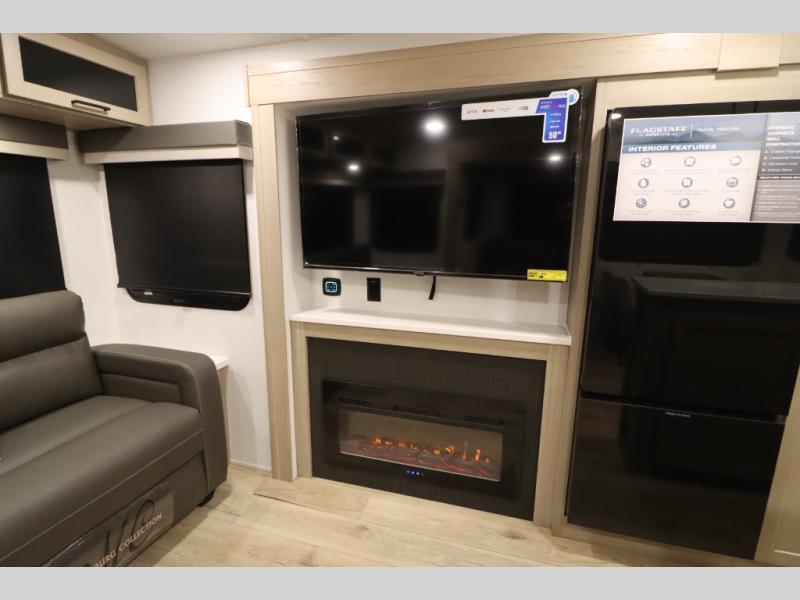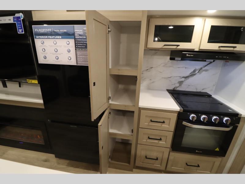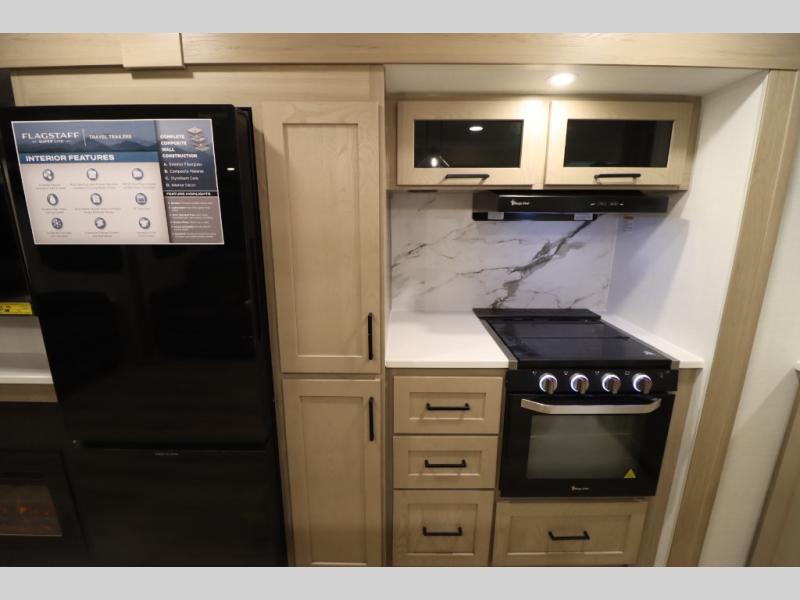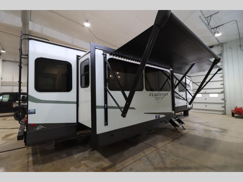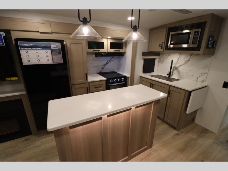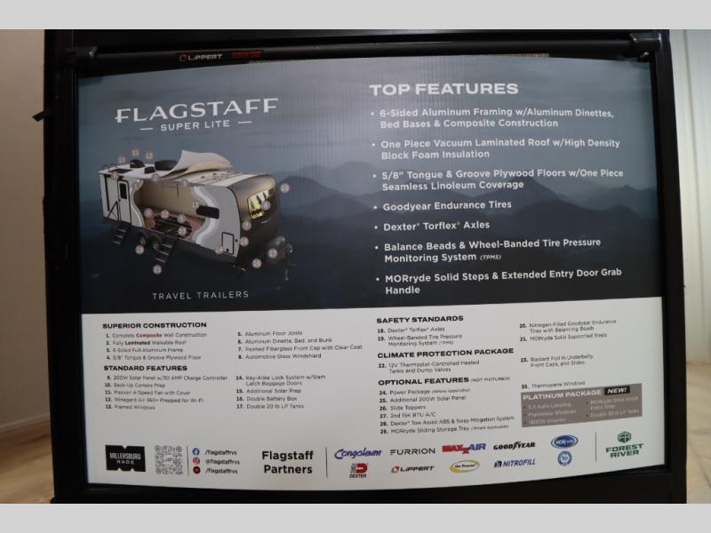 With any Flagstaff Super Lite travel trailer by Forest River, you can enjoy quality features with lightweight towing! The Climate Protection Package includes radiant foil in the front cap, underbelly, and slides, plus there are 12V thermostat-controlled heated tanks for added protection. The complete composite wall construction and 6-sided full-aluminum frame is ultra durable, and the RoadTech tire pressure monitoring adds safety. Each model also includes the Coast to Coast Package that comes with slam latch baggage doors, a high gloss fiberglass cap, Goodyear Endurance tires, plus a 200W solar panel with an optional additional 200W panel for more off grid capabilities. Inside, you'll love the roller shades, solid surface kitchen countertops, a shower miser system, and many more comforts!
