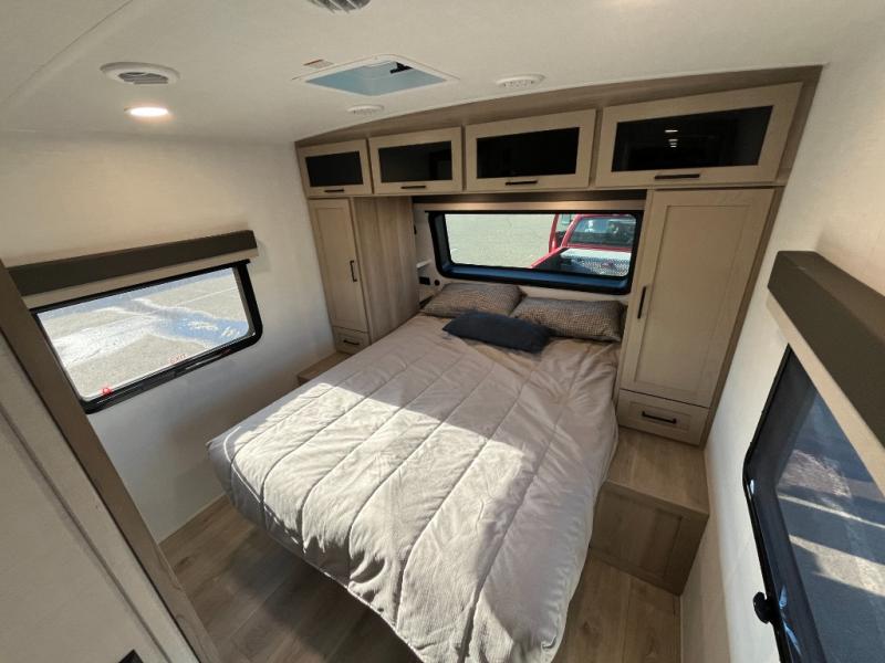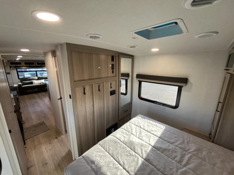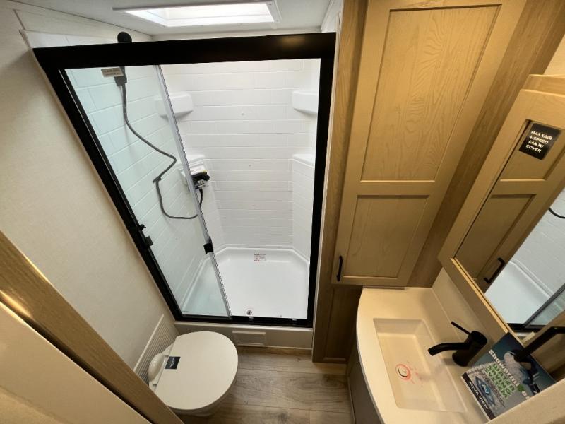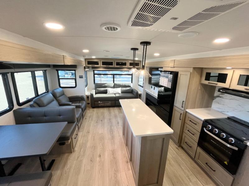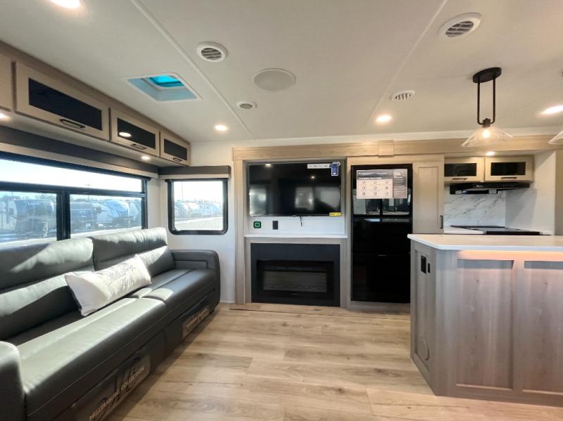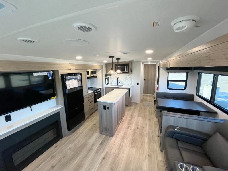 You'll feel right at home when staying in this spacious travel trailer. There are dual opposing slides in the combined kitchen and living area, and the large kitchen island will give the chef of your group more counter space to prep meals. Your crew can dine at the booth dinette, relax on the theater seat, and sleep on the hide-a-bed sofa. You'll find your own space in the front private bedroom that includes a queen bed, triple wardrobes, and a TV option. Head outdoors to find two power awnings, a rear 2" receiver hitch, and a pass-thru storage with an optional steel sliding tray.