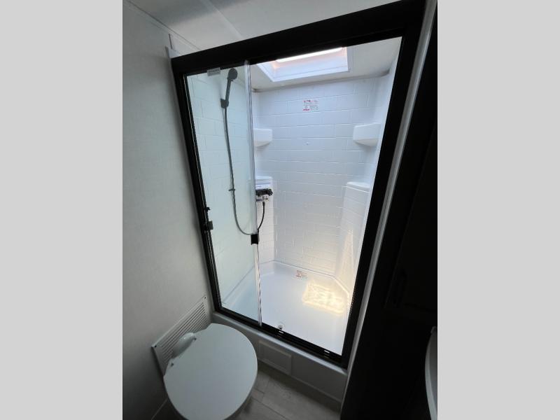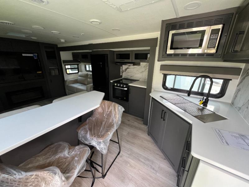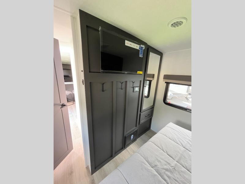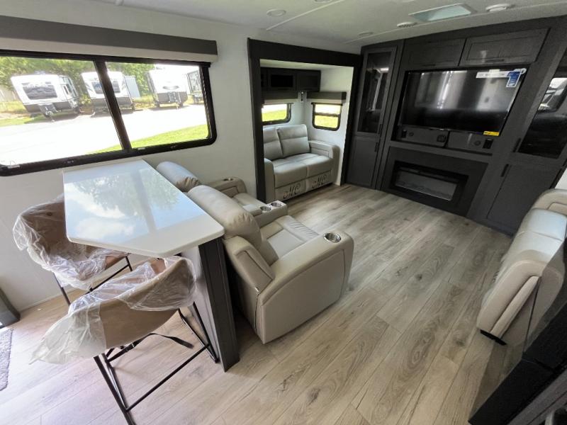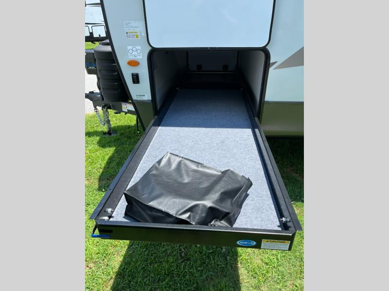 Weekends at the lake are made easy in this spacious travel trailer that can sleep six each night. Once you arrive at the campsite, unload your things from the pass-thru storage with an optional steel sliding tray, set up the 19' power awning, then head out on a trail to stretch your legs. You can freshen up in the full bath when you return before preparing lunch for everyone. A three burner cooktop comes standard, along with a gas oven and microwave oven, and there is a table with bar stools that overlooks the rear living area for those who want to relax. Your guests can convert the rear living area into their bedroom at night since there are dual hide-a-bed sofas, and the rear entertainment center includes a Smart TV so they can watch a movie in bed. And check out the private bedroom with a queen bed, triple wardrobes, and a TV option if you enjoy watching movies in bed.