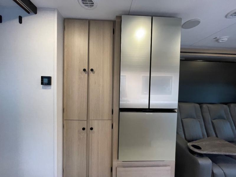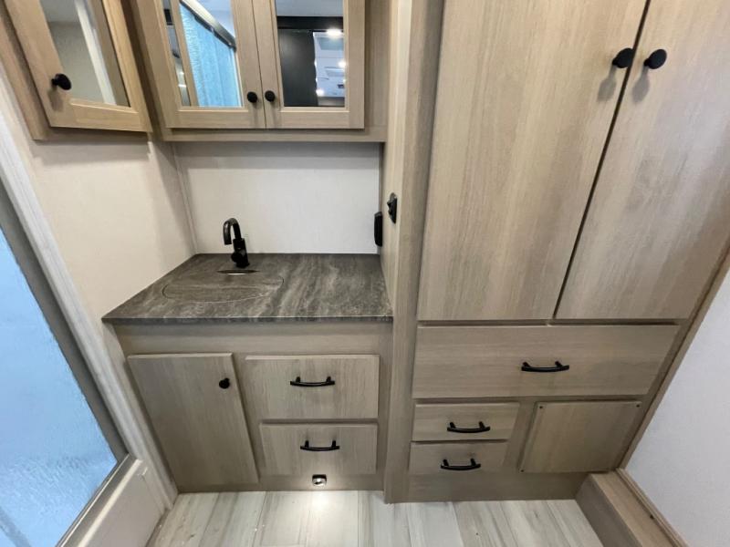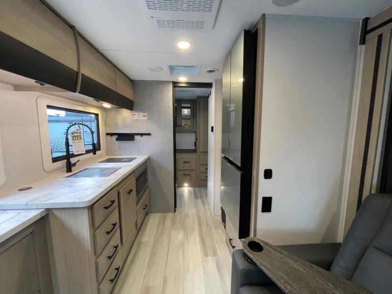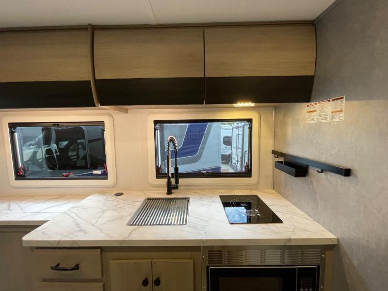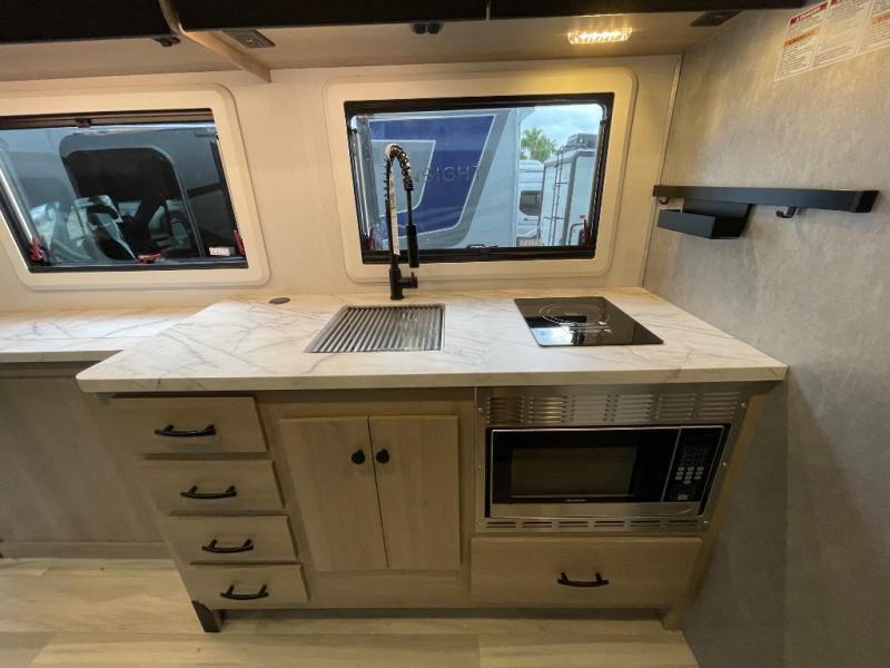 Trips across the state are made cozy in this single slide out coach for two! Once you've parked for the day, you can make lunch on the recessed induction cooktop or in the convection microwave. The sofa slide out provides a place to relax, and the Murphy bed can be folded out when you're ready for some shut-eye. You will appreciate how spacious the full rear bath is, and there is a wardrobe plus a linen closet here for ample storage. The cab-over bunk is only available with the Trekker Cap option; see dealer for more details.