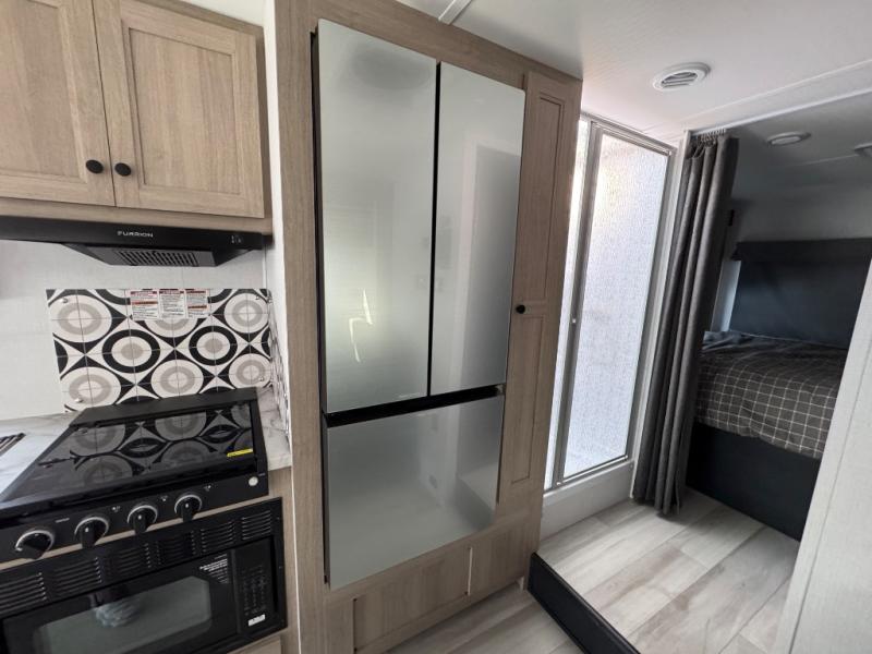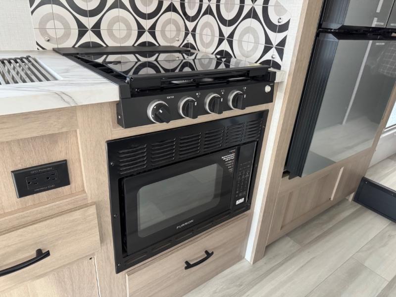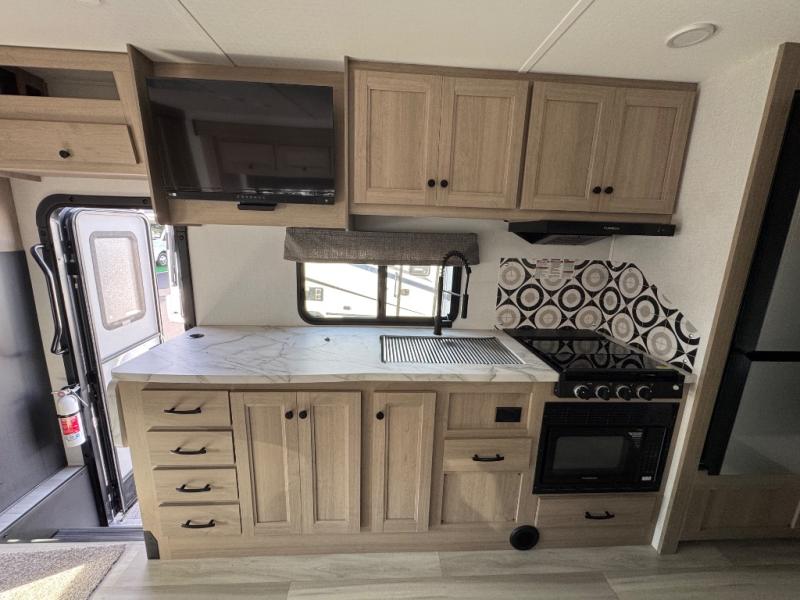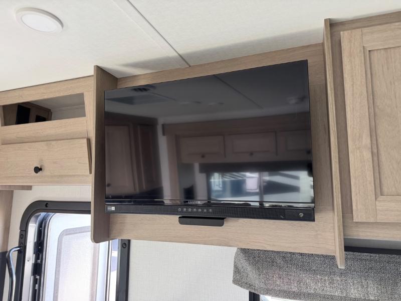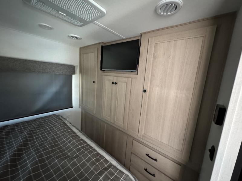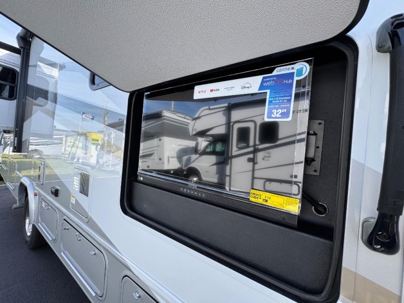 Escape the hustle and bustle of everyday life with this motorhome! It features a 60" x 80" bunk over cab mat which can be switched out for an optional Trekker cap with a built-in entertainment center. The sofa and U-shaped dinette slide offer comfortable places to enjoy meals, socialize, and even sleep once converted. Prepare your best meals with the 10.7 cu. ft. 12V refrigerator, the three burner cooktop, the flip-up countertop, and even the 1.3 cu. ft. undermount convection microwave. The separated bathroom has a 24" x 36" shower across from a toilet with a sink and countertop space, plus it leads directly into the rear private bedroom which has a 60" x 74" queen bed slide across from a linen/12V TV area with wardrobes on either side. You can even add an optional outside 12V TV and stay protected by the 15' 6" power awning!