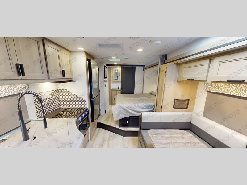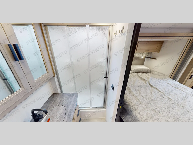 You will feel right at home traveling in this motorhome! The full rear bathroom has a 24" x 36" shower to freshen up in, plus storage space and a private toilet so you both can use this room at once. Inside the bedroom is a 60" x 74" queen bed slide with a wedge mattress for more space, and a 12V TV for movies in bed. Prepare your best meals with the three burner cooktop and the 10.7 cu. ft. 12V refrigerator or throw some leftovers in the undermount 1.3 cu. ft. convection microwave, then enjoy it at the U-shaped dinette slide. The 60" x 80" bunk over cab mat offers a comfortable place to sleep but if you don't need the extra sleeping space, you can switch it out for the optional Trekker cap with a built-in entertainment center, plus there is an optional outside 12V TV to add!