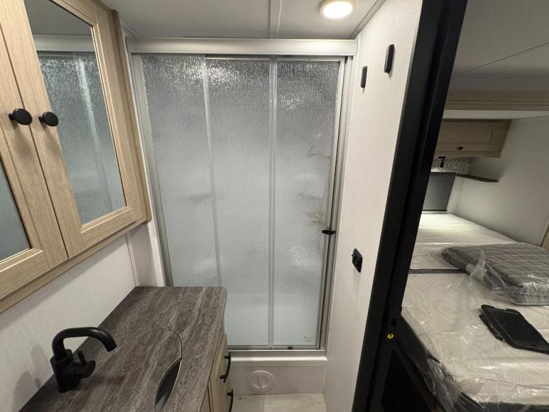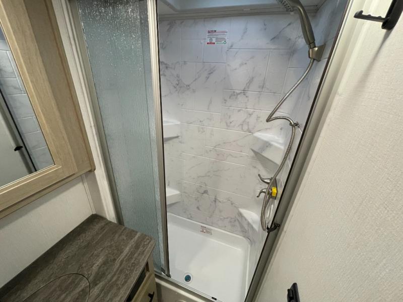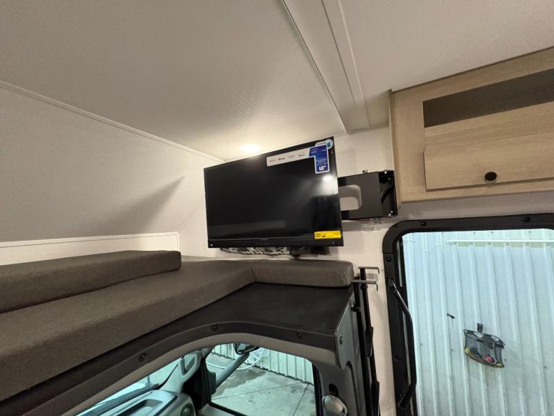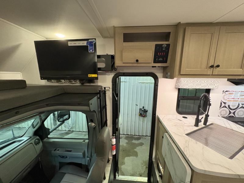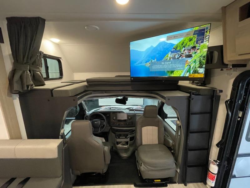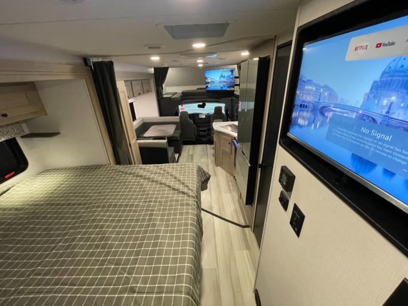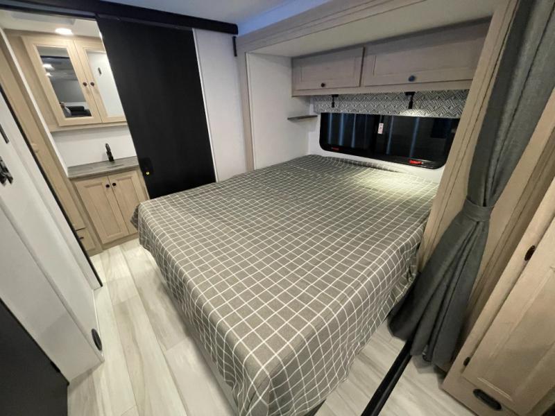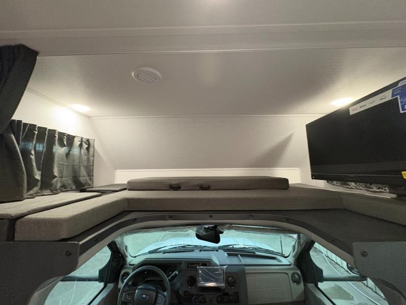 You will feel right at home traveling in this motorhome! The full rear bathroom has a 24" x 36" shower to freshen up in, plus storage space and a private toilet so you both can use this room at once. Inside the bedroom is a 60" x 74" queen bed slide with a wedge mattress for more space, and a 12V TV for movies in bed. Prepare your best meals with the three burner cooktop and the 10.7 cu. ft. 12V refrigerator or throw some leftovers in the undermount 1.3 cu. ft. convection microwave, then enjoy it at the U-shaped dinette slide. The 60" x 80" bunk over cab mat offers a comfortable place to sleep but if you don't need the extra sleeping space, you can switch it out for the optional Trekker cap with a built-in entertainment center, plus there is an optional outside 12V TV to add!