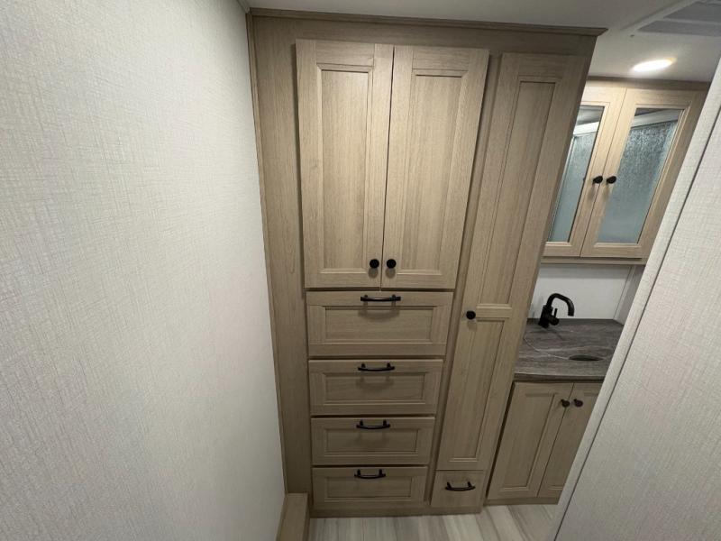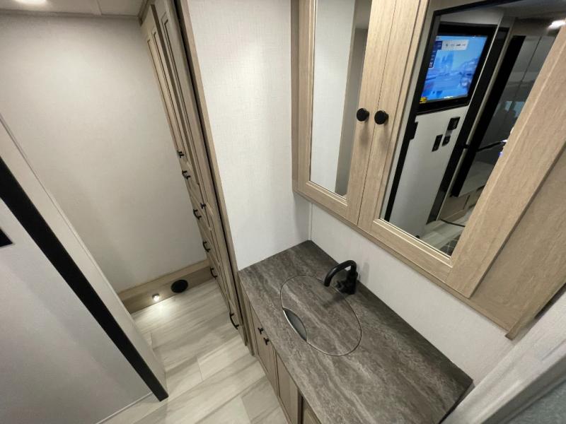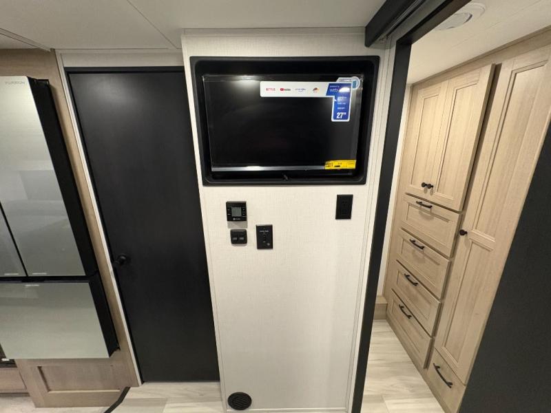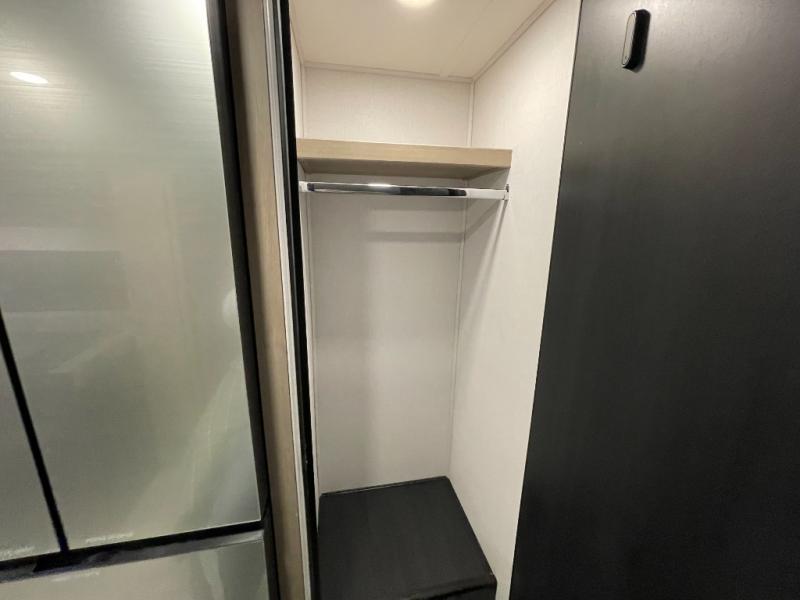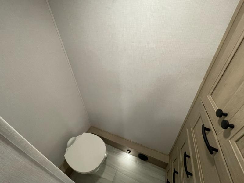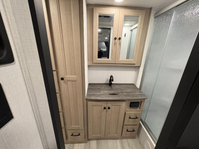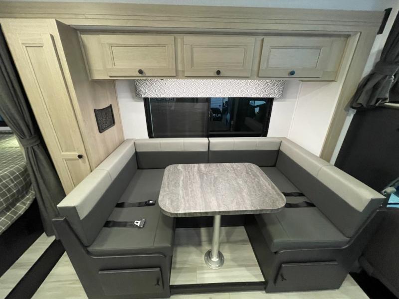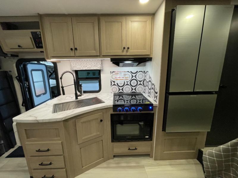 You will feel right at home traveling in this motorhome! The full rear bathroom has a 24" x 36" shower to freshen up in, plus storage space and a private toilet so you both can use this room at once. Inside the bedroom is a 60" x 74" queen bed slide with a wedge mattress for more space, and a 12V TV for movies in bed. Prepare your best meals with the three burner cooktop and the 10.7 cu. ft. 12V refrigerator or throw some leftovers in the undermount 1.3 cu. ft. convection microwave, then enjoy it at the U-shaped dinette slide. The 60" x 80" bunk over cab mat offers a comfortable place to sleep but if you don't need the extra sleeping space, you can switch it out for the optional Trekker cap with a built-in entertainment center, plus there is an optional outside 12V TV to add!
