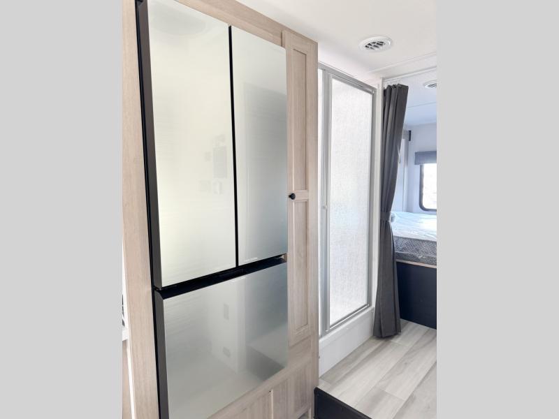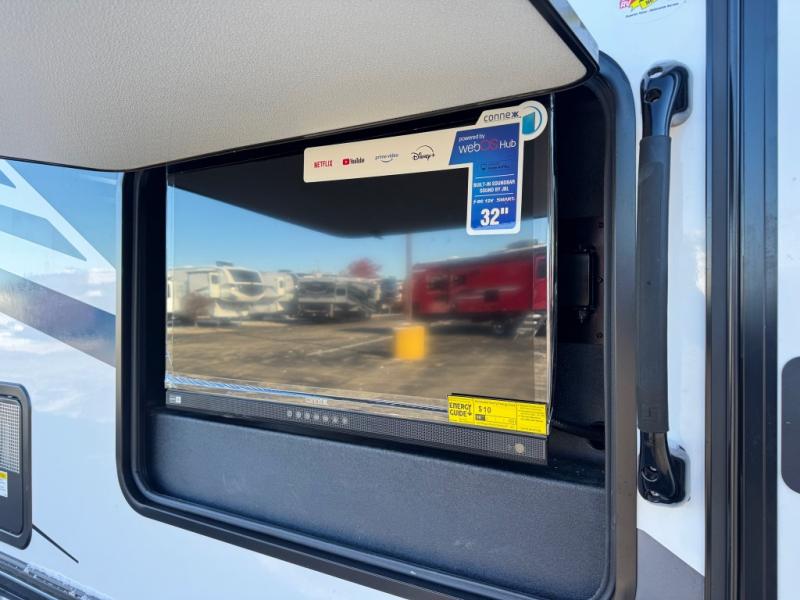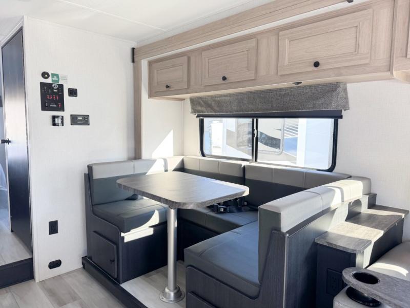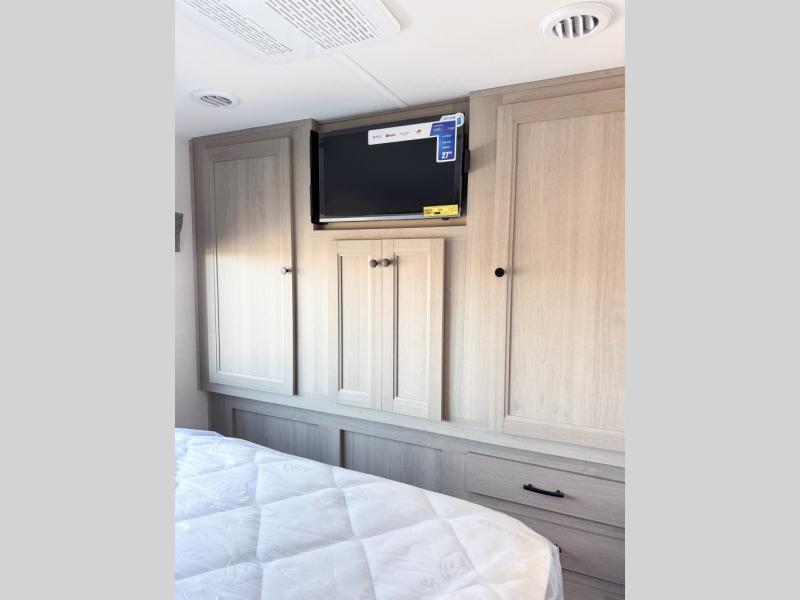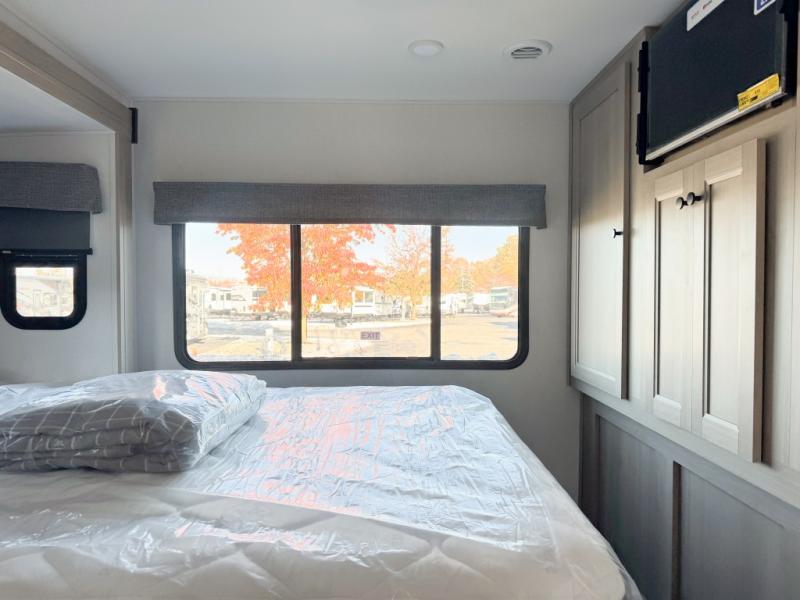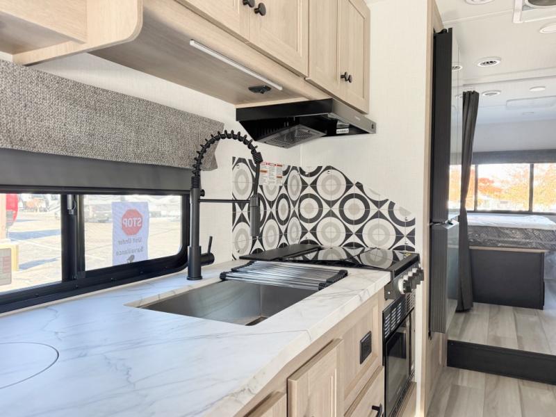 Escape the hustle and bustle of everyday life with this motorhome! It features a 60" x 80" bunk over cab mat which can be switched out for an optional Trekker cap with a built-in entertainment center. The sofa and U-shaped dinette slide offer comfortable places to enjoy meals, socialize, and even sleep once converted. Prepare your best meals with the 10.7 cu. ft. 12V refrigerator, the three burner cooktop, the flip-up countertop, and even the 1.3 cu. ft. undermount convection microwave. The separated bathroom has a 24" x 36" shower across from a toilet with a sink and countertop space, plus it leads directly into the rear private bedroom which has a 60" x 74" queen bed slide across from a linen/12V TV area with wardrobes on either side. You can even add an optional outside 12V TV and stay protected by the 15' 6" power awning!