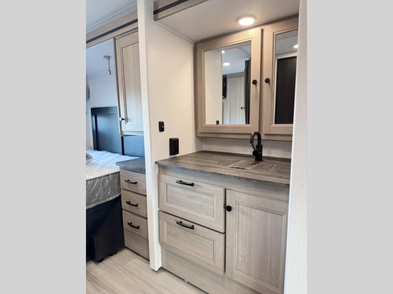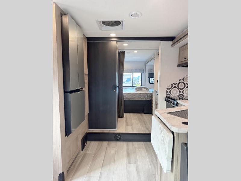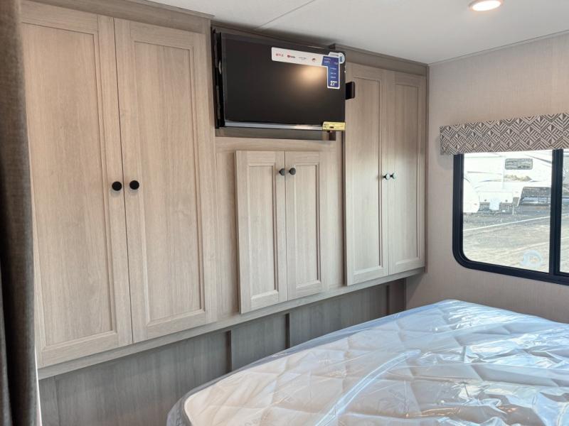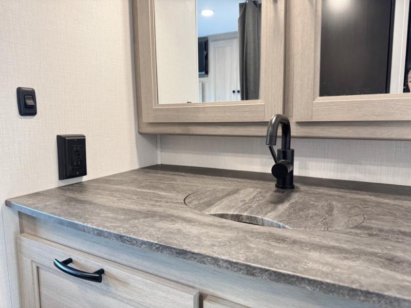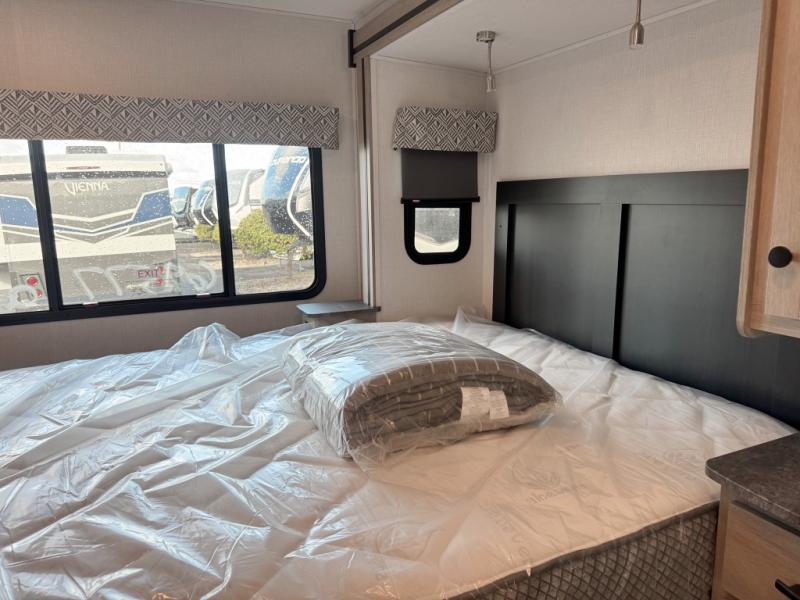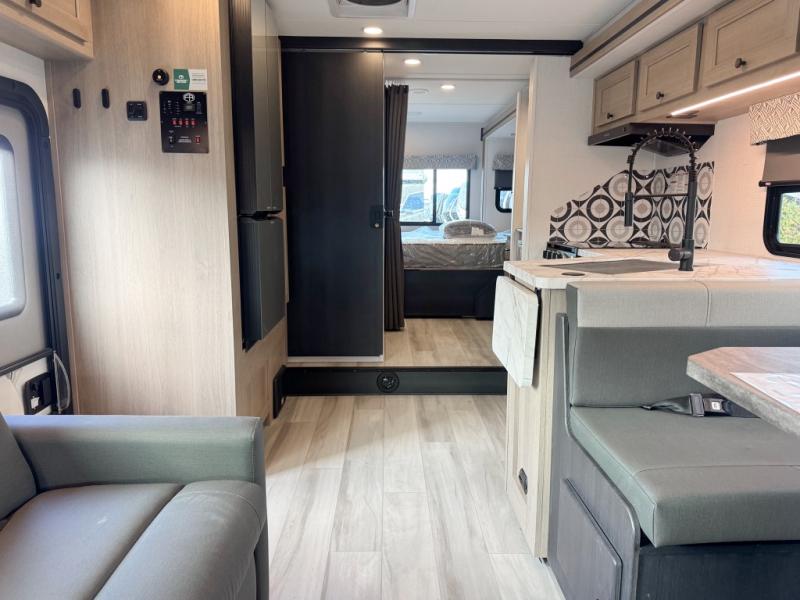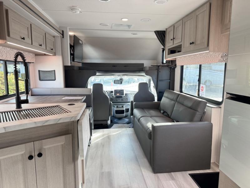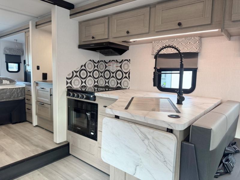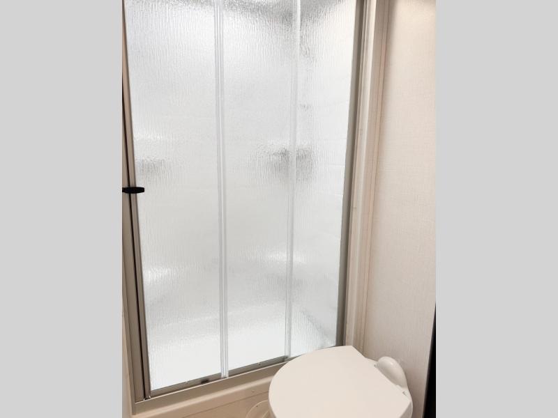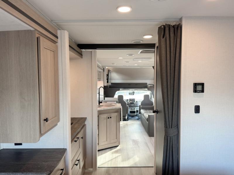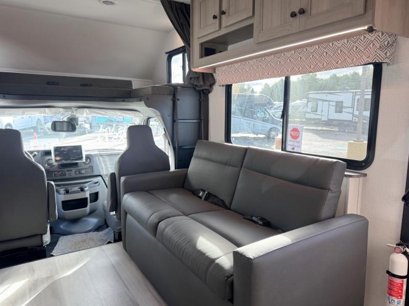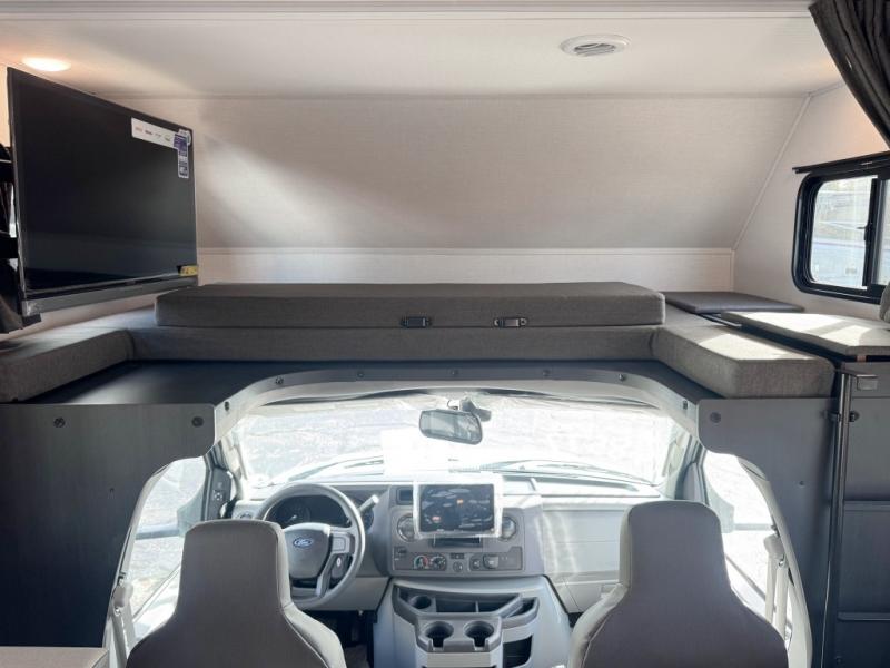Start traveling in true luxury with this motorhome! The rear private bedroom has a queen bed to lay your head at night, a closet, and wardrobes on either side of the 12V TV. It also leads into the separated bathroom which has a 24" x 36" shower and toilet across from a sink with a medicine cabinet above it. The undermount 1.3 cu. ft. convection microwave will come in handy on those nights when you don't feel like cooking and the flip-up countertop will make your meal prepping easier. You can enjoy your meals at the booth dinette and lay down on the sofa to catch up on your book. The 60" x 80" bunk over cab mat offers a comfortable sleeping space but can be switched out for the optional Trekker cap with a built-in entertainment center!