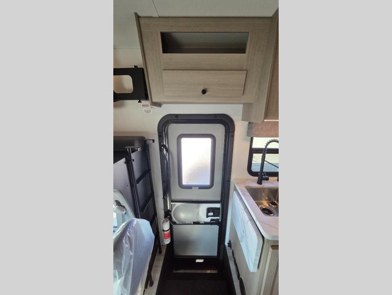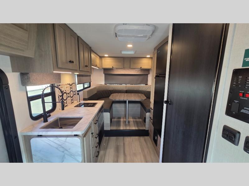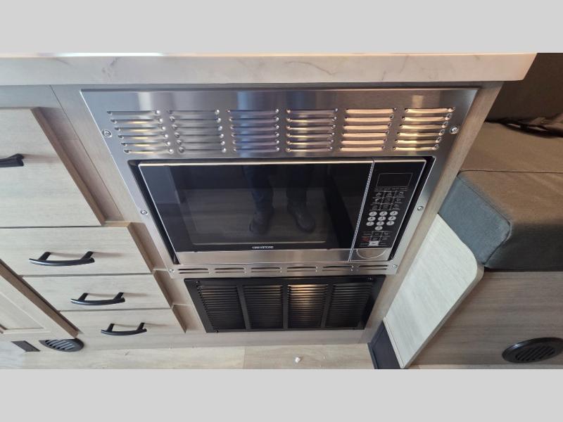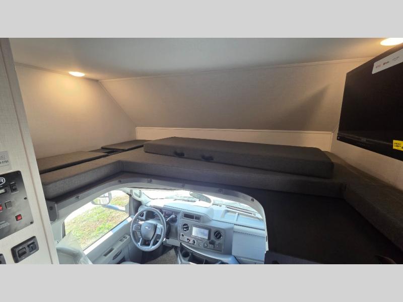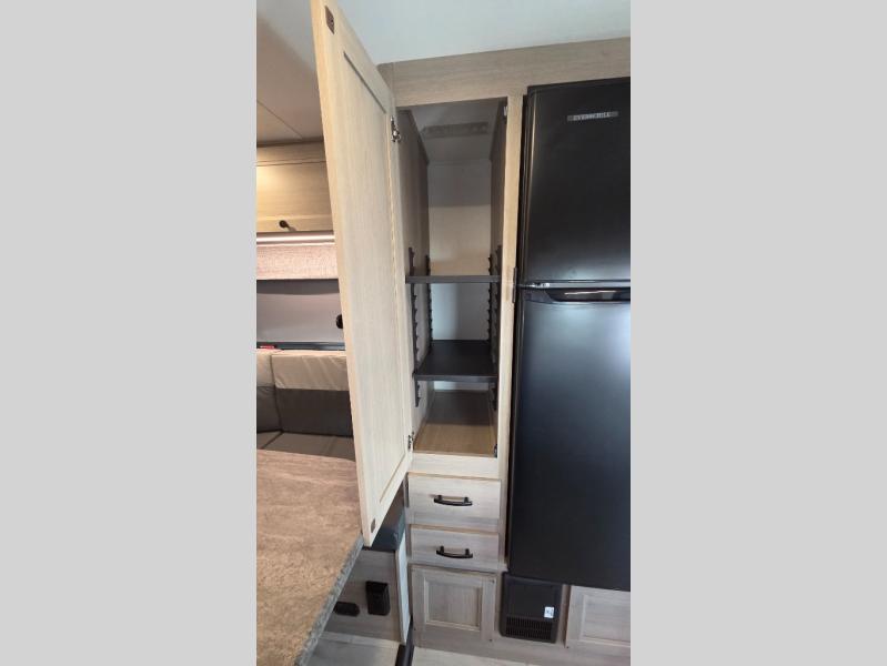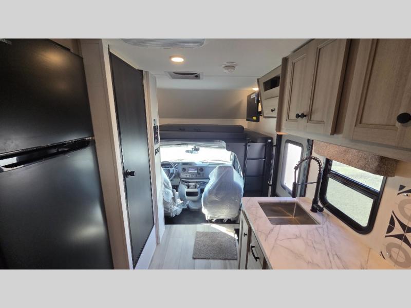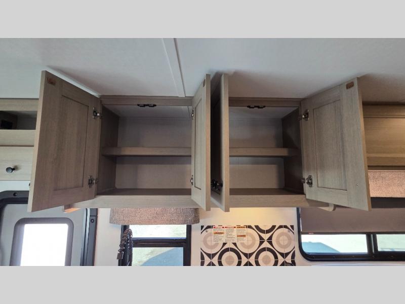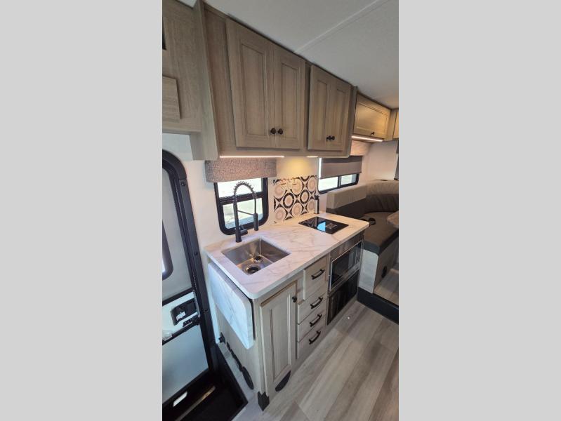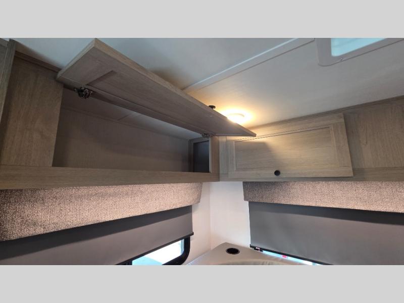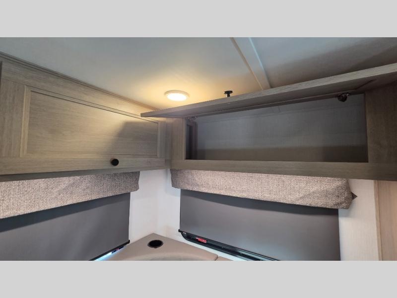 This motorhome is perfect for couples or small families. The bunk over the cab provides a cozy sleeping area, while the U-dinette offers additional sleeping space for guests or family members. The 12V TV is perfect for relaxing in the evenings or enjoying your favorite shows on the go. Plus, the wet bath is a practical and efficient space, making it easy to get ready in the morning or freshen up after a long day. Further, the kitchen is equipped with a 12V fridge, convection microwave/air fryer, and flip-up countertop, providing ample space to prepare meals and snacks. The pantry offers additional storage for your food and cooking essentials. Additionally, overhead cabinets throughout the unit provide plenty of storage for your belongings.