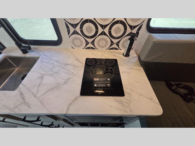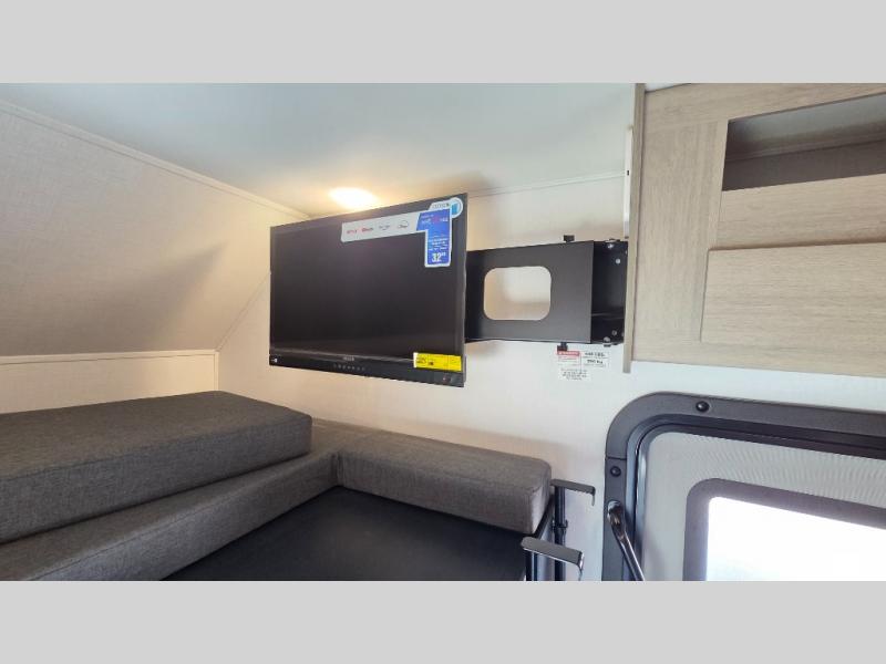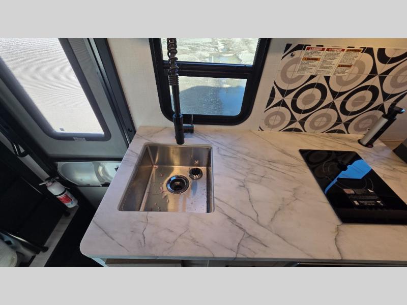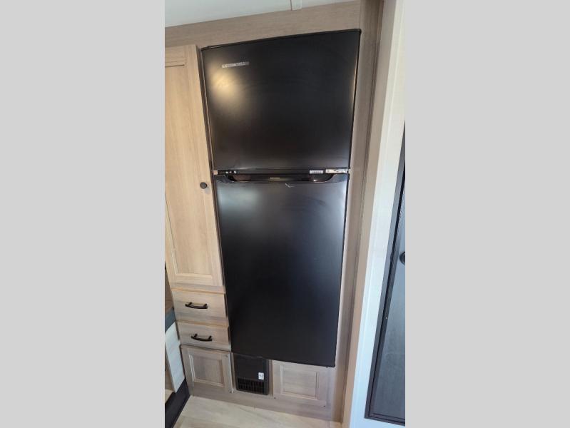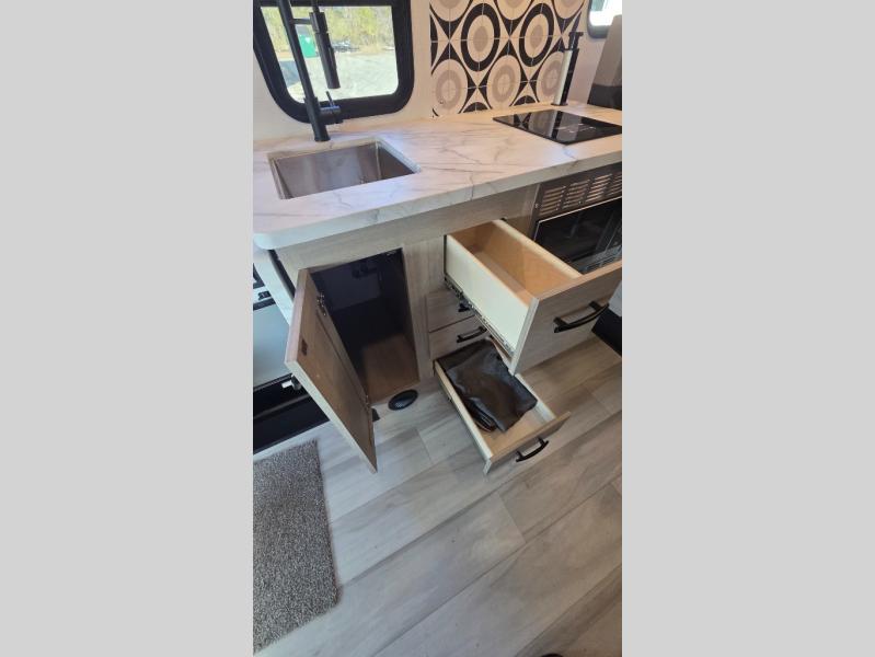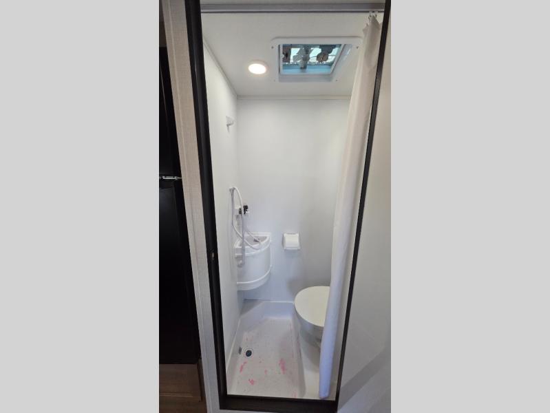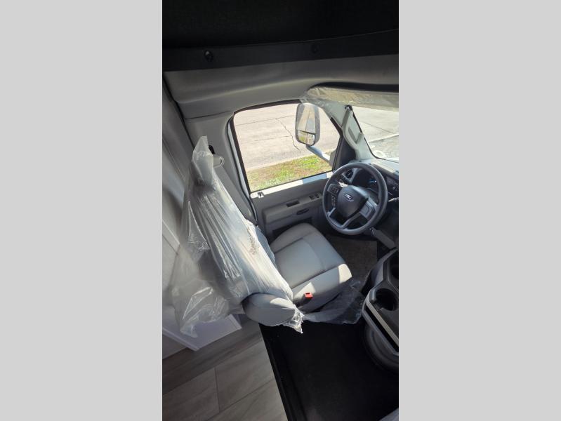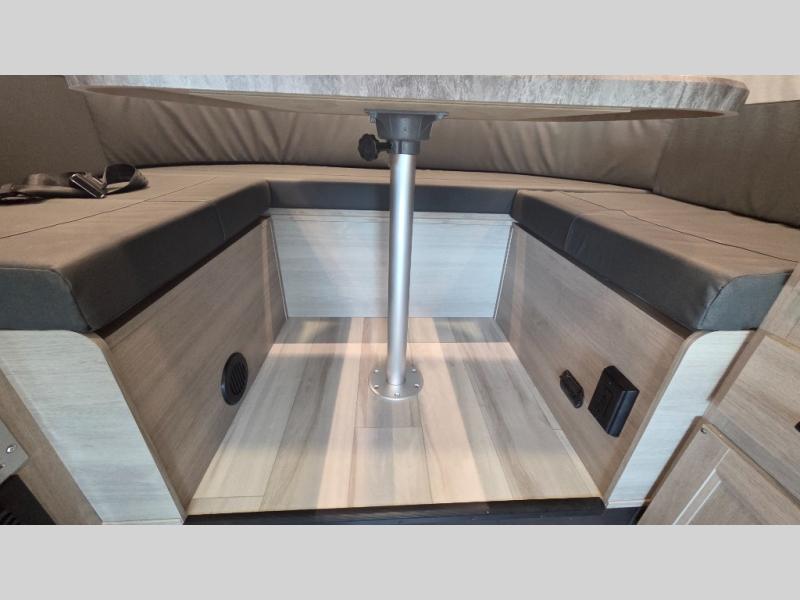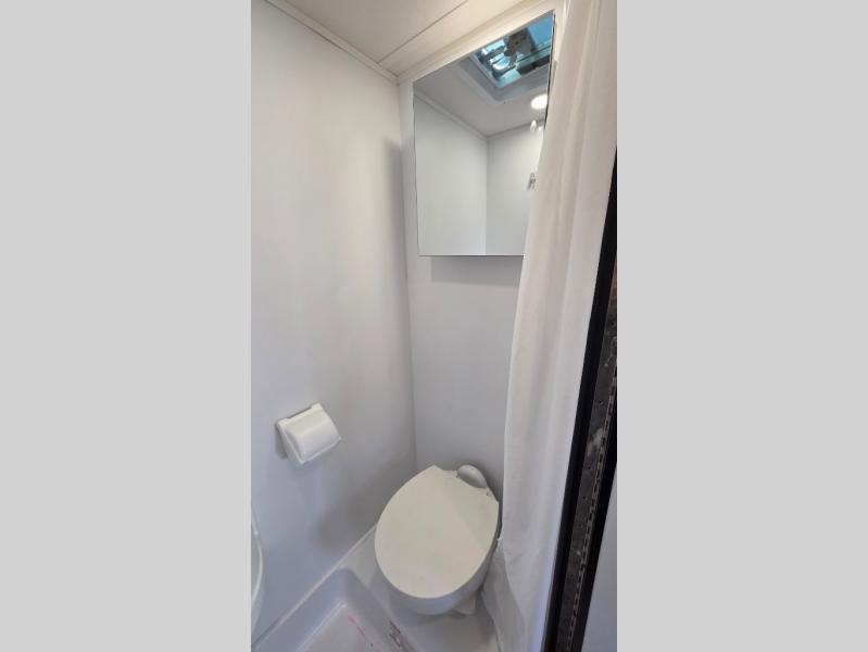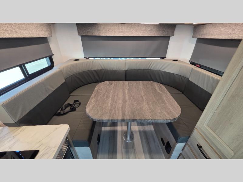 This motorhome is perfect for couples or small families. The bunk over the cab provides a cozy sleeping area, while the U-dinette offers additional sleeping space for guests or family members. The 12V TV is perfect for relaxing in the evenings or enjoying your favorite shows on the go. Plus, the wet bath is a practical and efficient space, making it easy to get ready in the morning or freshen up after a long day. Further, the kitchen is equipped with a 12V fridge, convection microwave/air fryer, and flip-up countertop, providing ample space to prepare meals and snacks. The pantry offers additional storage for your food and cooking essentials. Additionally, overhead cabinets throughout the unit provide plenty of storage for your belongings.