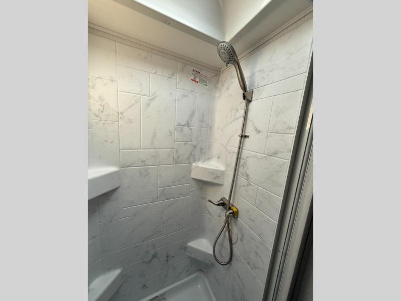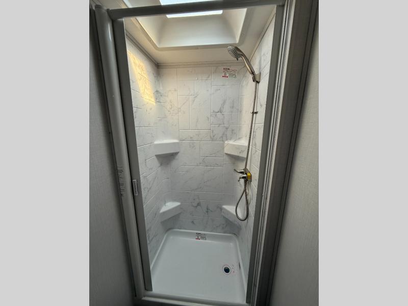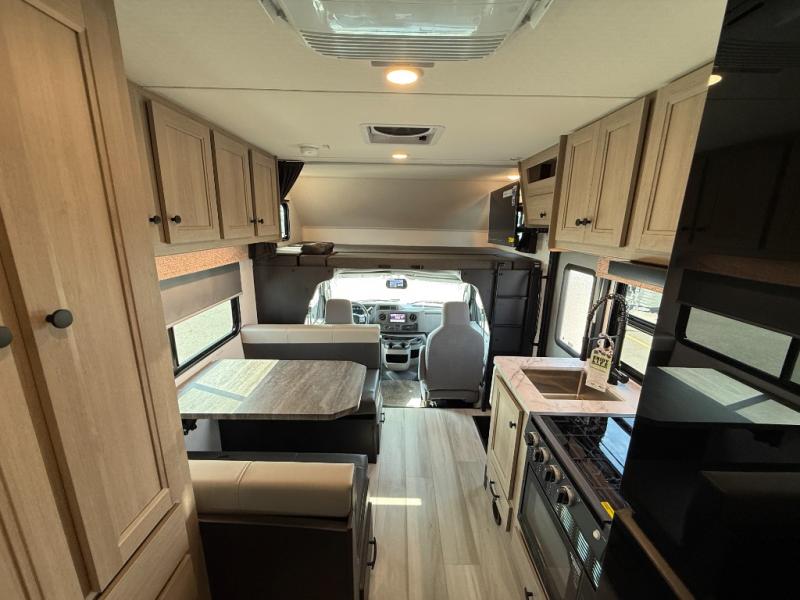 Enjoy trips near and far in this single slide out coach. The kitchen provides a 10.7 cu. ft. 12V refrigerator to store the cold items, a convection microwave and a recessed three-burner range to whip up meals. The private toilet and shower give you a place to get cleaned up, and the bathroom sink is just outside the door. This model includes a queen bed slide out with a wedge mattress, and there is a cab-over bunk for your guests. You can spend your evenings playing cards at the booth dinette, or head outdoors to relax under the 14' power awning with LED lights!