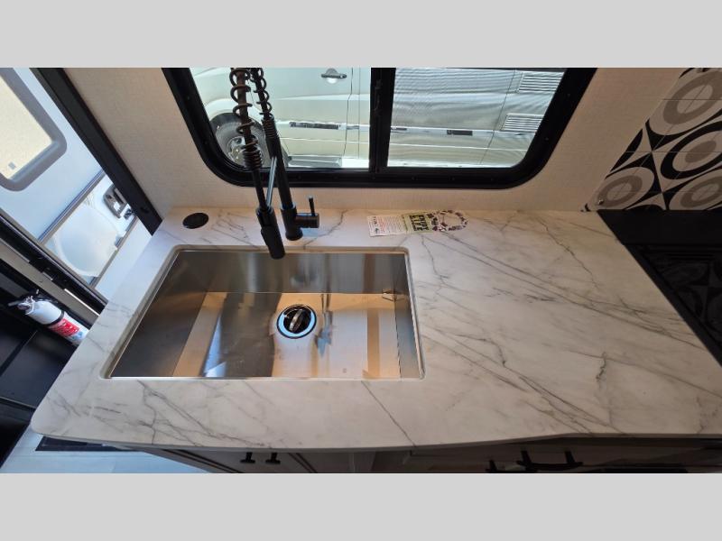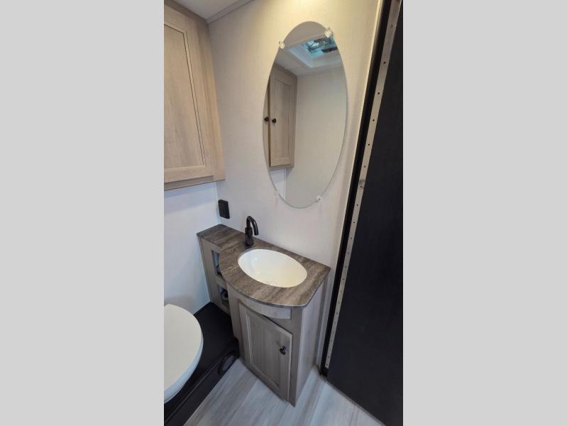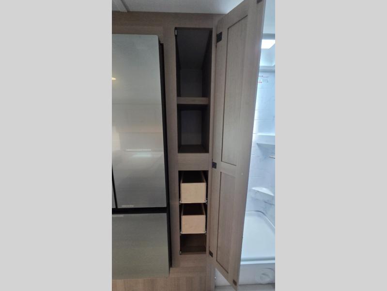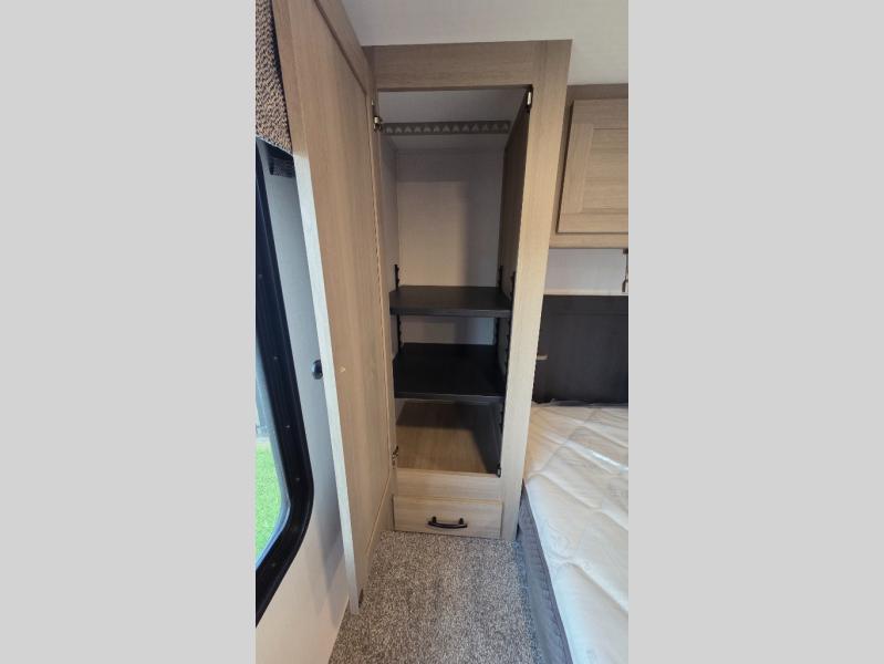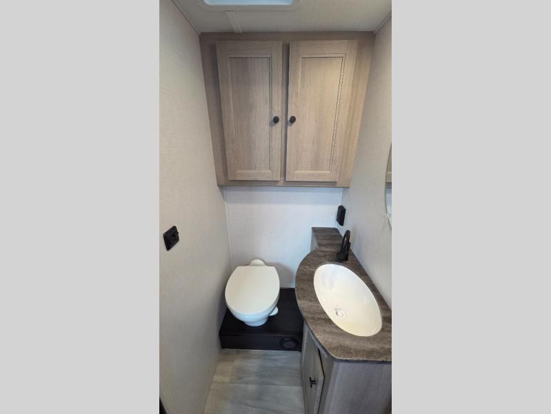 You and your favorite person will love this coach for many reasons including having your own private bedroom with a split bathroom, a walk-around queen bed, plus your own wardrobe. The split bathroom is pretty handy since one person can get ready in the private toilet and sink room while another is taking a shower. The kitchen offers a 10.7 cu. ft. 12V refrigerator, a convection microwave, a recessed three-burner range, soft touch self-closing drawer guides and a cordless 12V charging plate. You will have overhead cabinets and a pantry for storage. The slide out sofa and booth dinette offer a great place to relax and dine plus gives you more floor space. And the queen bunk over the cab will be a popular sleeping space for overnight guests.