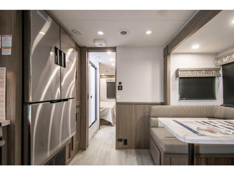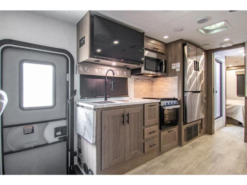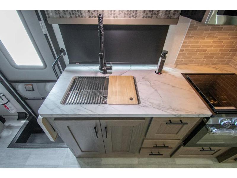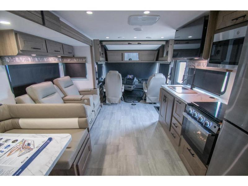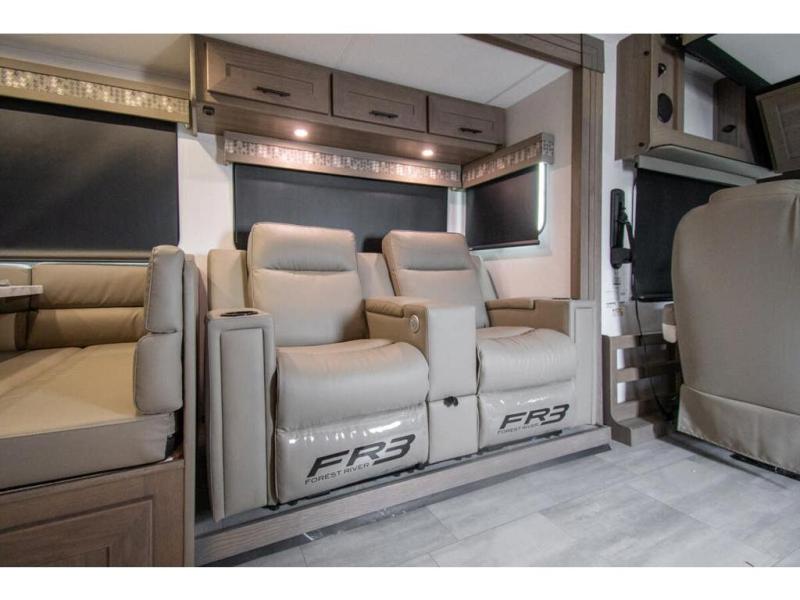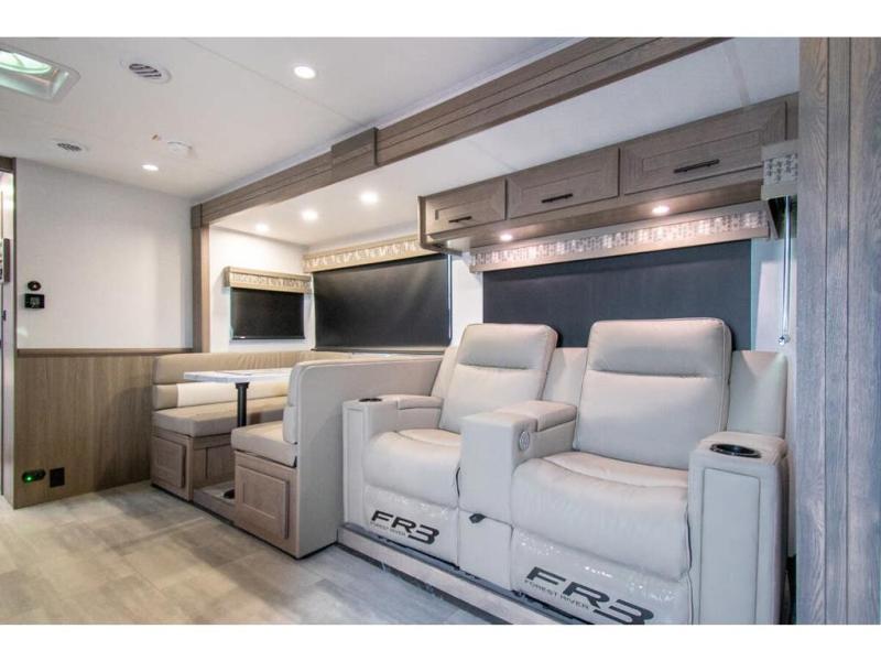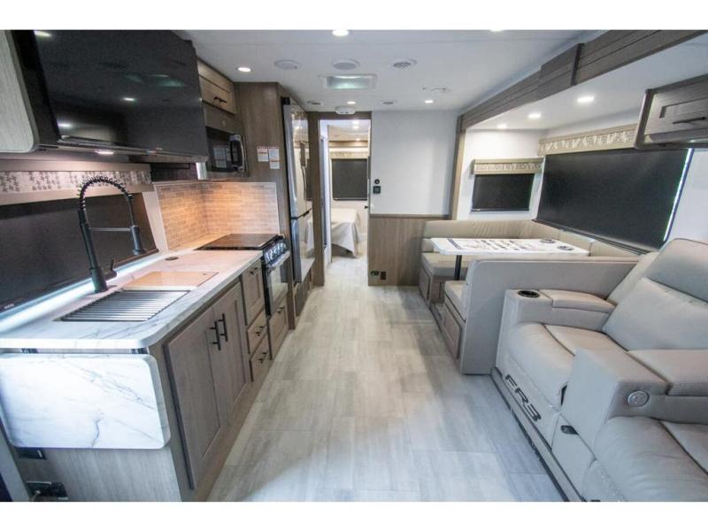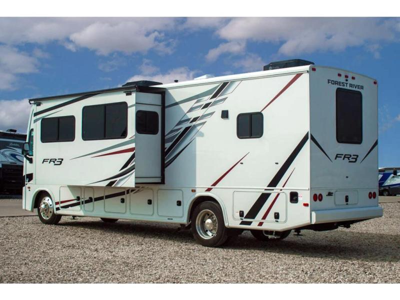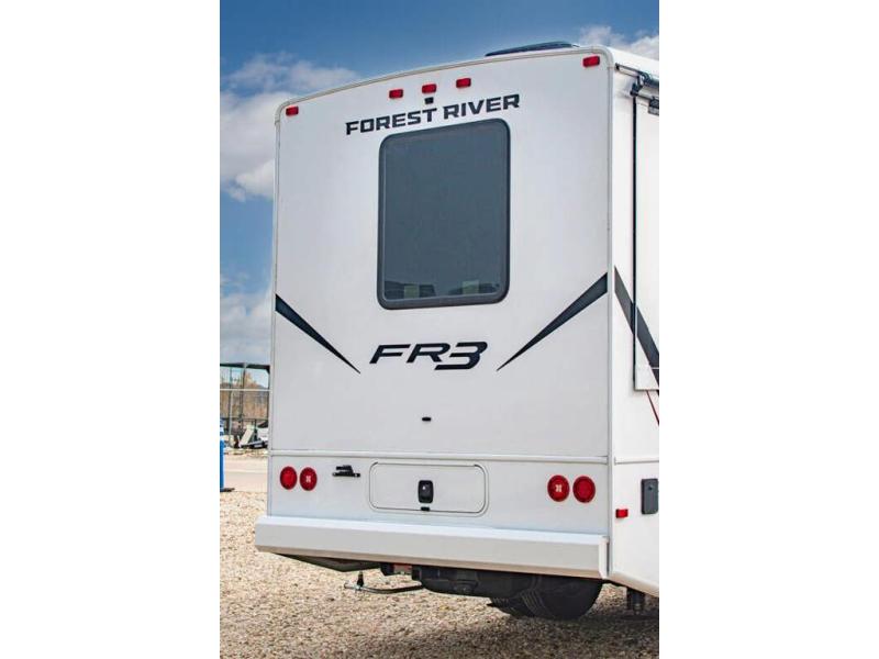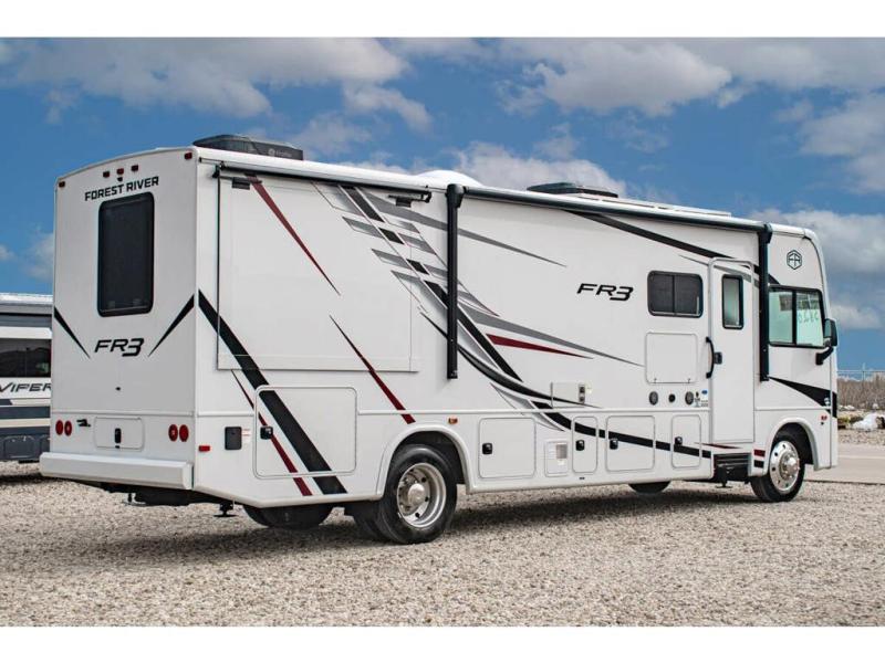 With each FR3 Class A gas motorhome by Forest River, you will find an easy-to-drive coach with a spacious interior allowing you to gather with friends and family with convenience and style found throughout! Each is built with vacuum-bonded construction, a one-piece fiberglass roof with extended rain spouts, a steel firewall and A-pillar extension, Bi-LED headlamps and lower LED fog lights, and grey Rotocast storage boxes with drains. Inside, you will enjoy black hardware, appliances, plumbing fixtures, and a glass shower door frame. You will also find a stainless steel kitchen sink with a bamboo cutting board and roll-up dryer, heavy-duty full-extension ball bearing drawer guides, dual-access dinette storage with doors, and nightstands with charging stations to keep your cellphones ready for whatever is next. Make your selection today!