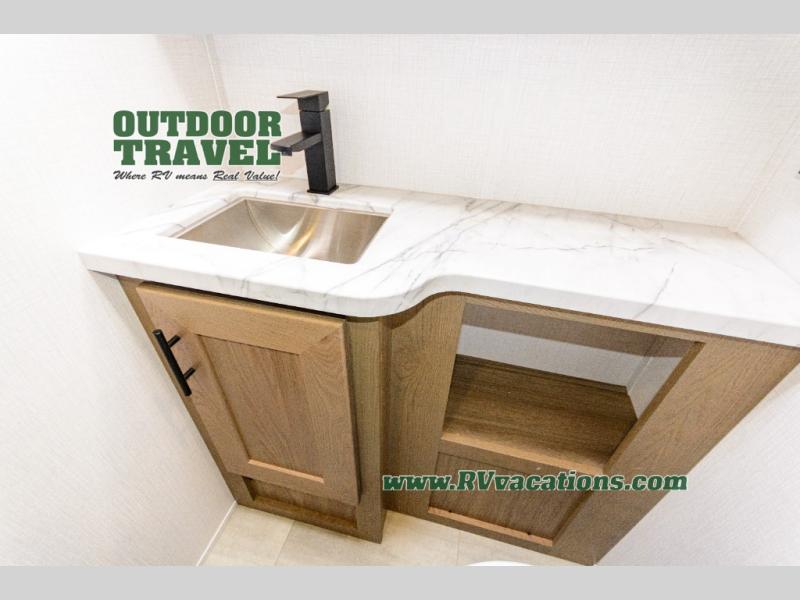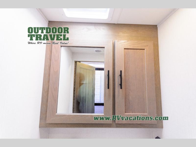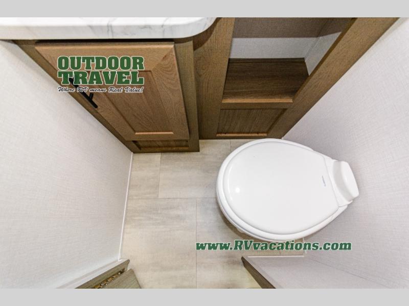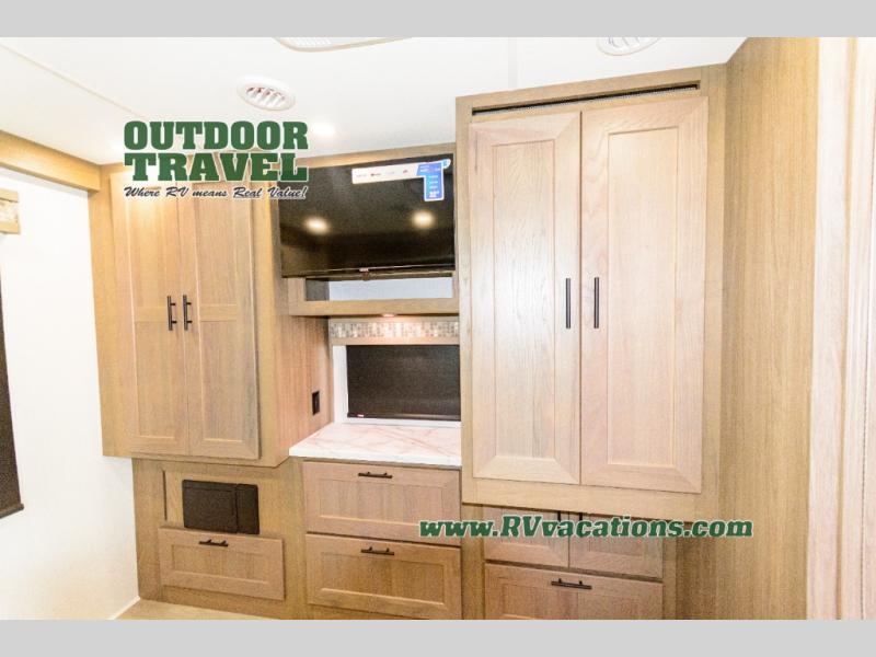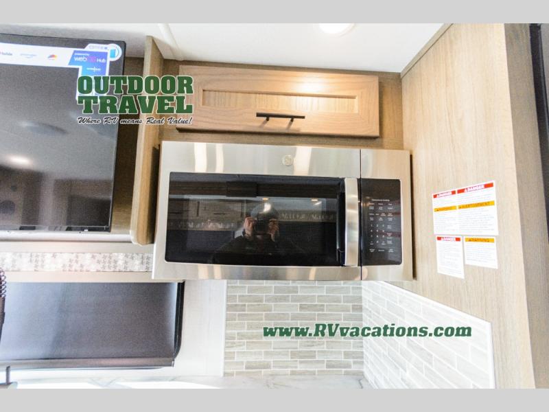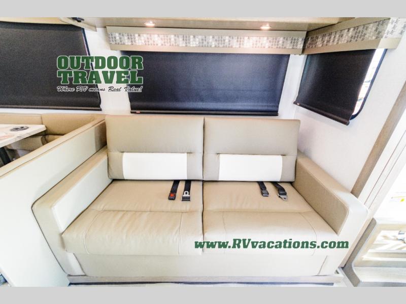 Whether you travel with your spouse, grandkids or friends, this FR3 Class A gas motorhome allows you to travel in style with plenty of additional sleeping choices from the power overhead bunk to the furniture once they are set up at night. You can dine at the wrap-around booth dinette, relax on the hide-a-bed sofa, and make full meals in the kitchen which also includes a residential microwave and countertop extension. The separated bathroom allows someone to take a shower while another freshens up with the private sink and toilet, or maybe you decide to close this area off within the bedroom. Every night you can rest nice and snug while watching the 32" LED 12V TV in the bedroom, and maybe you decided to add the washer/dryer option to keep everything clean while on the road.